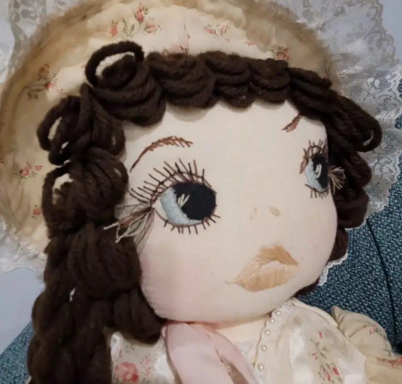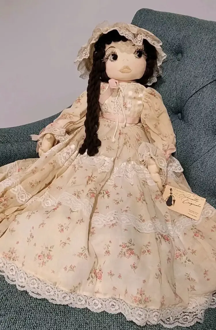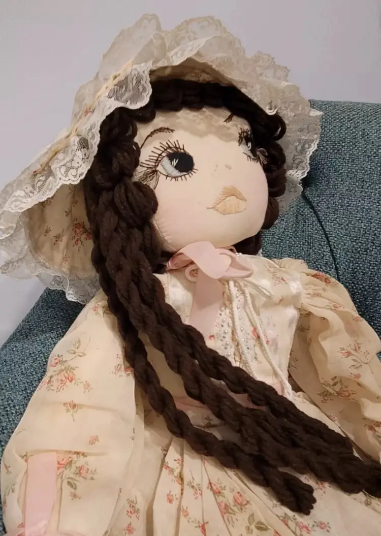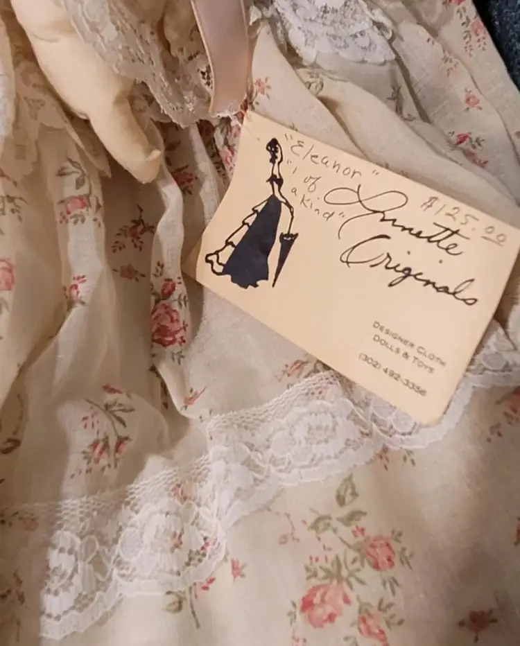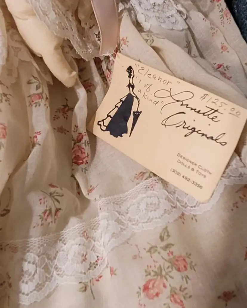 Introducing a one-of-a-kind handmade doll named "ELEANOR" by Annette Originals. I acquired her from a woman whose mother was Annette. Her mother used the womans prom gown to make eleanor's dress. If I had to guess, I would say she was made between forty and fifty years ago. Her dress does show sunday'scoloration from age.But she is truly stunning! This unique doll is perfect for collectors and enthusiasts alike, with its intricate design and attention to detail.