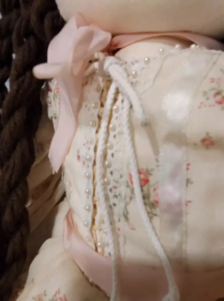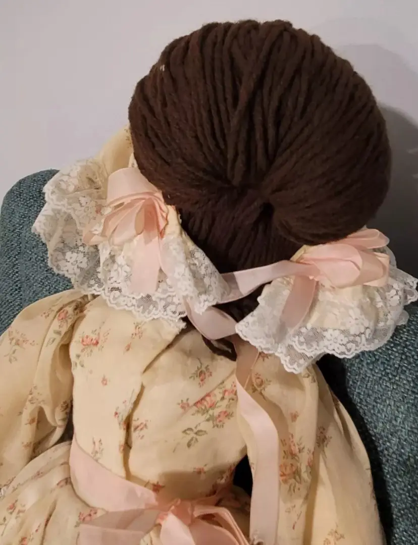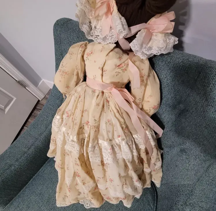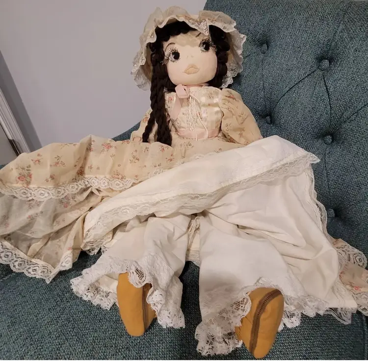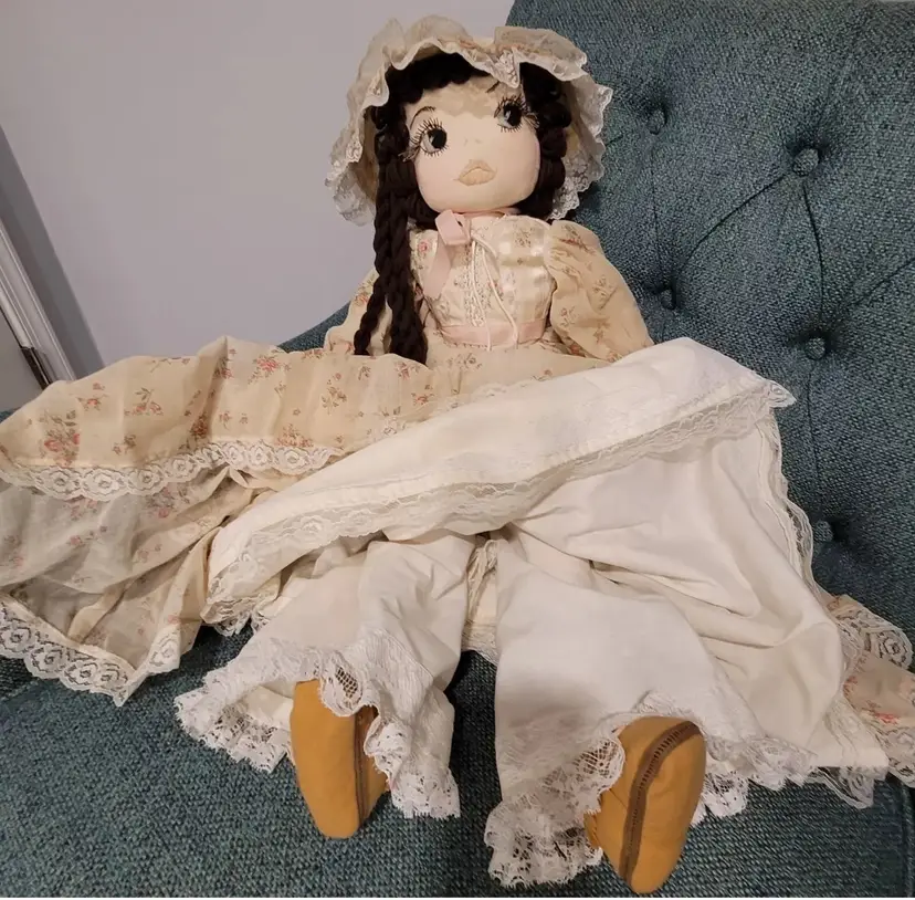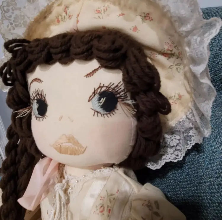 Introducing a one-of-a-kind handmade doll named "ELEANOR" by Annette Originals. I acquired her from a woman whose mother was Annette. Her mother used the womans prom gown to make eleanor's dress. If I had to guess, I would say she was made between forty and fifty years ago. Her dress does show sunday'scoloration from age.But she is truly stunning! This unique doll is perfect for collectors and enthusiasts alike, with its intricate design and attention to detail.