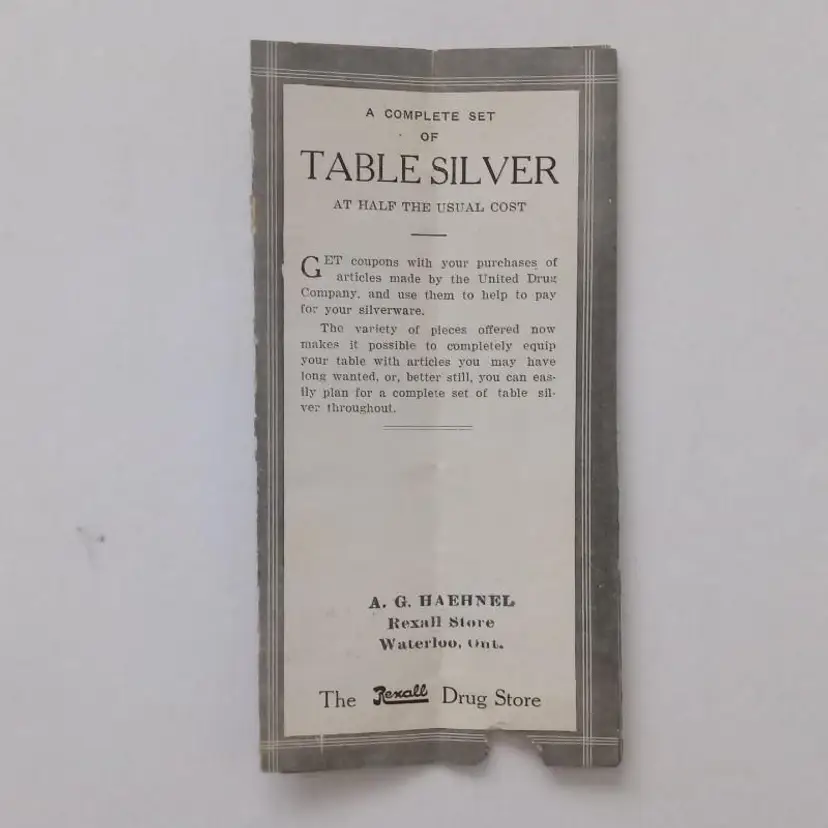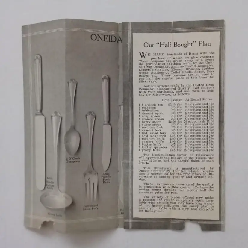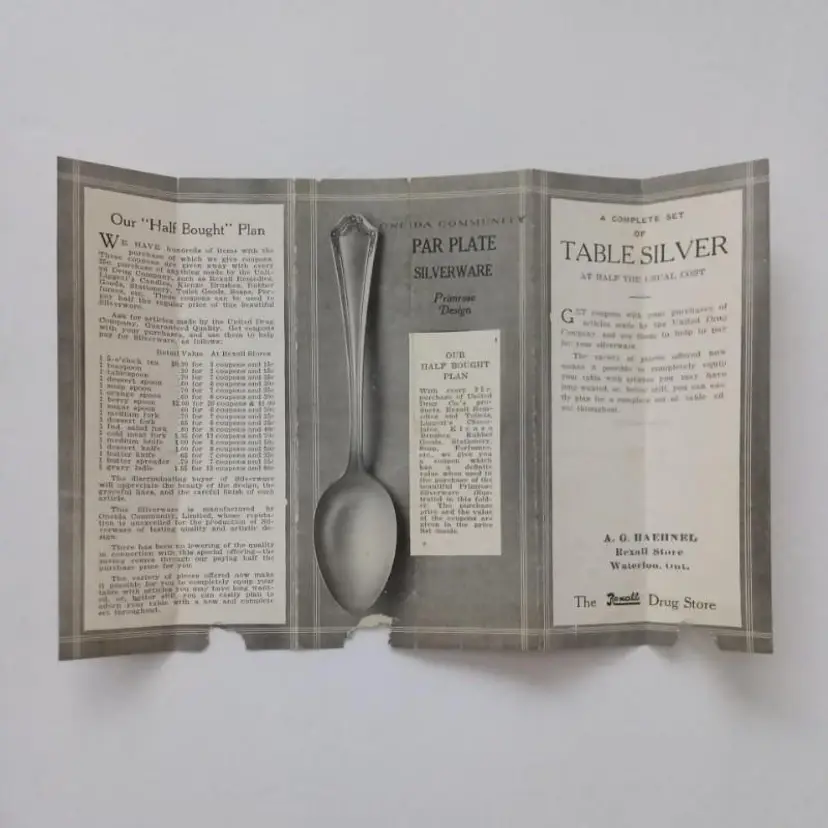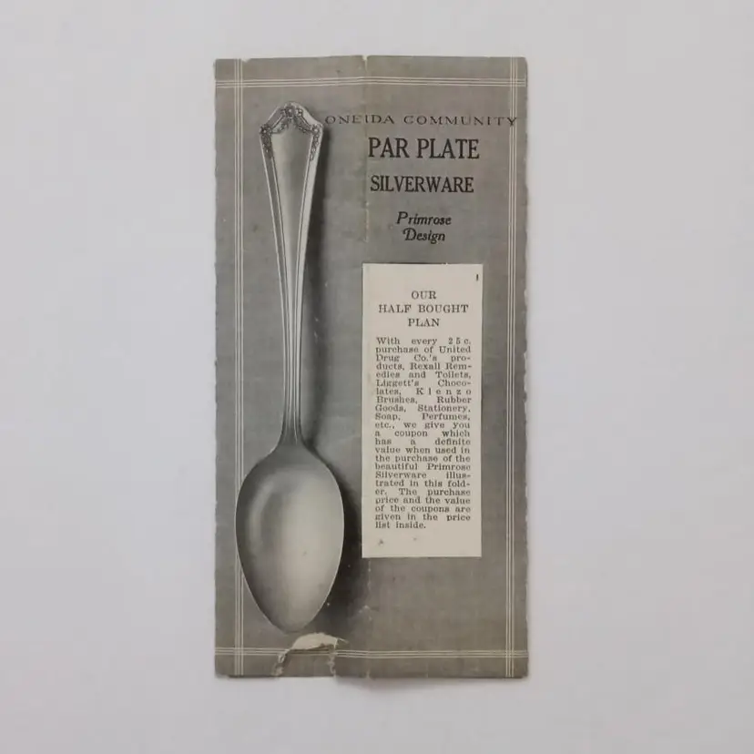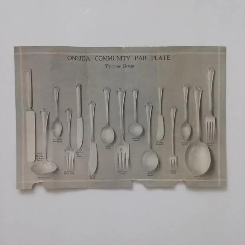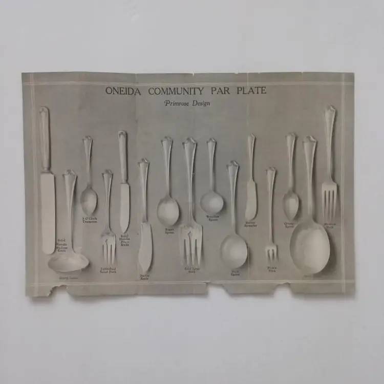 Explore the elegance of vintage flatware with this Oneida Community Par Plate advertisement featuring the Primrose design. This piece showcases a variety of utensils, each with intricate detailing, reflecting the timeless style of Oneida craftsmanship. Perfect for collectors of vintage kitchenware or those interested in historical advertisements.
