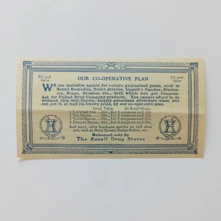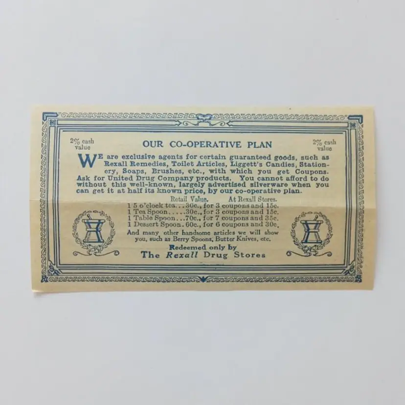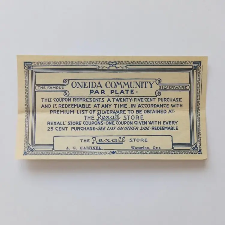 Step back in time with this vintage Oneida Vintage Oneida Community Par Plate Silverware coupon from Haehnel Rexall Store in Waterloo, Ontario. This coupon measures 4.5 x 2.5 inches and dates back to 1906-1949. A unique addition to any collection of table silverware advertising, this item is a rare find from a bygone era. Perfect for silverware enthusiasts and antique collectors alike, this piece showcases the craftsmanship and history of United Drug Company during the early to mid-20th century.