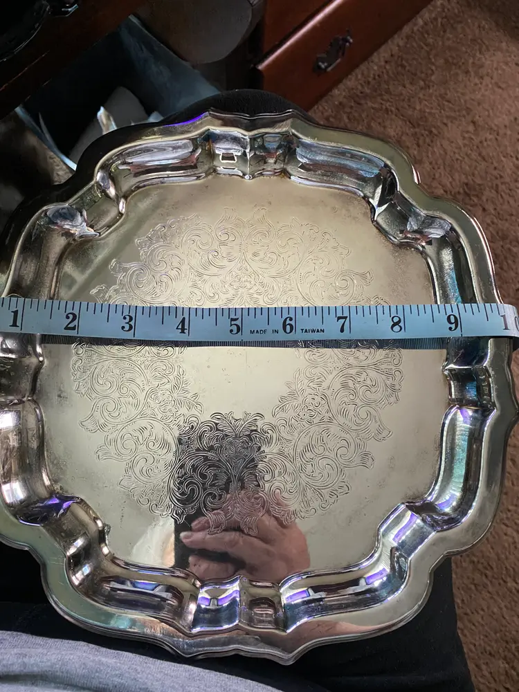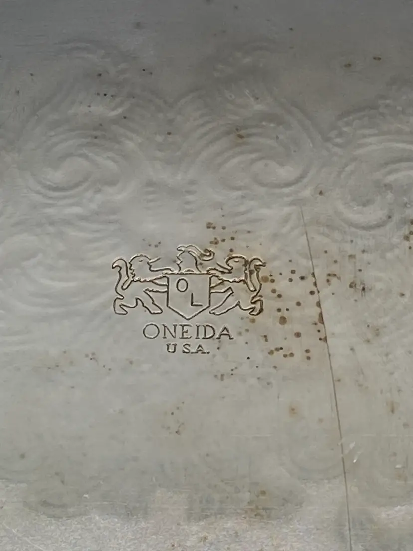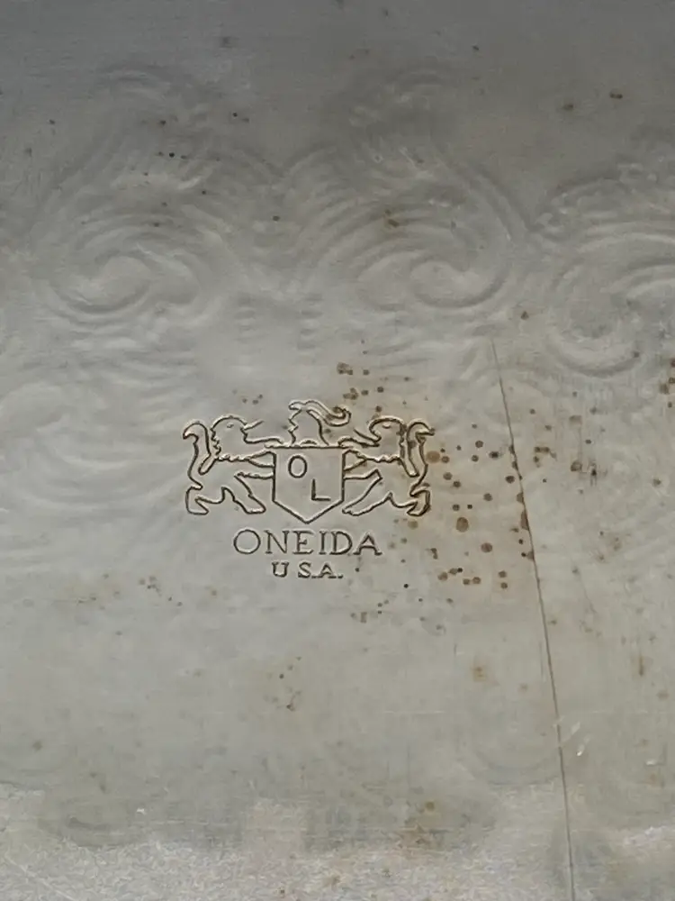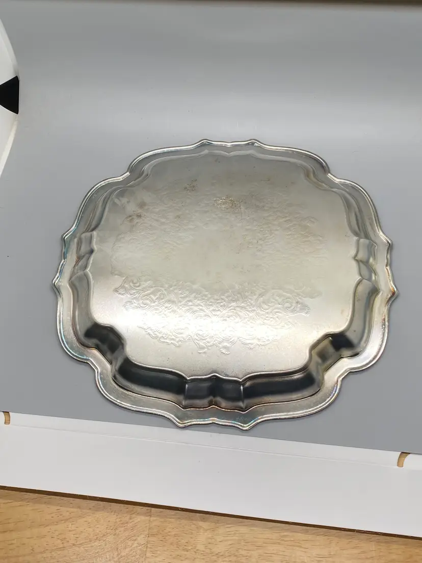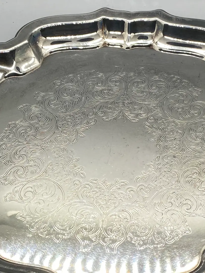 Vintage Oneida Silver Square Scallop edge 10" serving tray engraved fancy scroll pattern Stamped on back good pre-owned condition