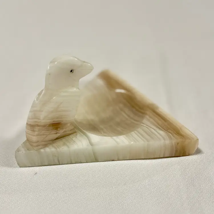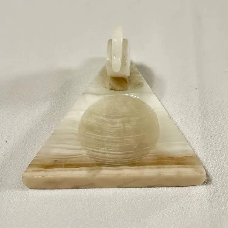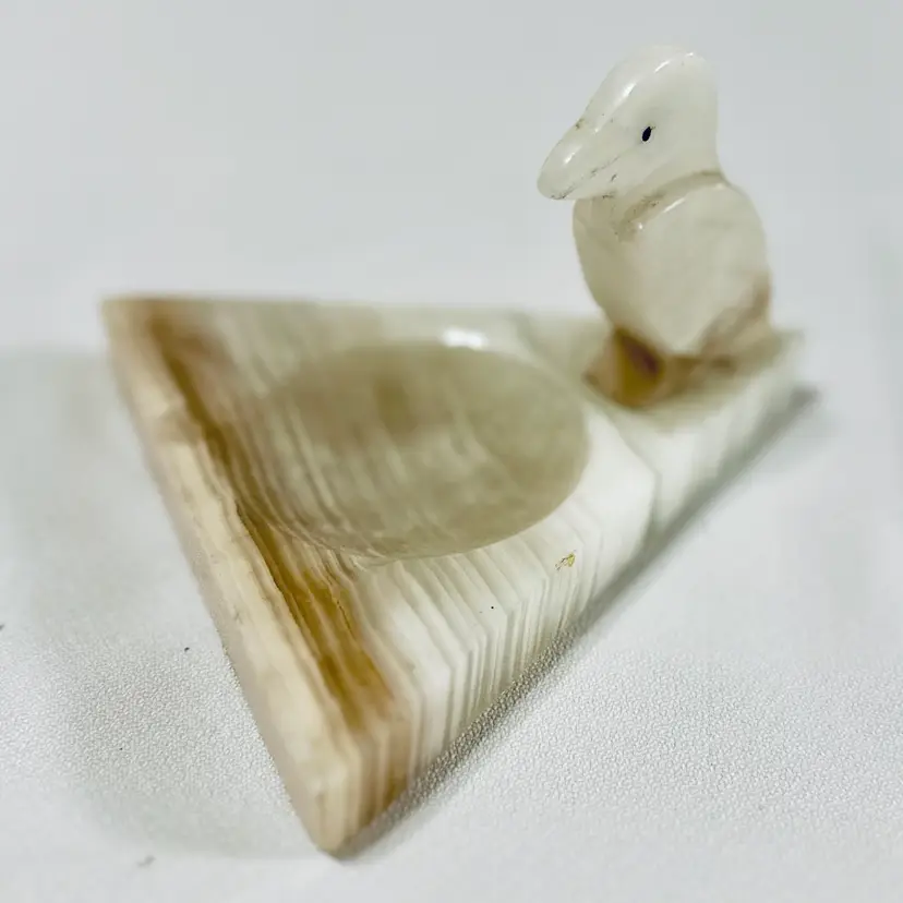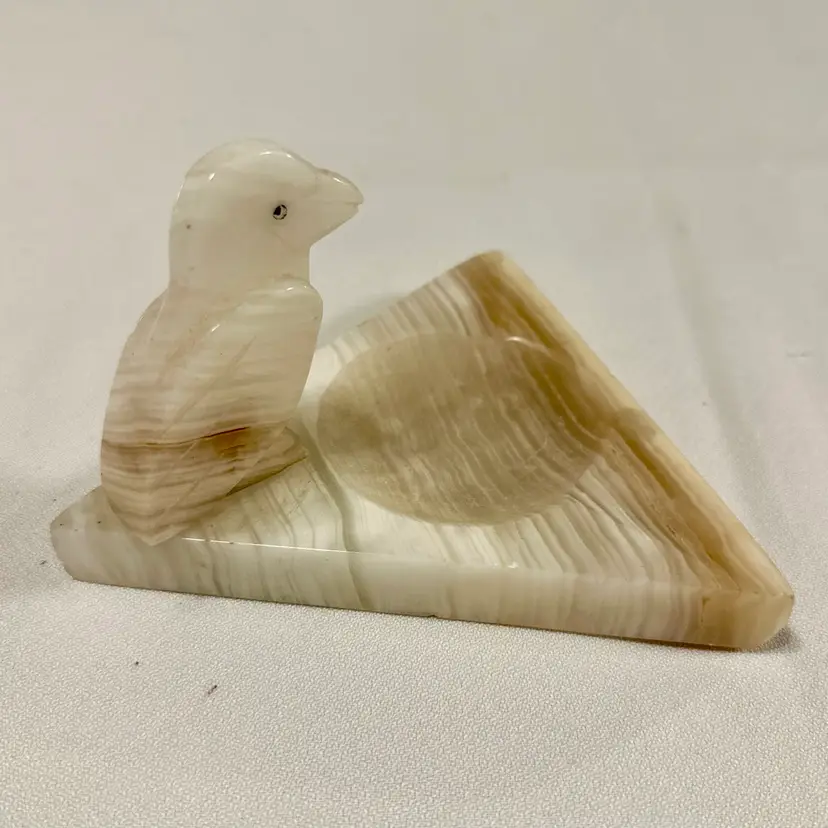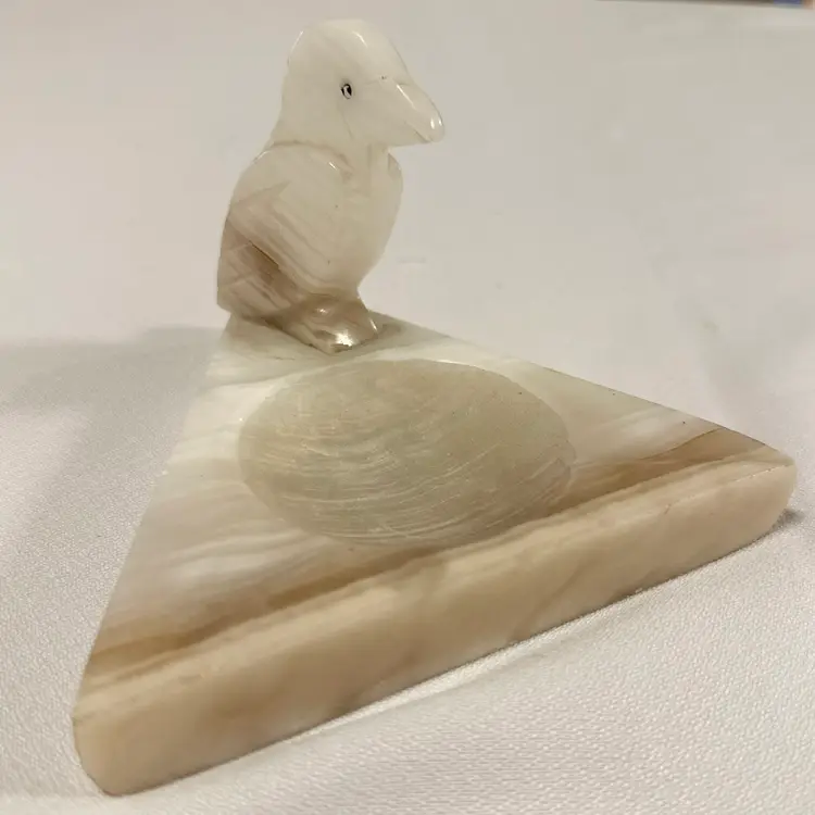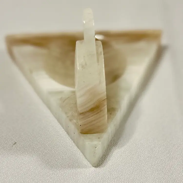 This listing is for this rare ashtray made of onyx. It is hand carved. The base is a triangle and measures 5.75” every side. By 3.75” tall.