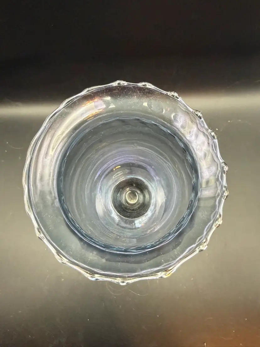 This particular style of vase, with its footed pedestal and ruffled rim, is reminiscent of designs popular during the Art Nouveau and Art Deco periods, though similar styles continued to be produced well into the mid-20th century.