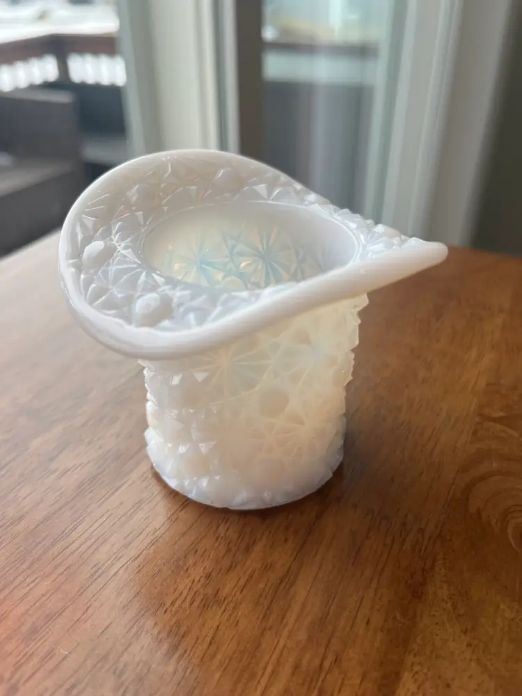 Opalescent glass, a type of milk glass, gained significant popularity in the late 19th and early 20th centuries. It is characterized by its milky white appearance with streaks or patches of translucent, often bluish or opalescent, areas. This effect is achieved by adding bone ash or feldspar to the glass mixture, which creates a cloudy, opaque look when cooled slowly, but becomes more transparent when cooled rapidly.