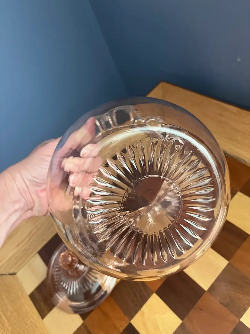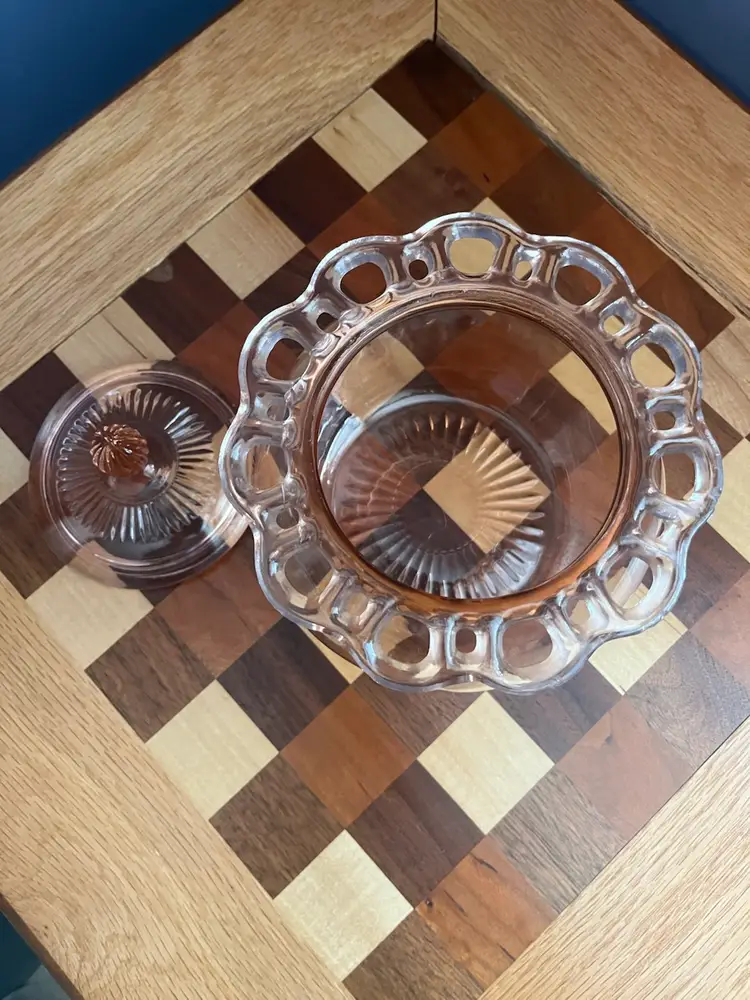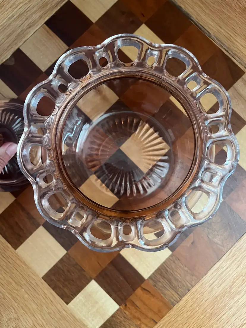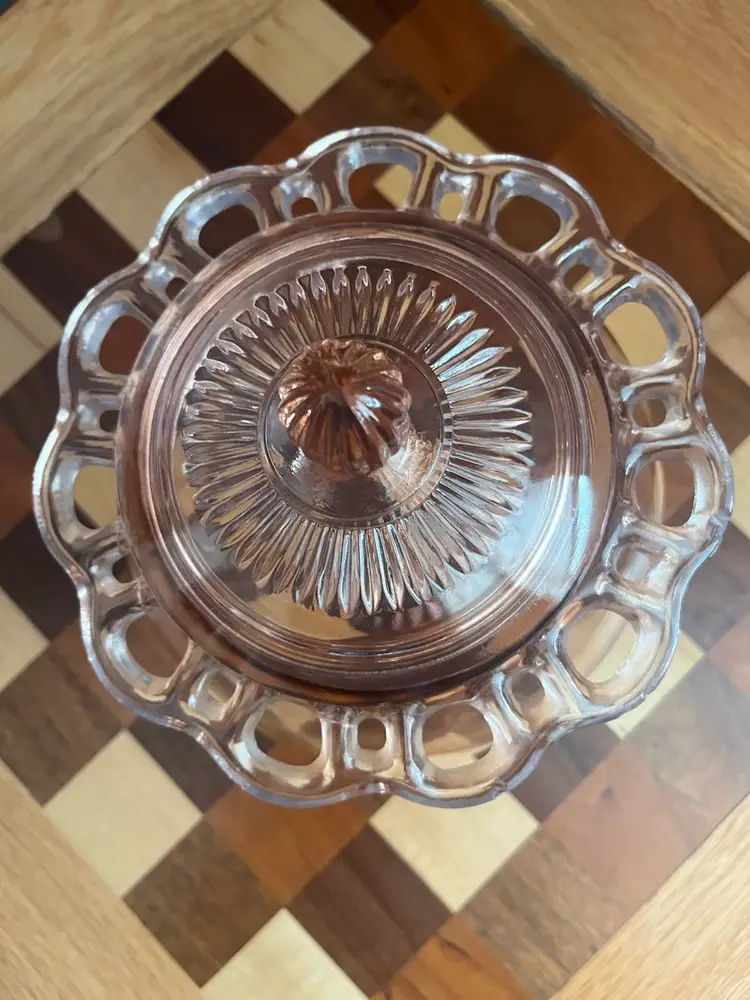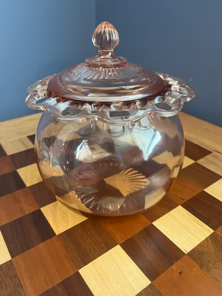 Vintage lace edge, old colony, glass cookie jar with lid, pink depression, glass, 5 inch tall (1935-1938)