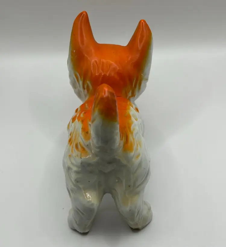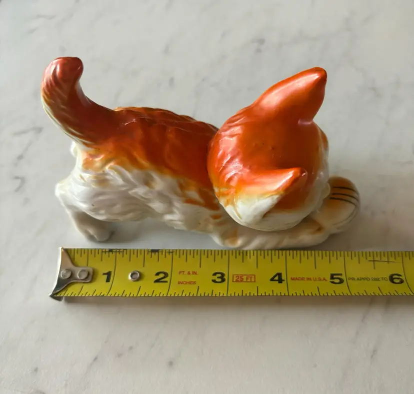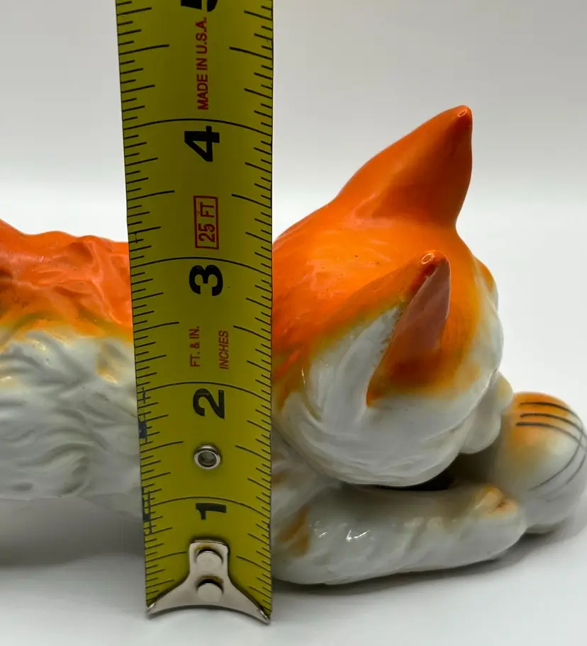 The cat is 5 inches long and 3.5 inches tall. It is in good vintage condition with no chips or cracks. There is some light wear to the orange paint due to age.