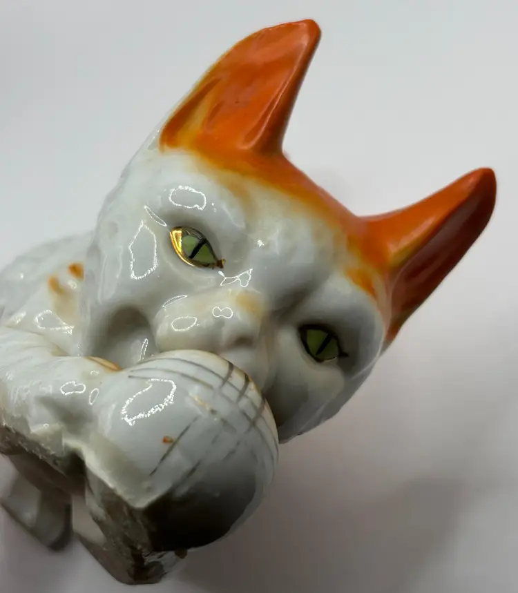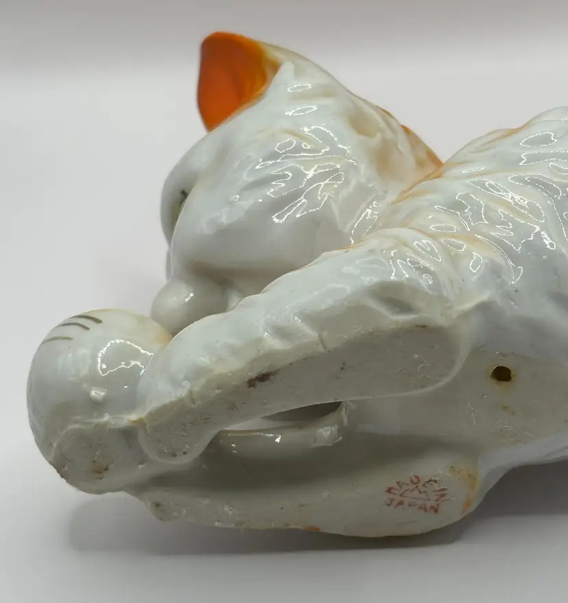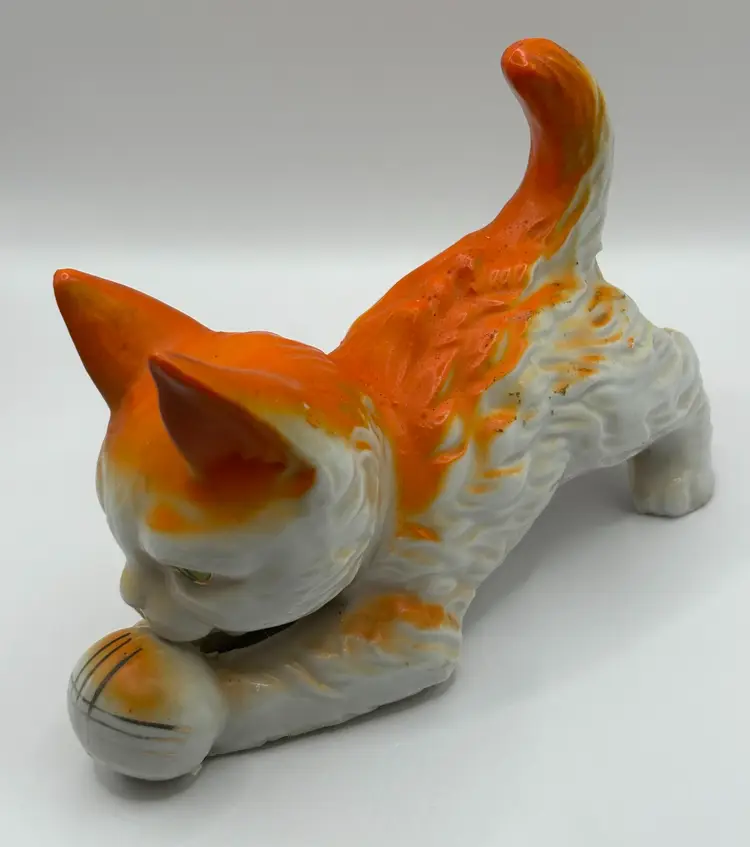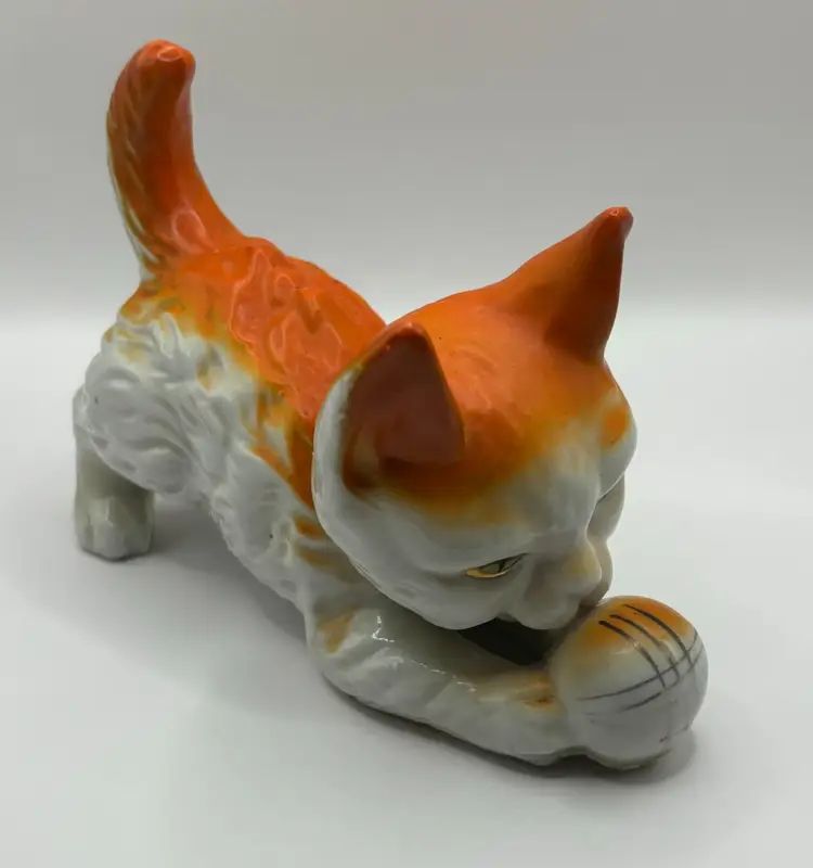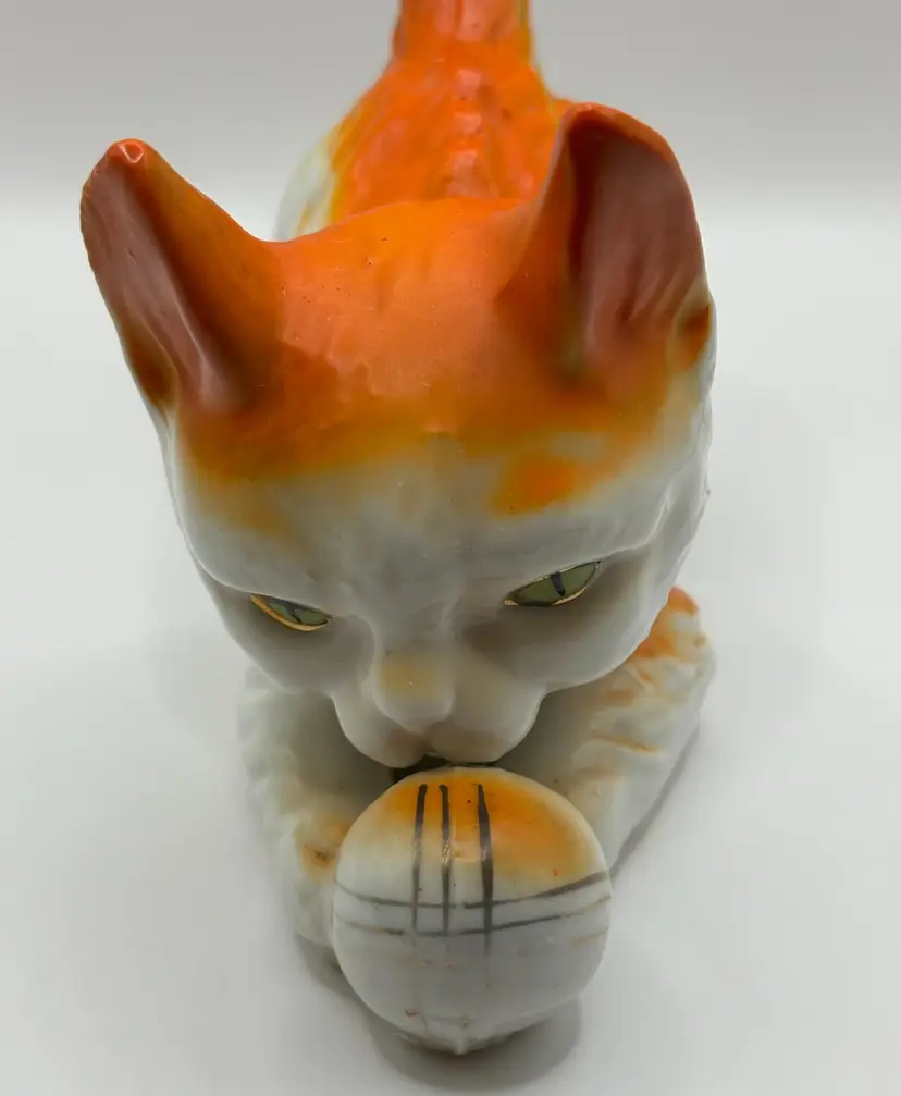 Adorable vintage orange and white cat figurine. He is bent down playing with a ball and has the prettiest green eyes with gold accents. The ball also has gold accents. Marked "Made in Japan" on the bottom. A great colorful piece for any cat lover!