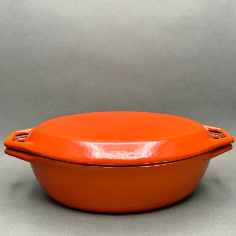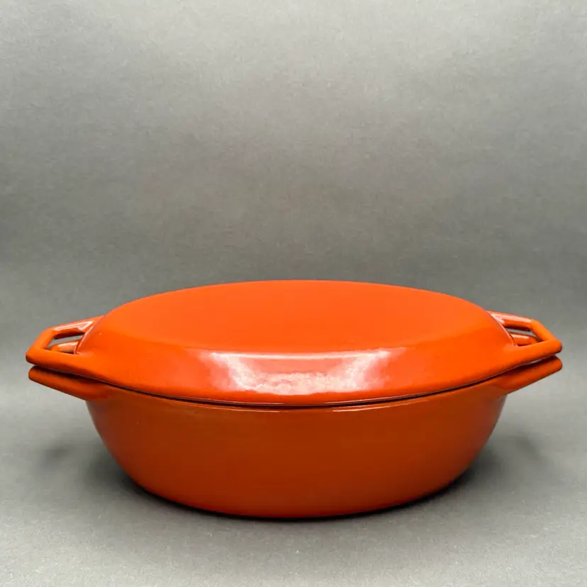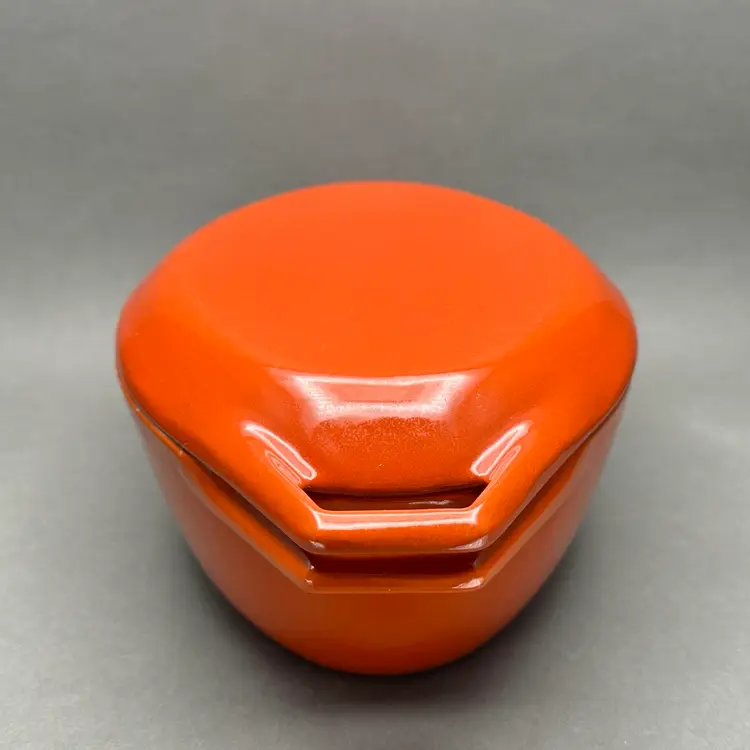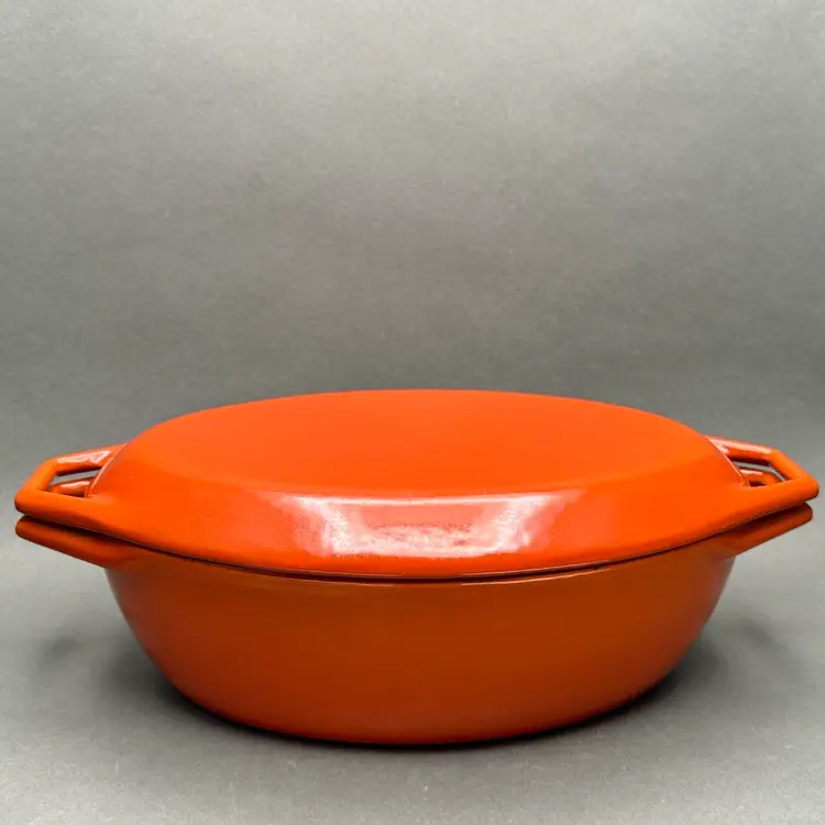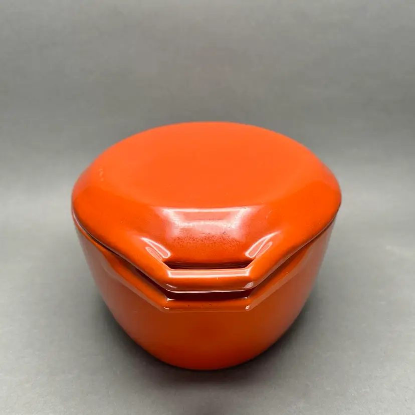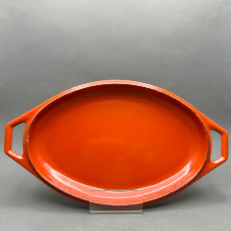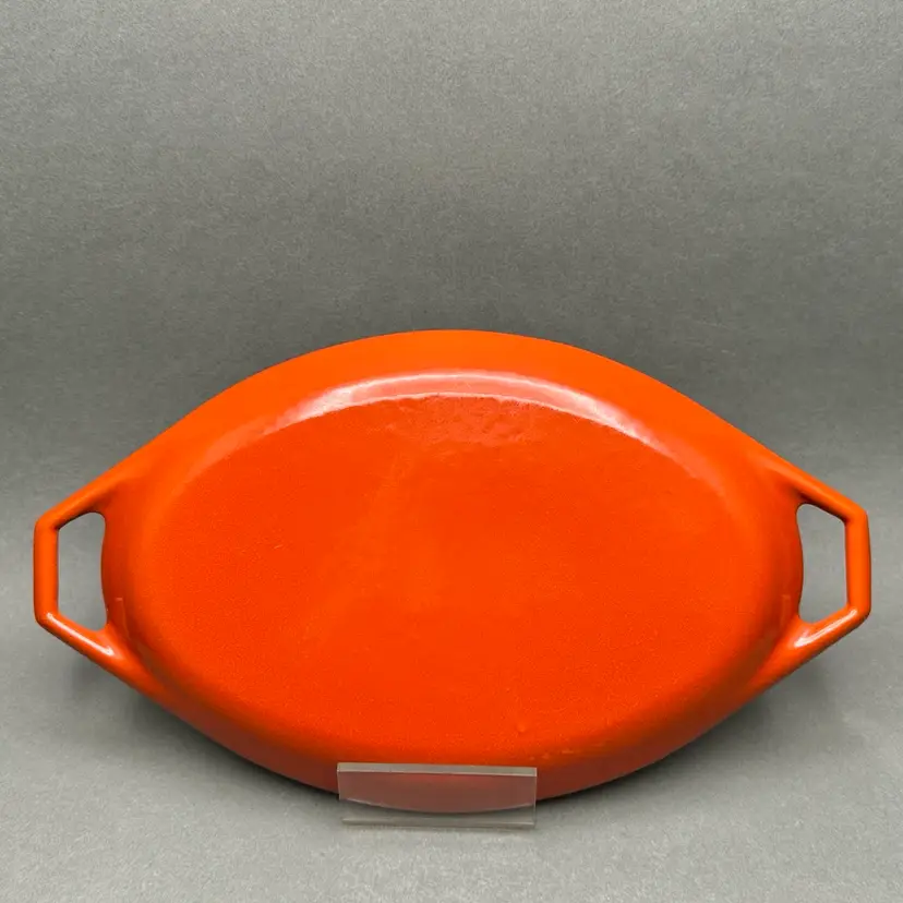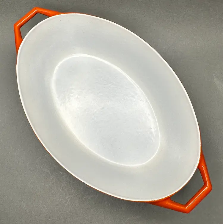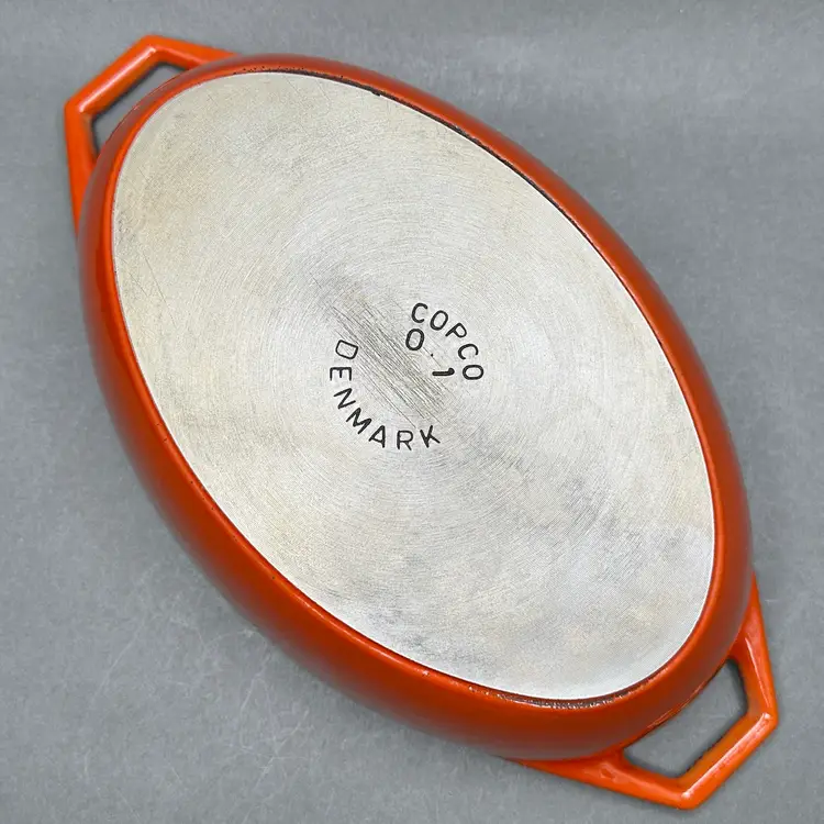 • Maker: Copco (Denmark) • Designer: Michael Lax • Model: O-1 (Oval) • Material: Enameled Cast Iron • Era: Mid-Century Modern / 1960s • Features: Classic Danish Modern design with vibrant orange enamel, white interior, and integrated handles • Measurements: 13 1/2" x 7 3/4" x 4 1/4" • Condition: It is in very good vintage condition with no visible chips, cracks or scratches