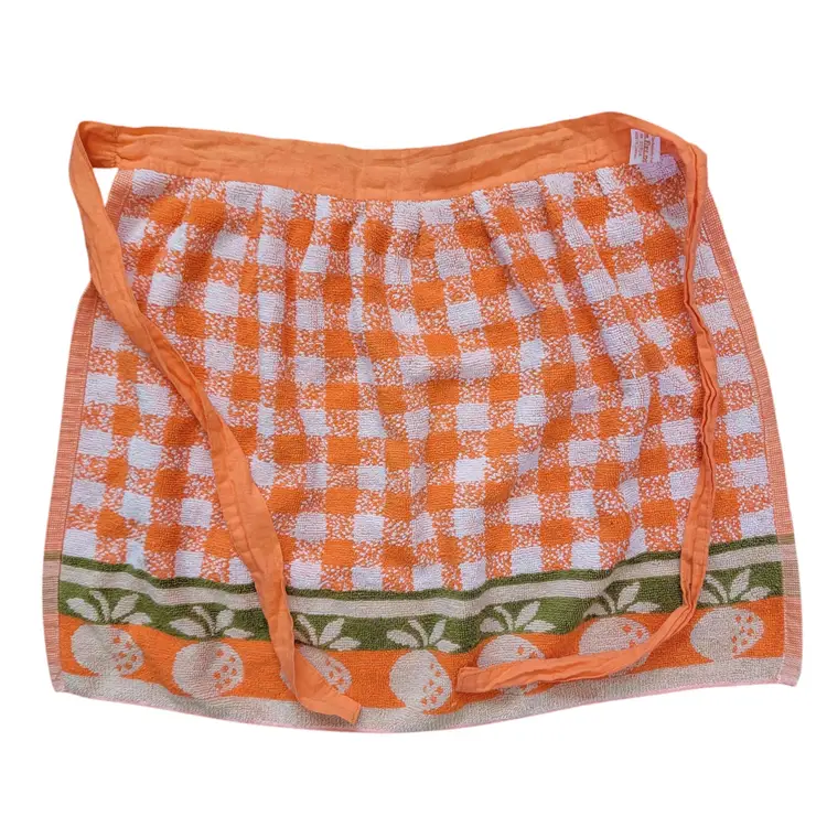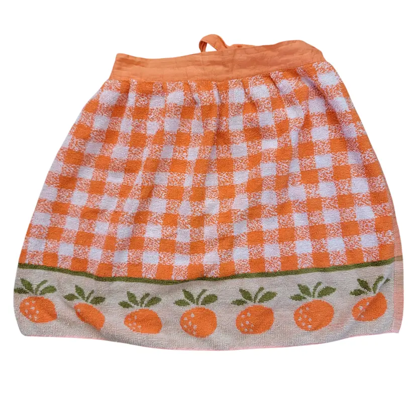 Add a pop of retro charm to your kitchen with this vintage orange gingham towel apron Featuring a delightful fruit border, it's perfect for adding a nostalgic touch to your decor. Great for collectors or everyday use!