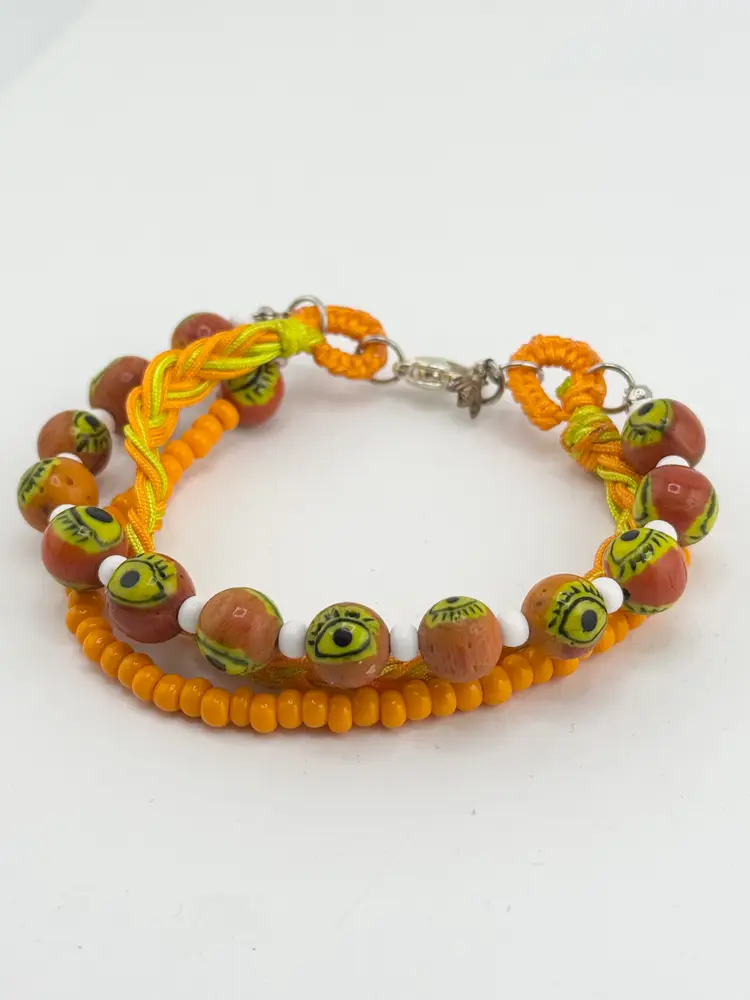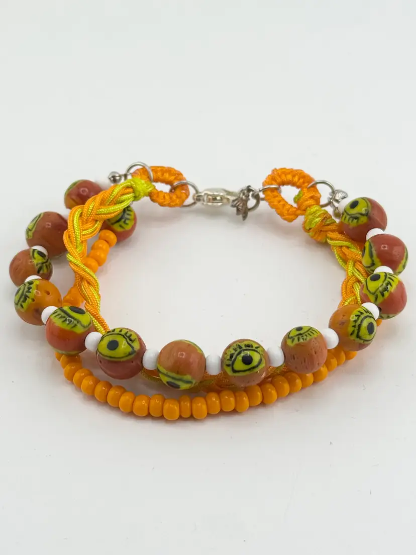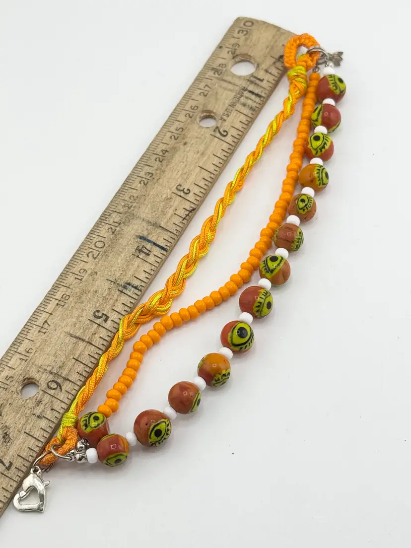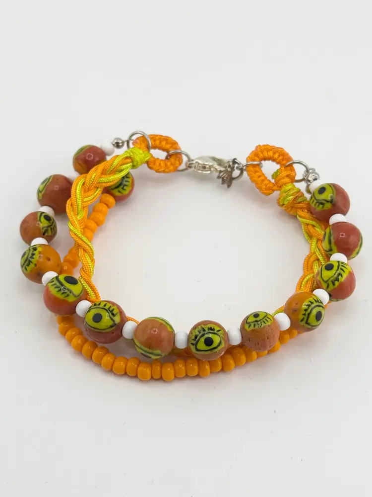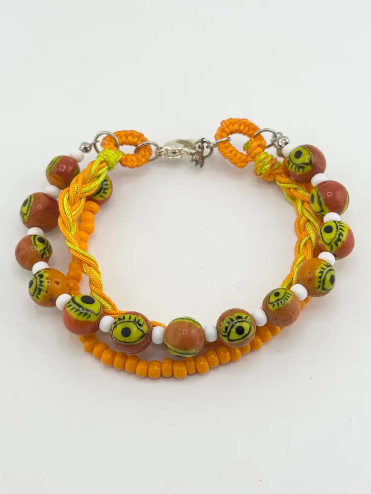 Vintage orange glass evil eye beaded three strand braided bracelet. Three strands, one beaded with glass evil eyes, one glass seed bead strand and braided strand. Super cute evil eye bracelet. HA54MN.