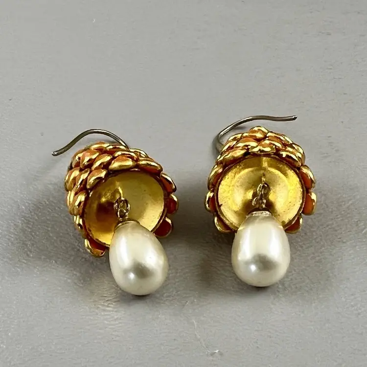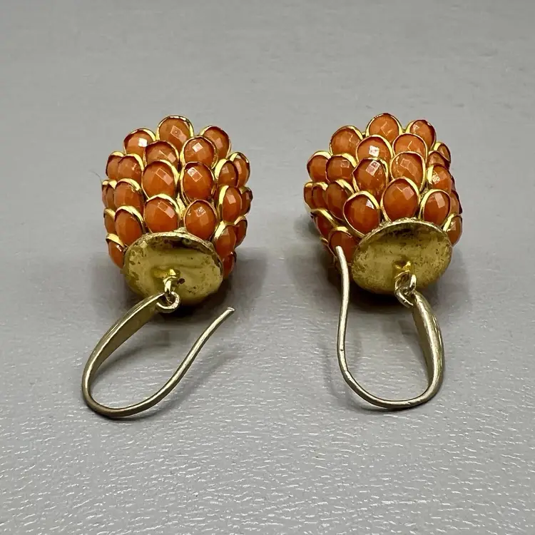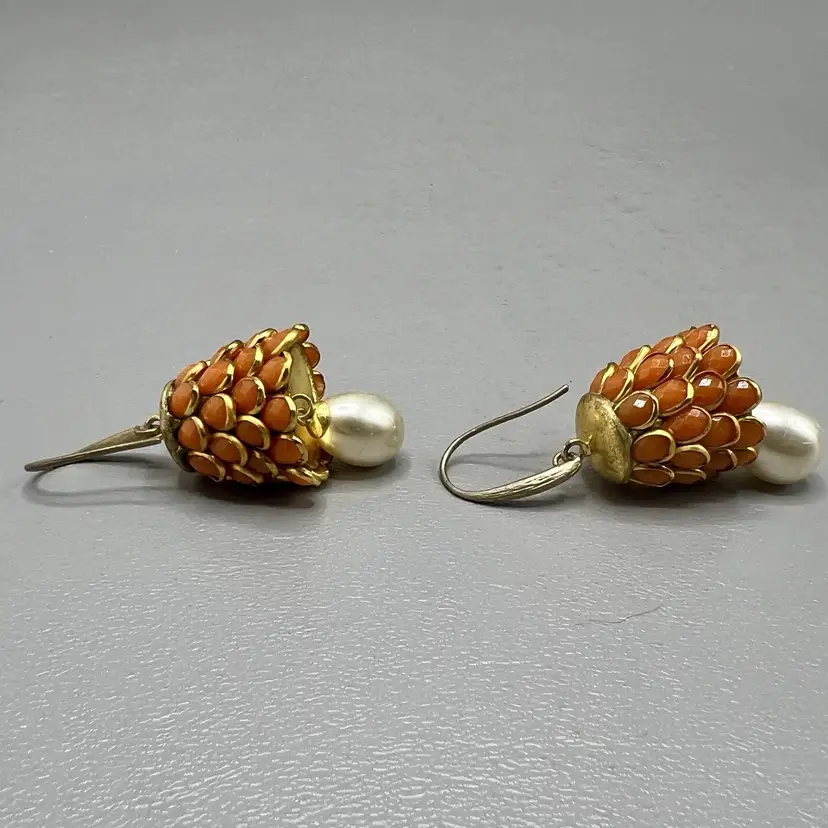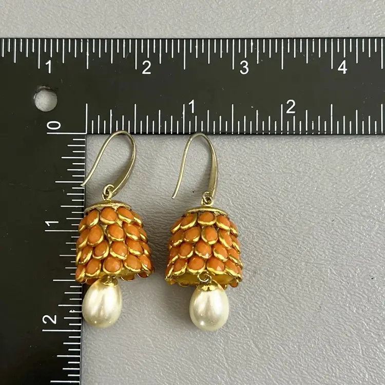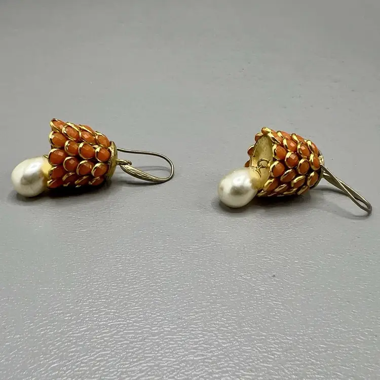Vintage Orange Gold Tone Dangle Earrings Faceted Beads Pearl Drop Statement Boho Costume Jewelry 2" Tiered design of faceted orange beads with large teardrop faux pearls.