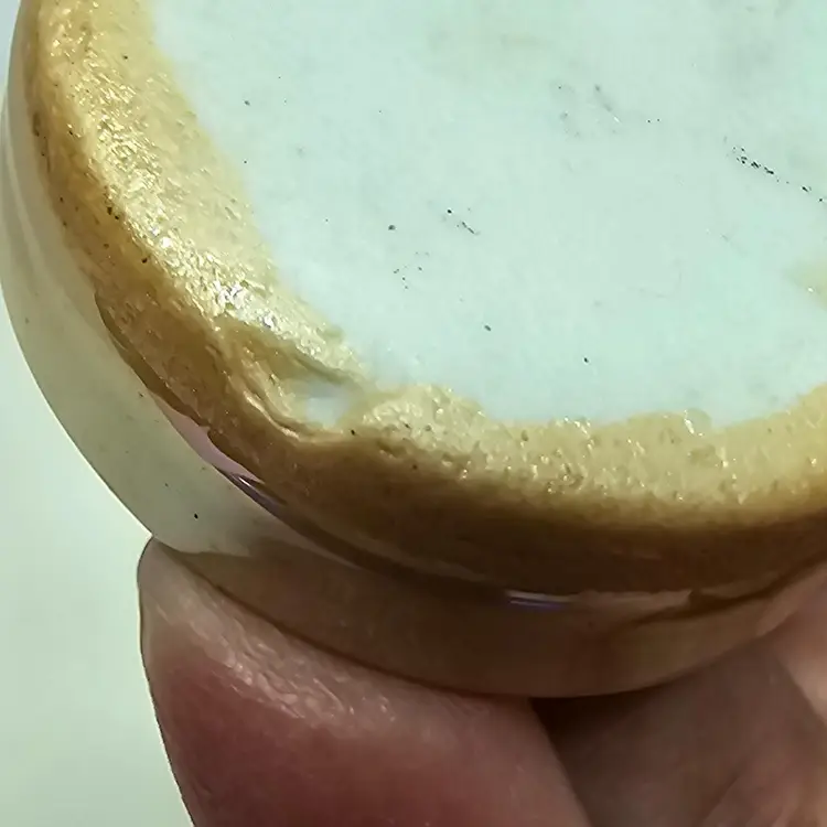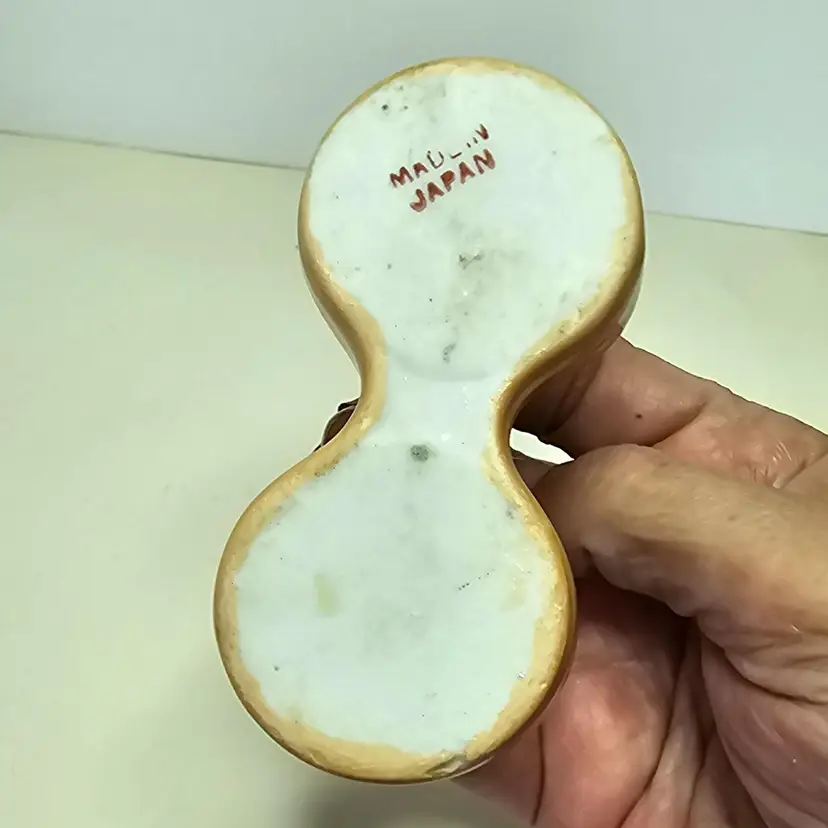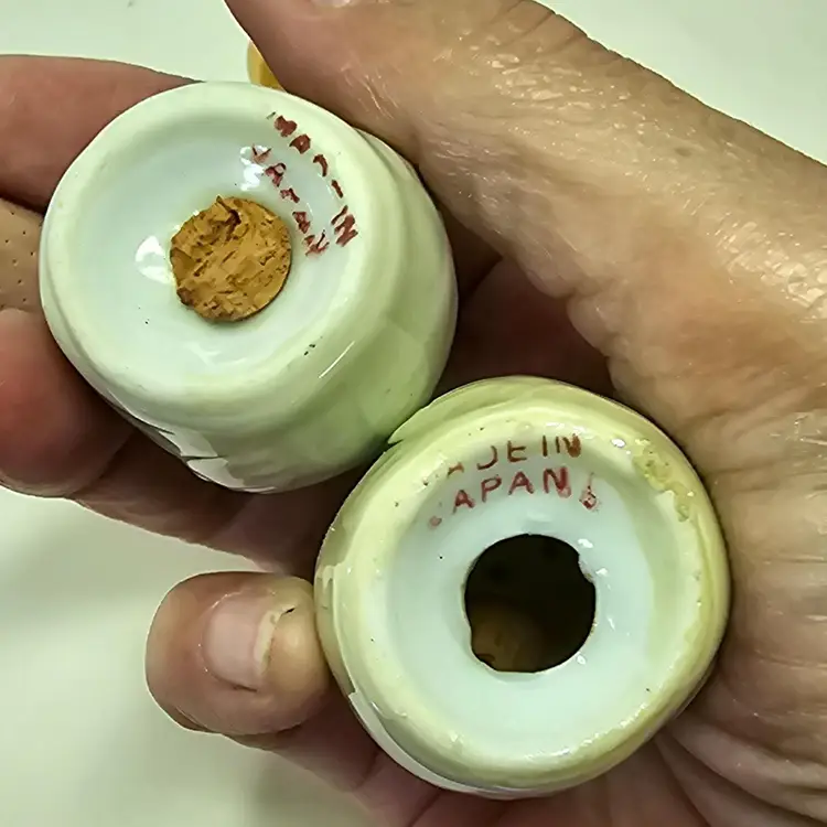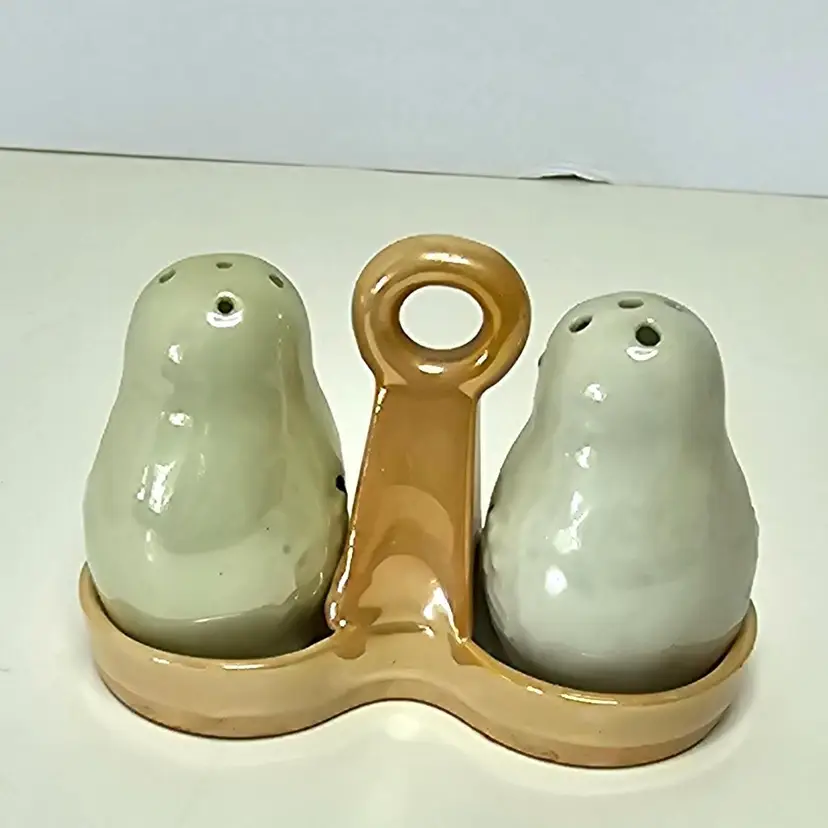Vintage luster ware, marked Made in Japan. The birds are cream colored. On stopper has been pushed in and the other must be stuck and broken off. No chips no cracks. 2.25" tall x 3.25" wide. On the bottom of the tray is a spot that may look like a chip, I tried to show that the glaze is in the spot and must be a mold flaw.