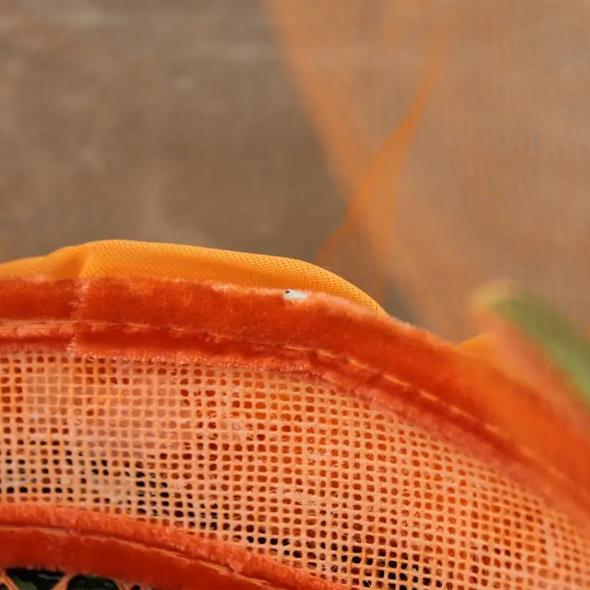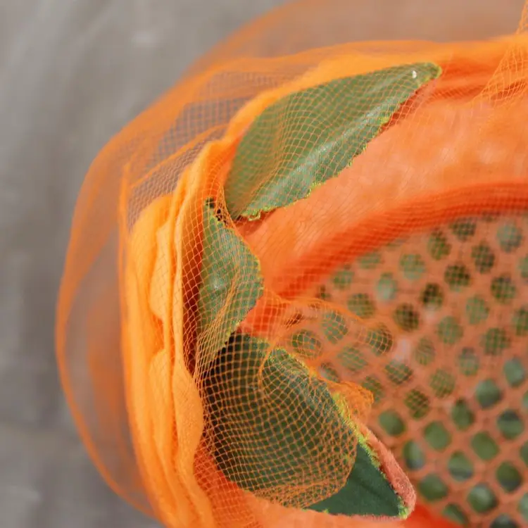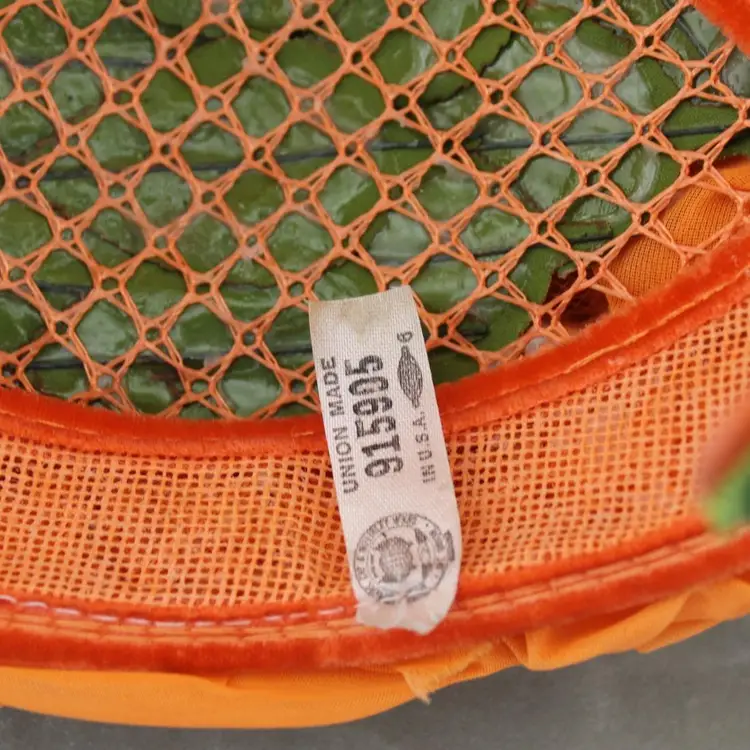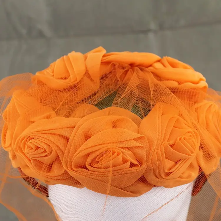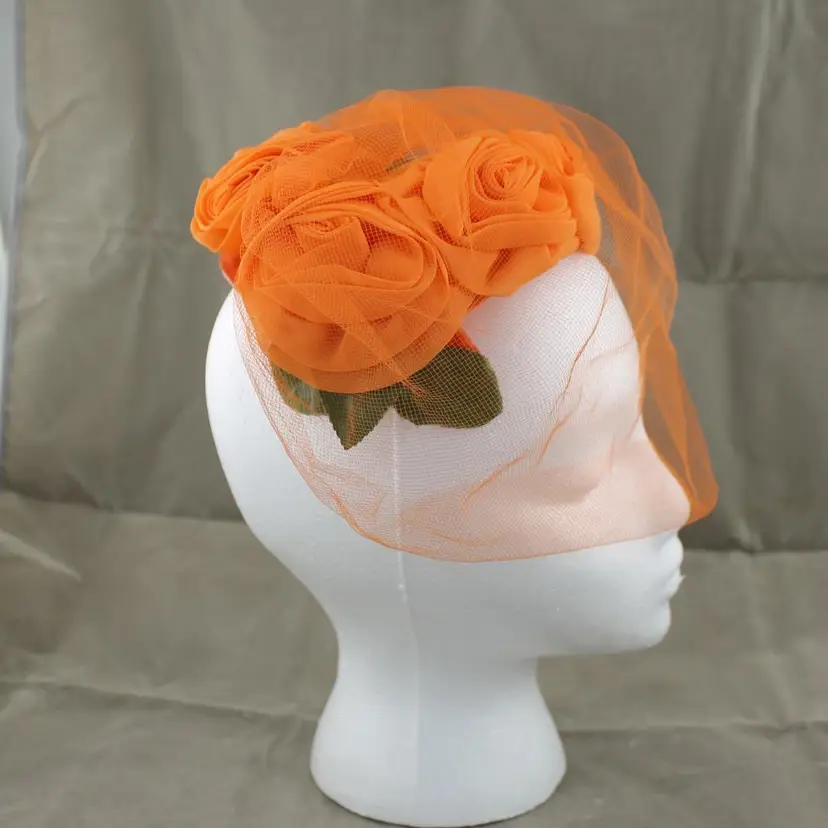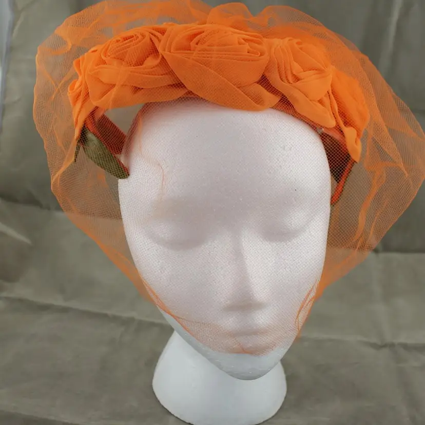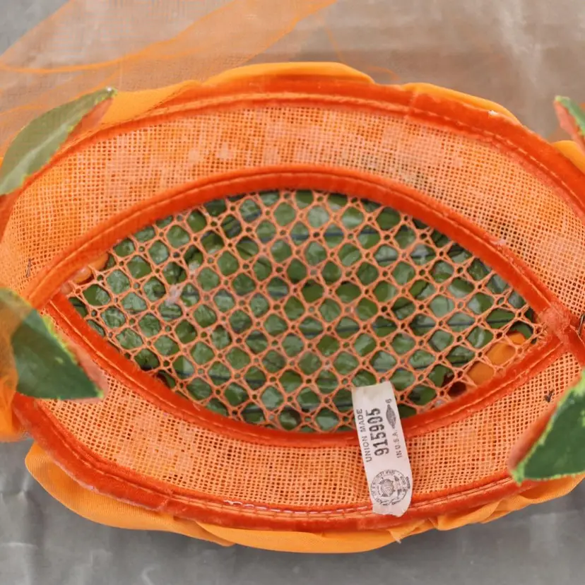 This a vintage woman's hat or headband. it is union made in the USA. It has bright orange flowers or roses with an orange veil. It has green leaves and is trimmed in orange velvet. It is in good vintage condition. There is some wear on the leaves and a piece of metal poking out. the veil is in good condition with no rips or tears.