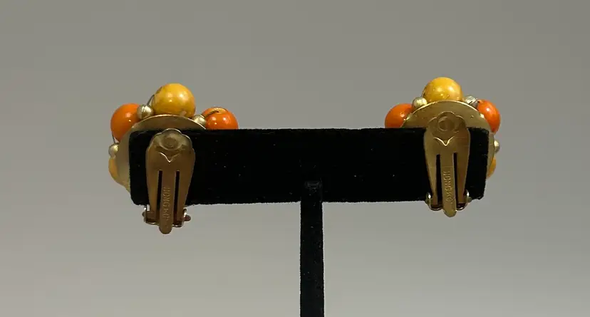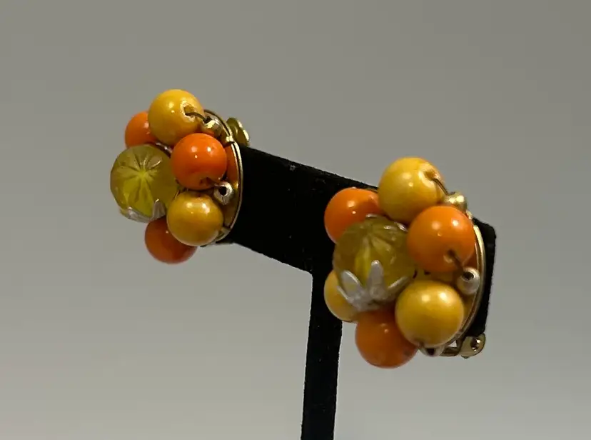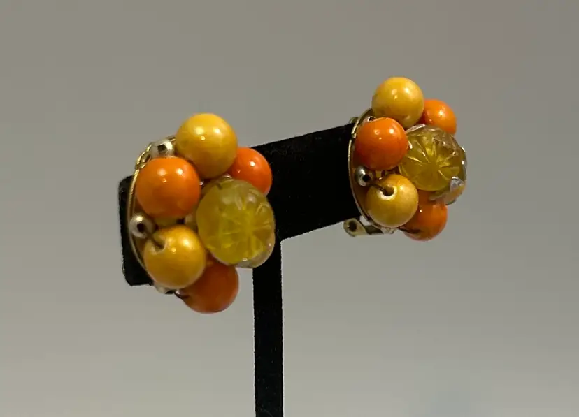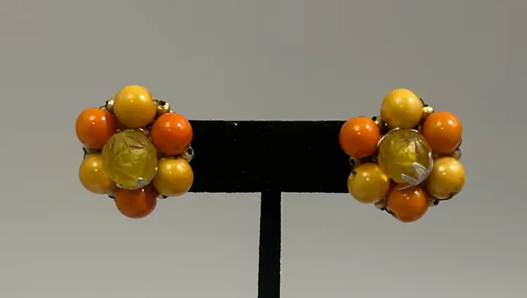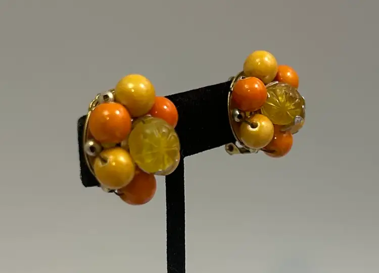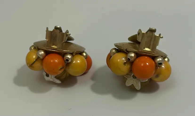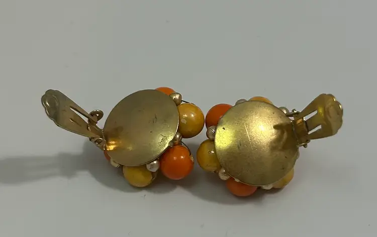 Common vintage tarnish wear on metal. No loose beads and clip on clasps intact.