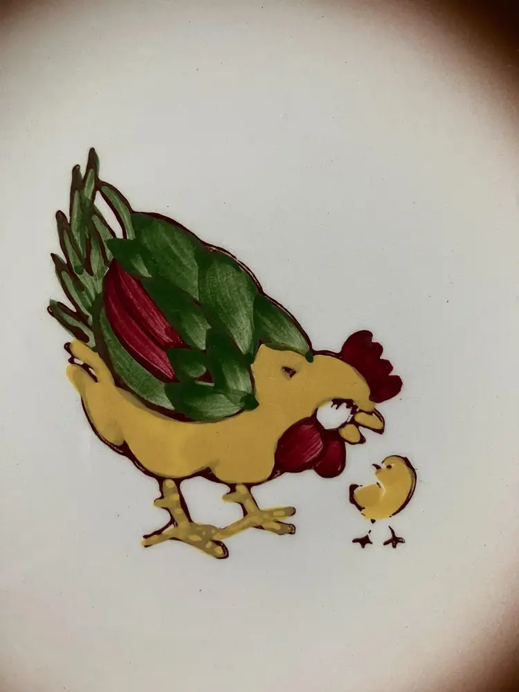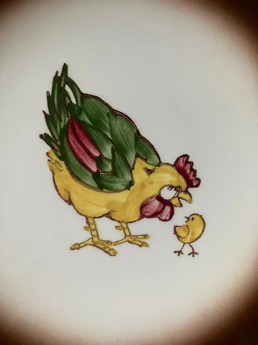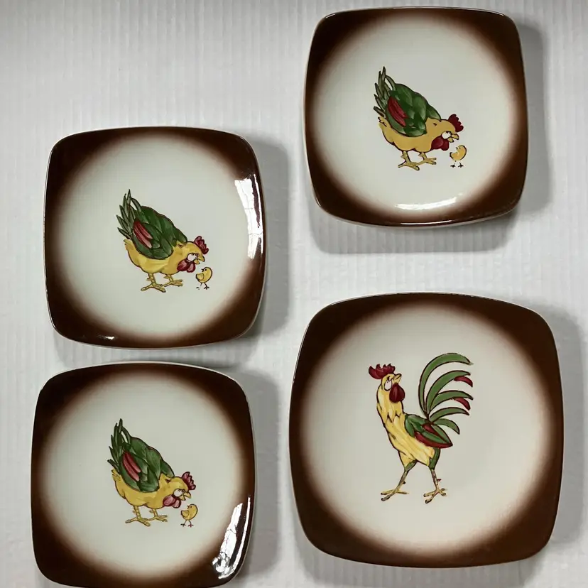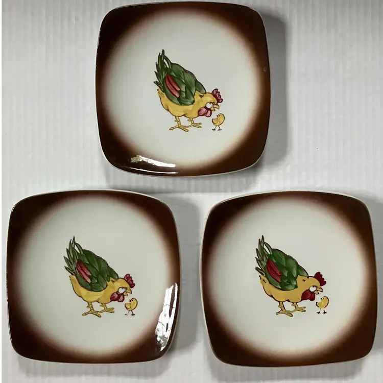 This is for 3 Orchard Ware Hen and chick plates (Made in California) measuring 5.75x 5.75 inches and 1 Rooster plate measuring 7x7 inches. There is a mark on the back of one of the smaller plates. I think it is paint from when they were made.