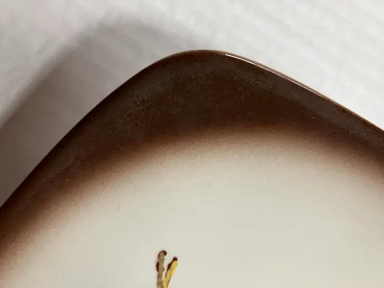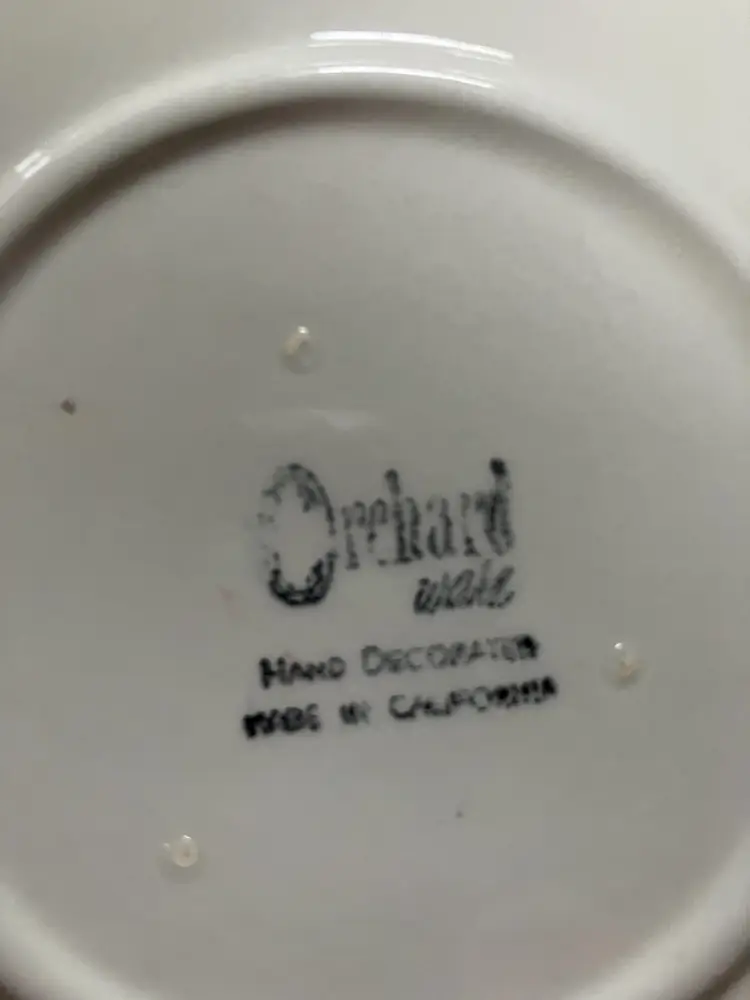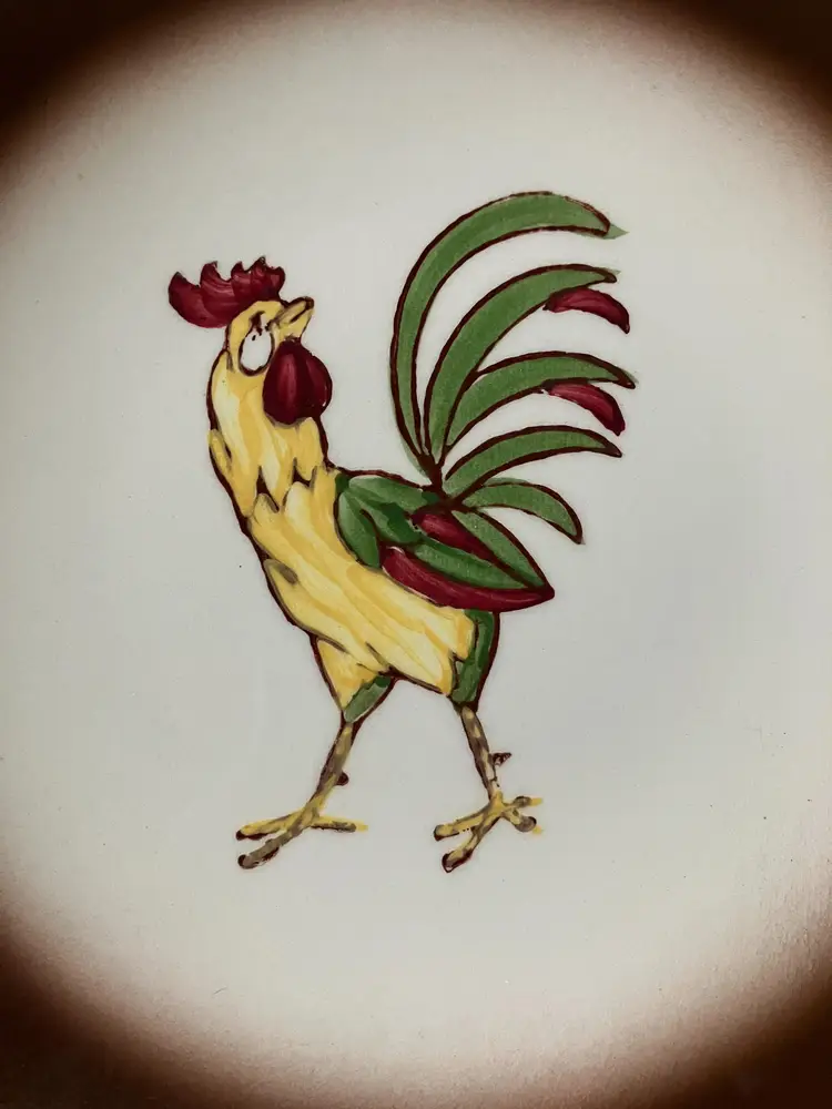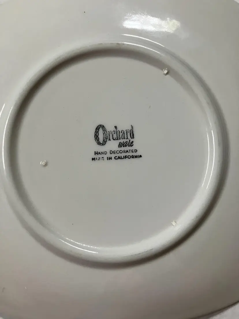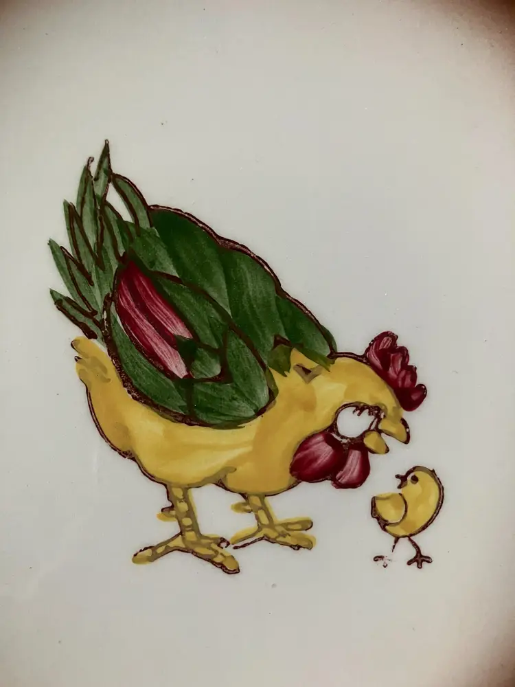This is for 3 Orchard Ware Hen and chick plates (Made in California) measuring 5.75x 5.75 inches and 1 Rooster plate measuring 7x7 inches. There is a mark on the back of one of the smaller plates. I think it is paint from when they were made.