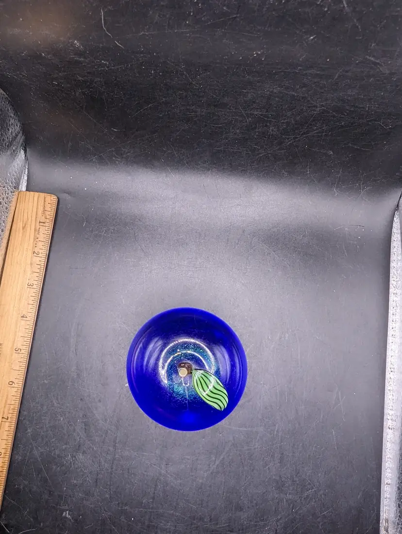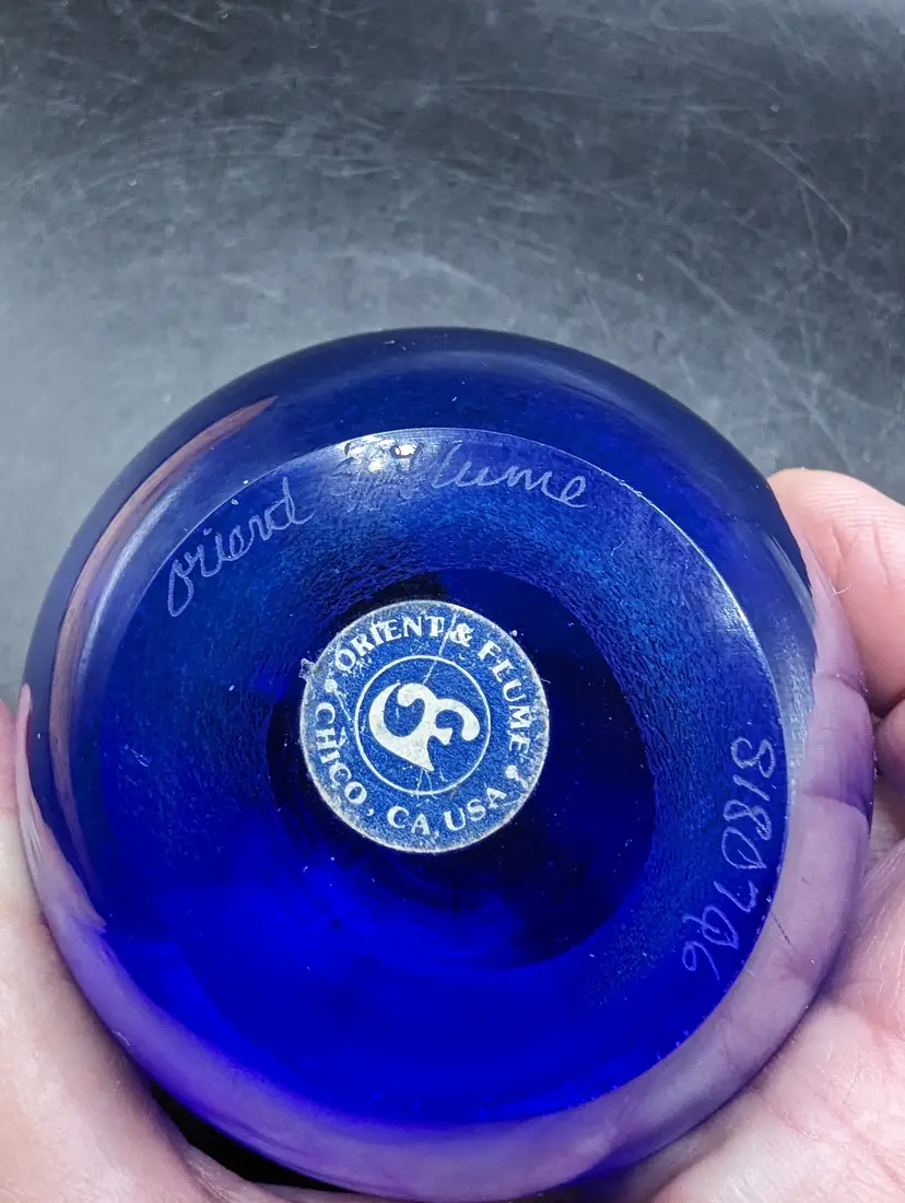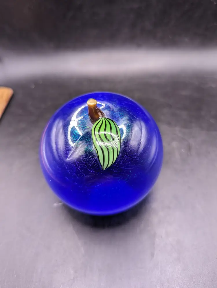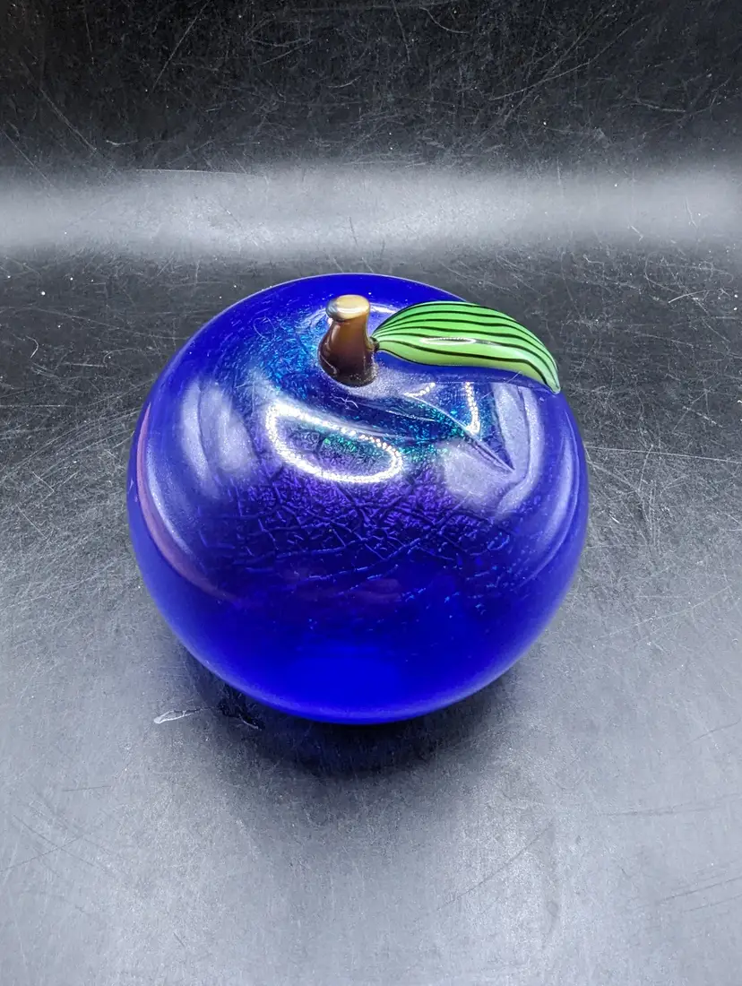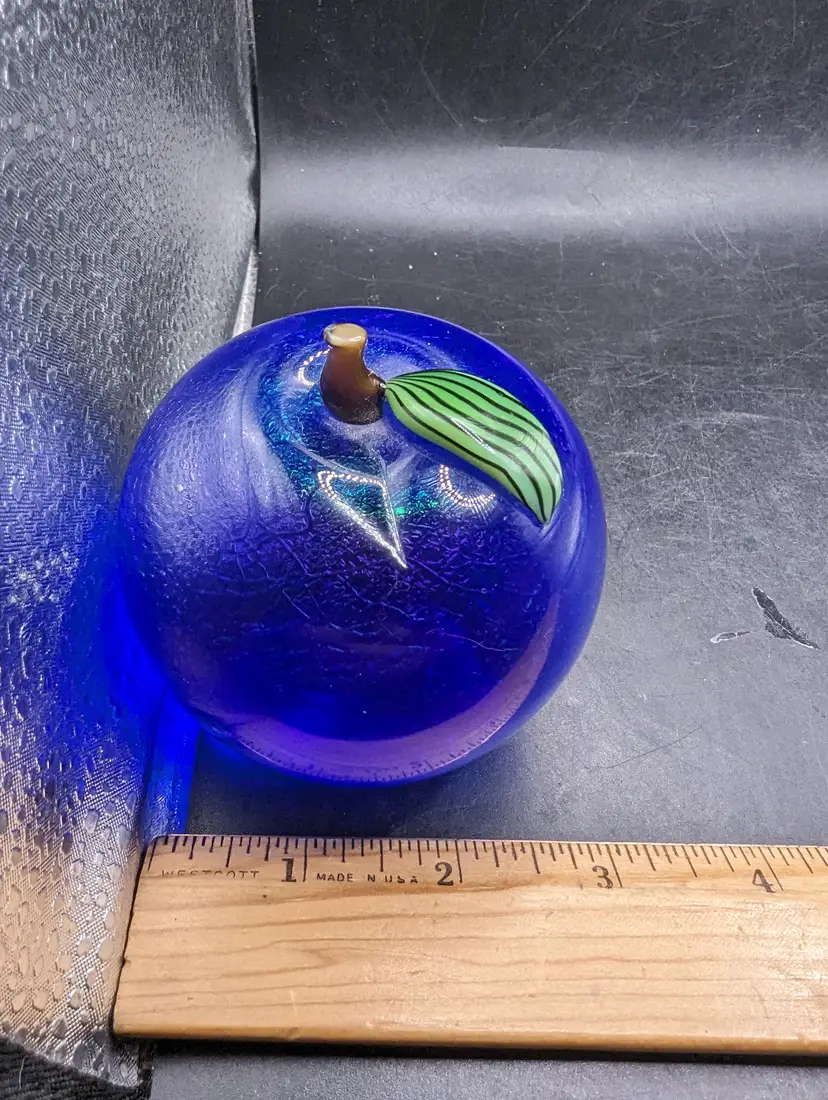 This is a lovely Vintage Orient and Flume Blue Art Glass Fruit Paperweight Signed From Chico Ca. No chips or cracks. Please see all pictures for condition and measurements.