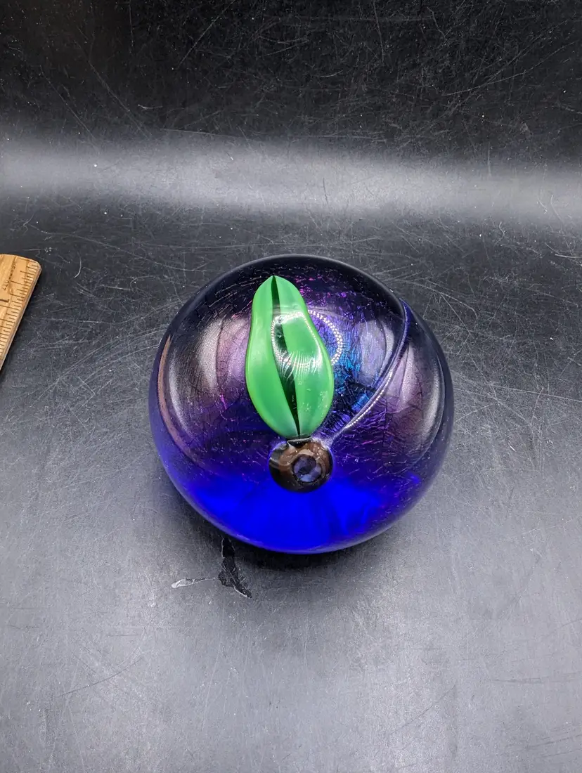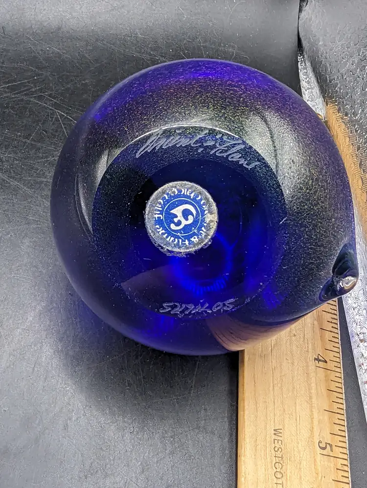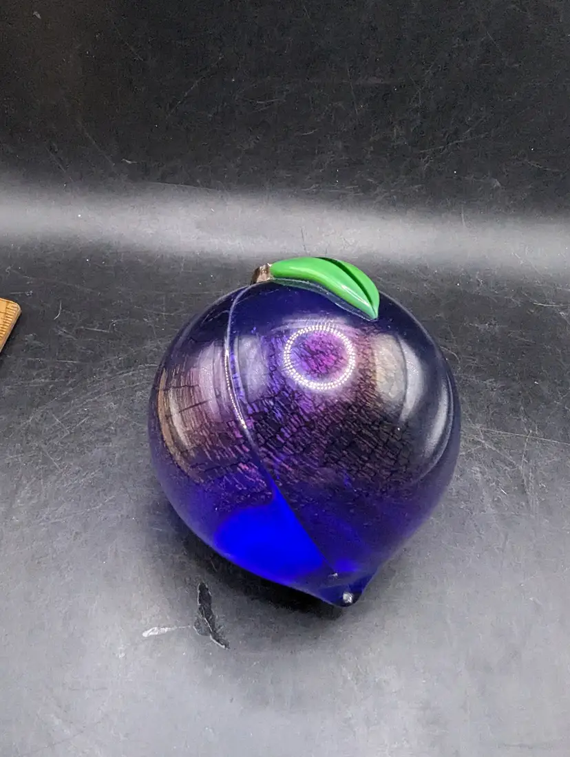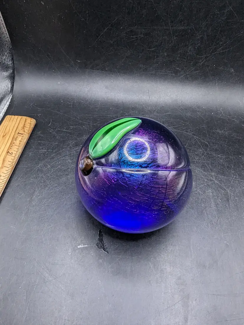 This is a lovely Vintage Orient and Flume Blue Art Glass Fruit Paperweight Signed From Chico Ca As Is. The stem has been broken. Please see all pictures for condition and measurements.