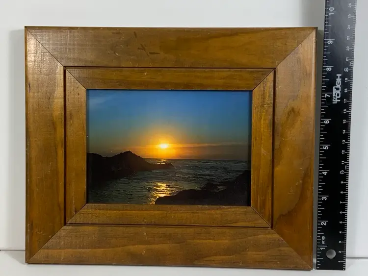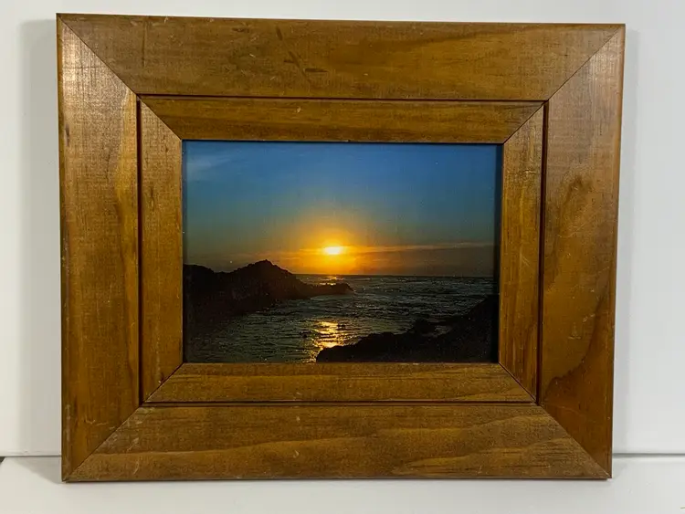 Gorgeous photograph of spectacular ocean scape . Features rolling waves against a rocky seashore and a spectacular sunset. Stunning. Please review photos of the piece. Framed and signed by artist on back of frame. 9.5” by 11.5” artist framed. https://www.facebook.com/davewhitephotography/