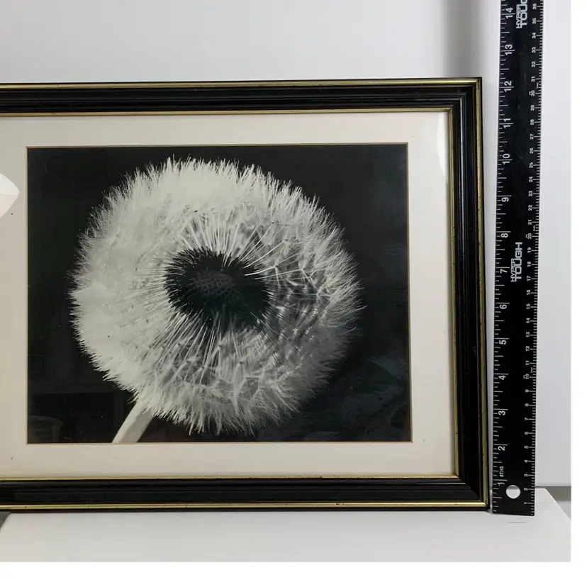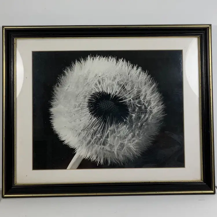 Gorgeous photograph of dandelion plant flower. Black and white in a black frame with gold border. Ultra chic. Please review photos of the piece. 12” by 15.5” framed art photograph.