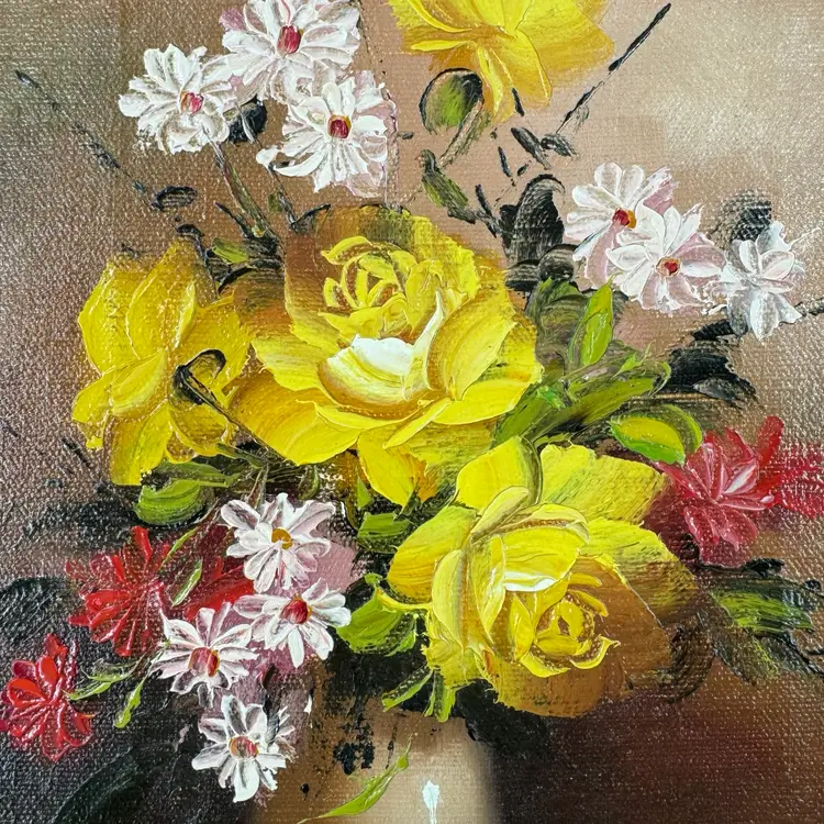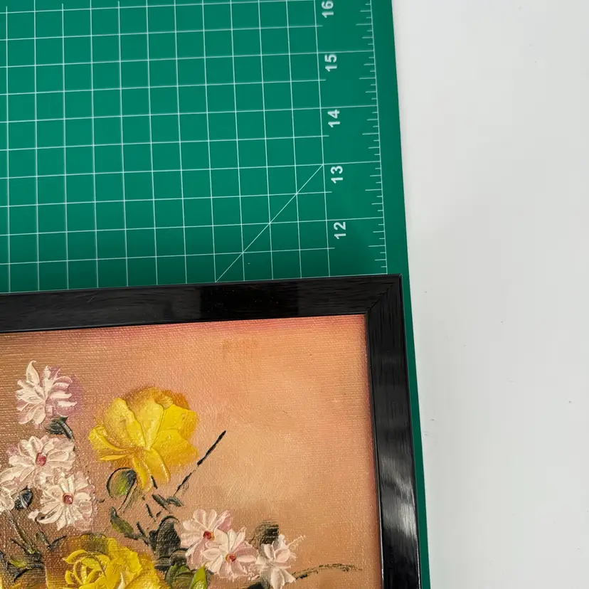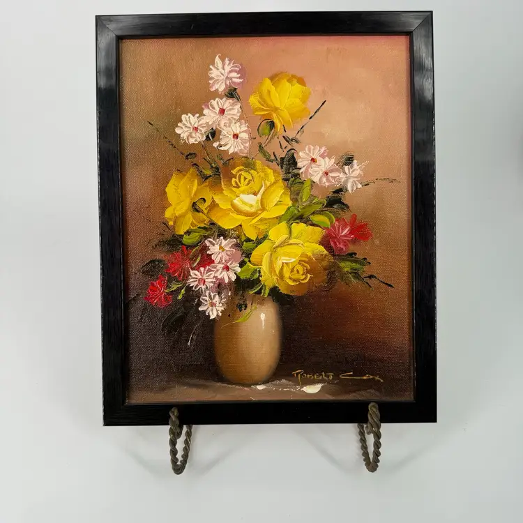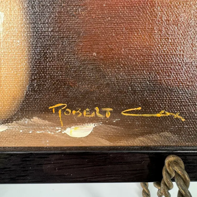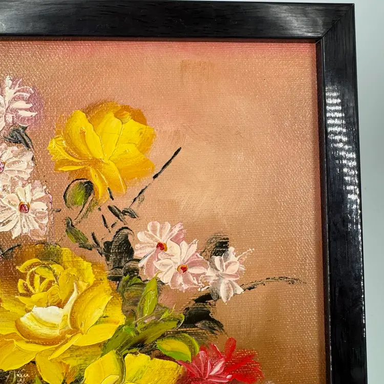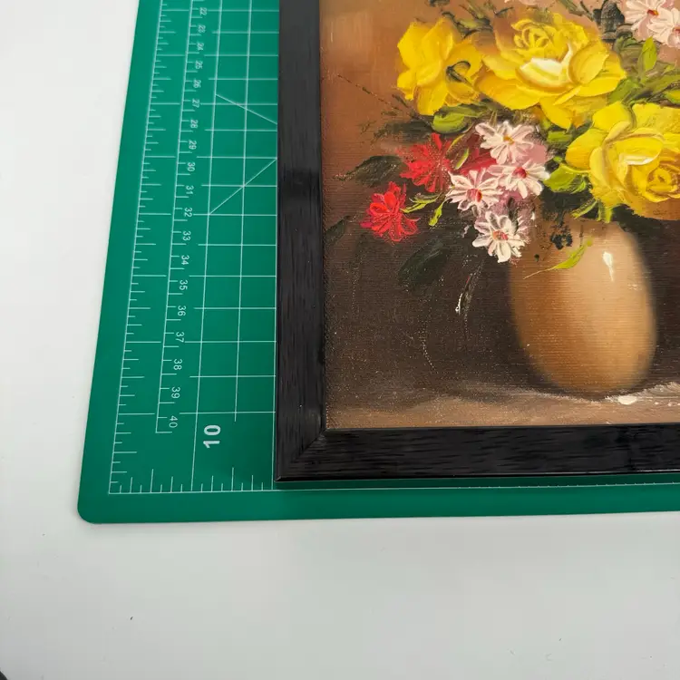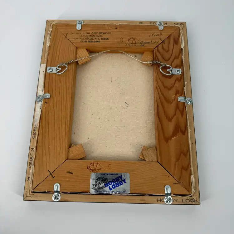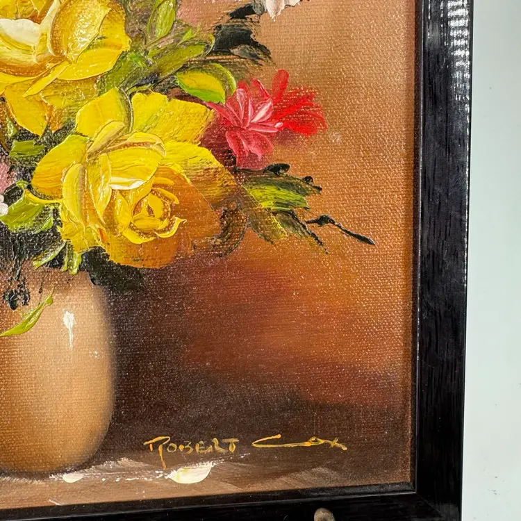 This floral painting is attributed to Robert Cox. There are no known issues. In the images, please notice the many markings on the back of the painting and the vibrant colors. Frame measures roughly 9x11 in. Zoom in on the images to see details of the item to ensure it is to your liking. Please reach out with any questions.