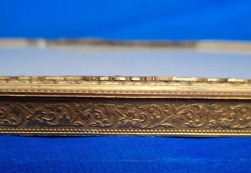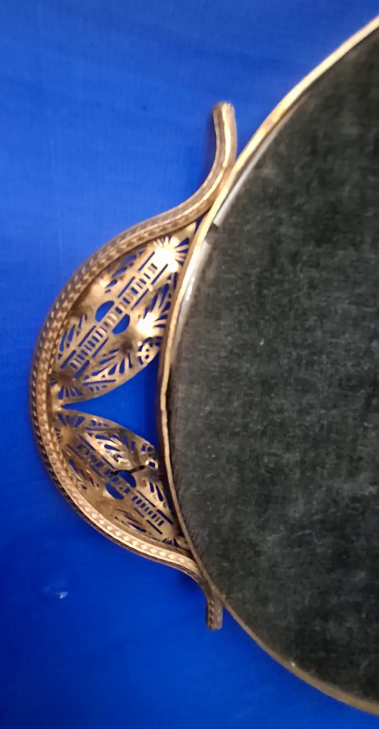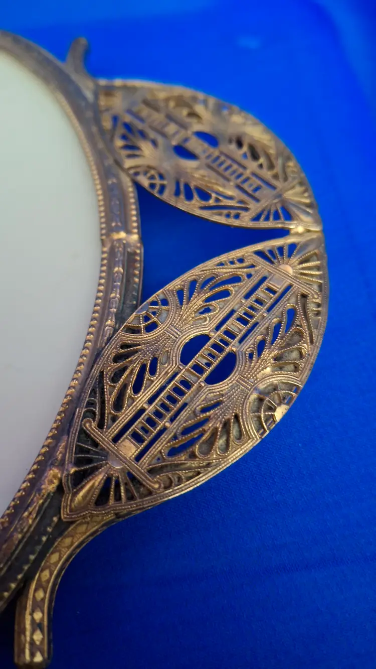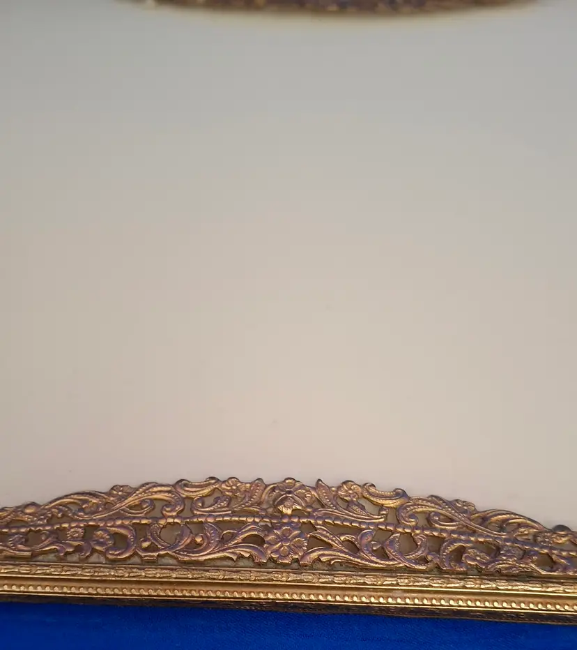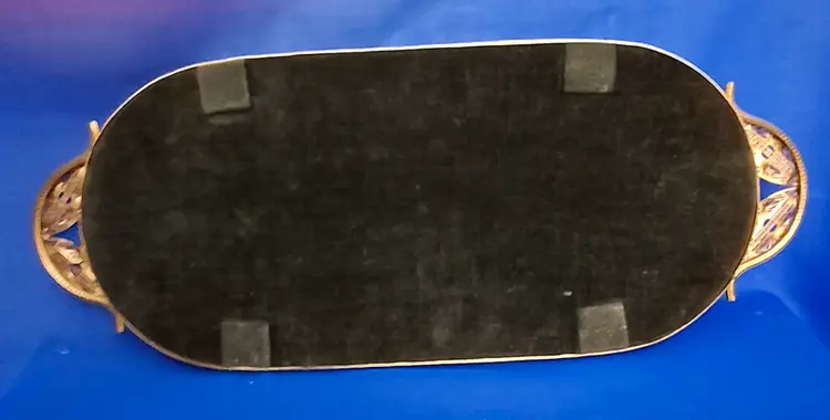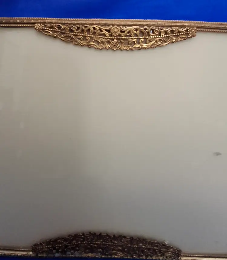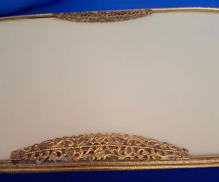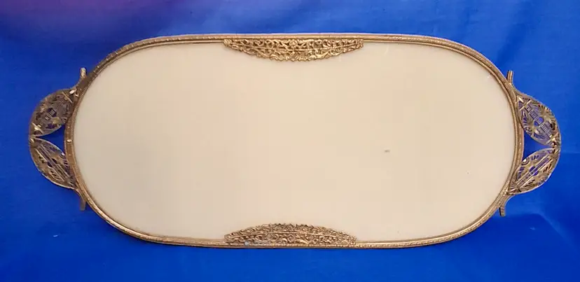 Vintage Ormolu Dresser Tray is 17 1/2" long x 7 1/4" wide. A beautifully decorated tray with fine filigree, leaf shaped handles, floral swags on each side and embossed edges. A great size for displaying vanity items like perfume bottles and trinket dishes. The glass has a few small scratches, slight tarnishing of the metal around the handles and it is missing a few of the small nails that attach the base. No chips, cracks, or repairs. Please view the pictures and feel free to ask questions. Thank you for visiting my shop.