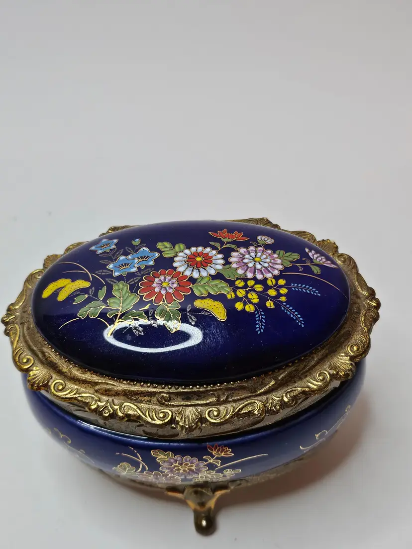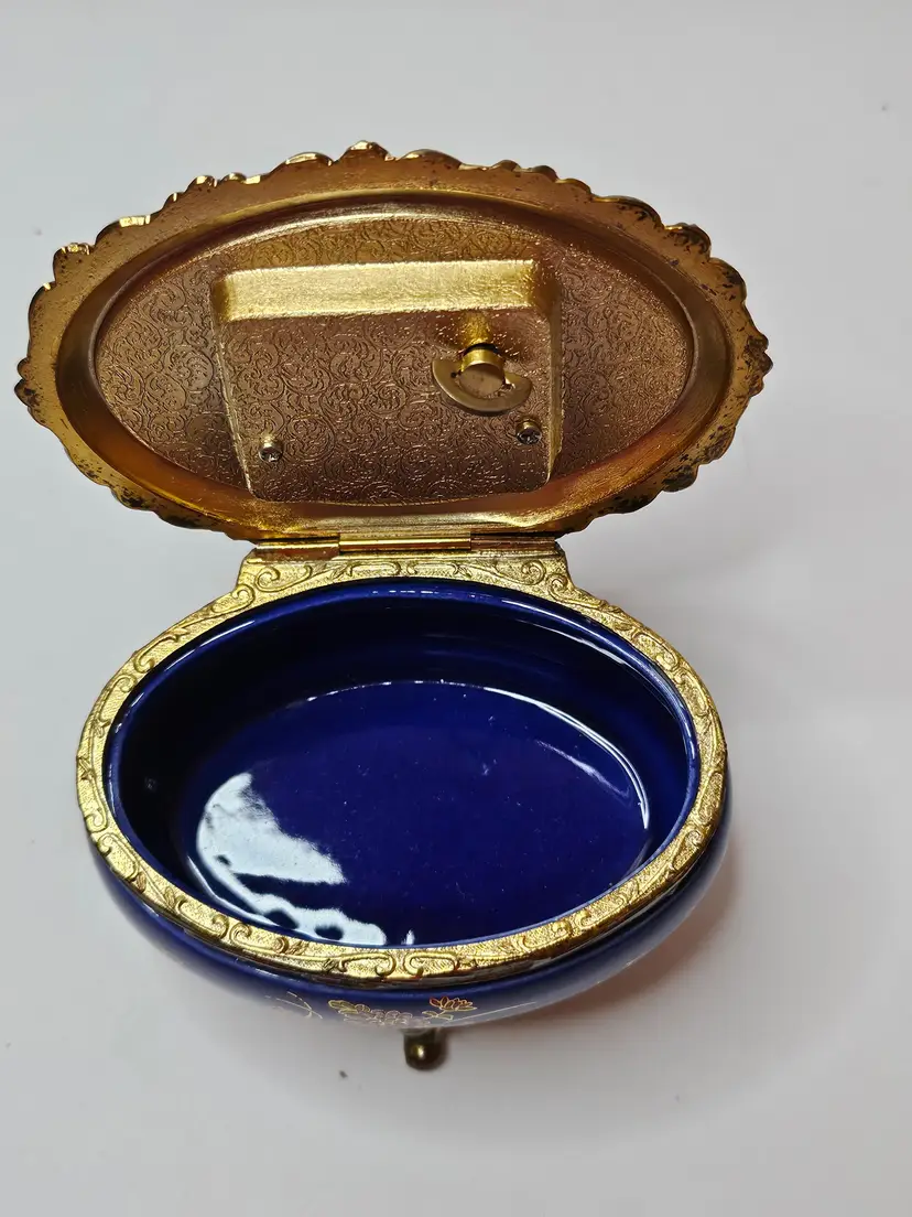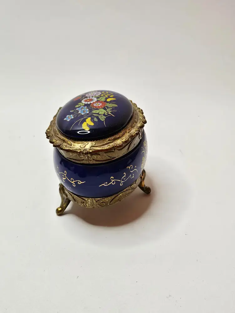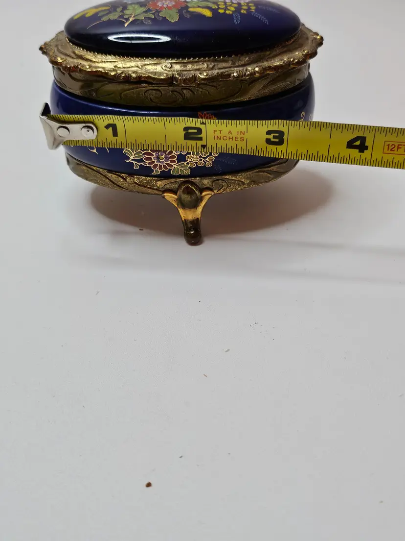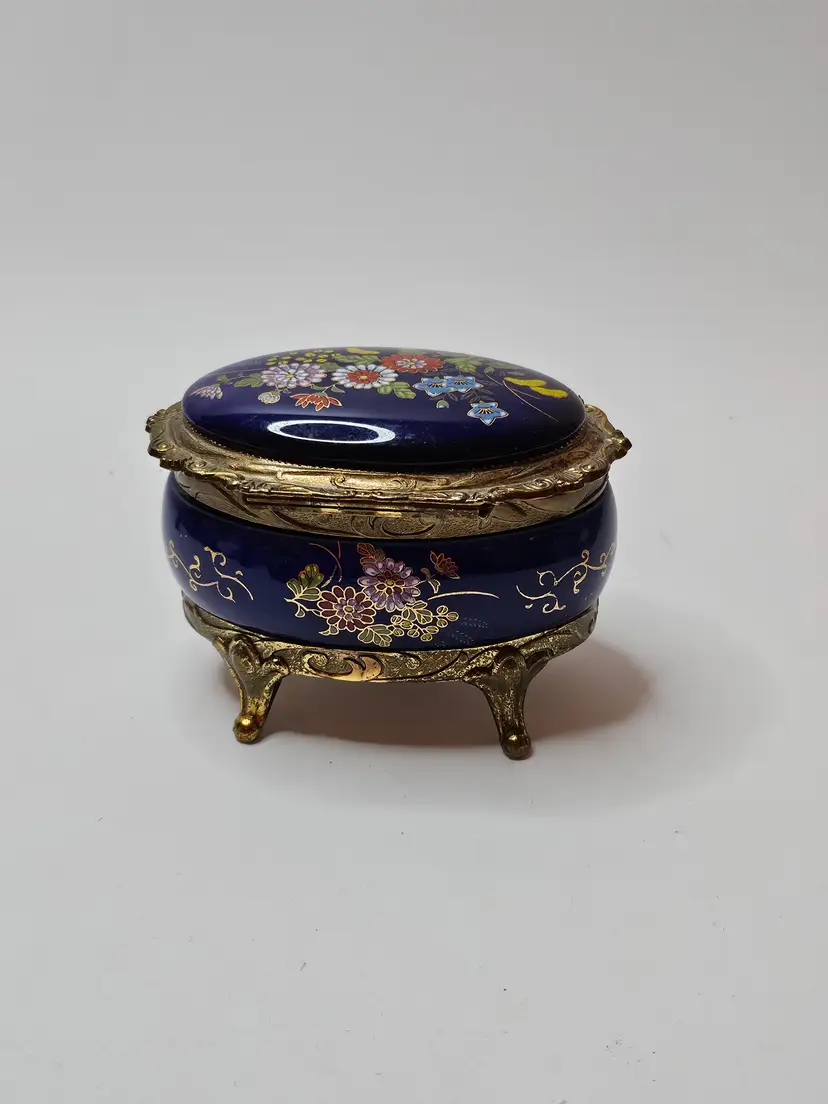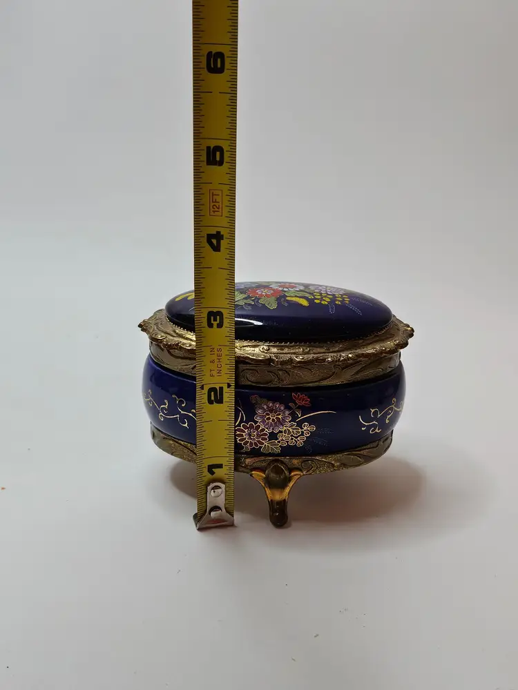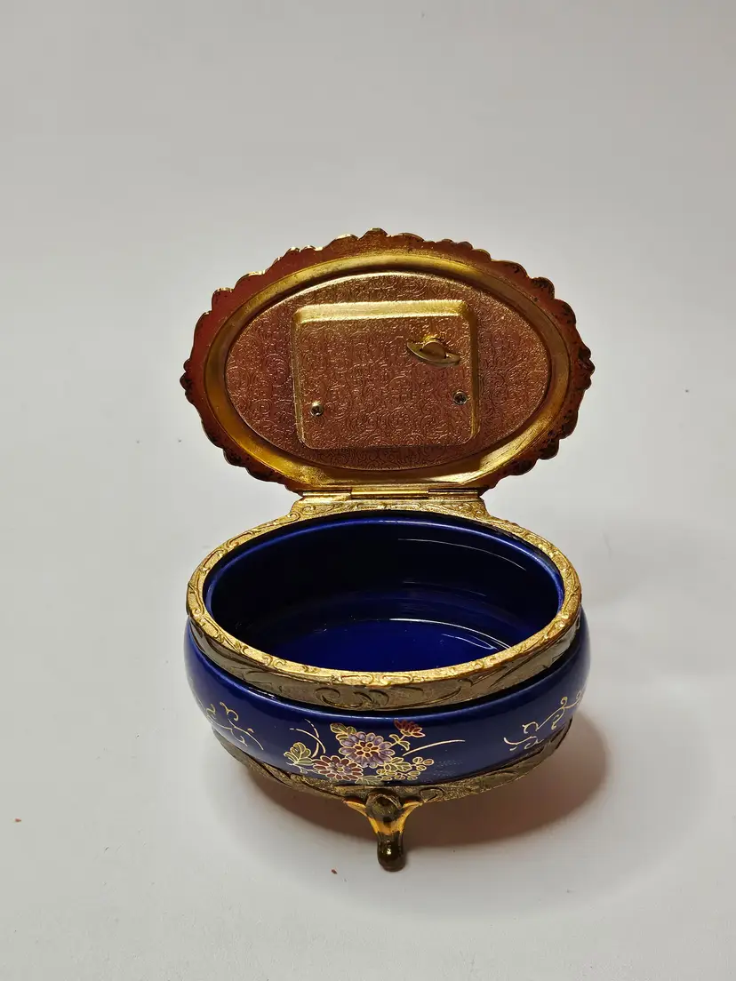 The vintage music box is adorned with ornate cobalt blue enamel and intricate floral designs in gold tone. The jewelry and trinket box features a charming and elegant aesthetic, making it a beautiful addition to any collection or decor. Crafted by Sankyo, a reputable brand known for quality music boxes, this piece exudes a sense of nostalgia and sophistication. Its single unit quantity suggests a unique and rare find that is sure to captivate music box enthusiasts and collectors alike.