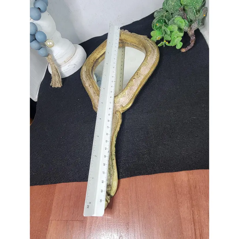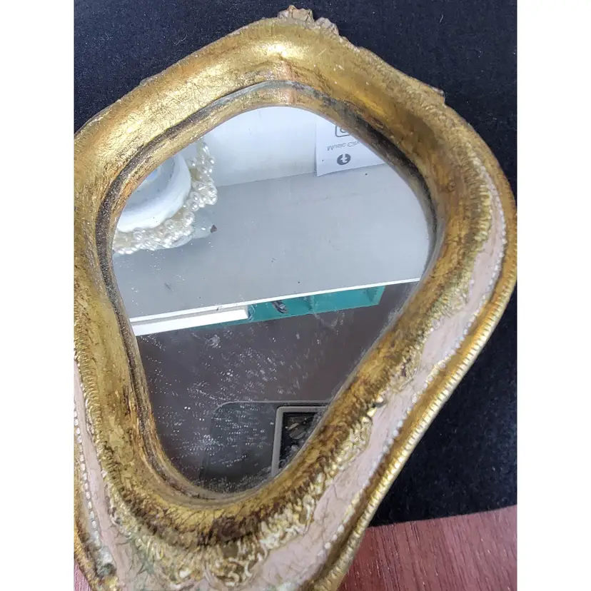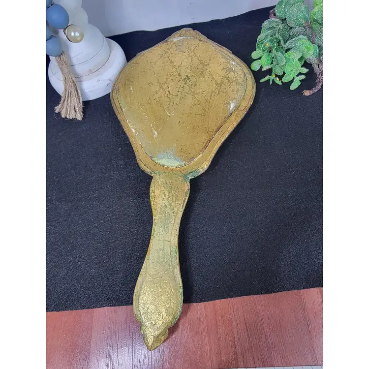 Vintage hand mirror with an ornate gold-tone frame. Perfect for adding a touch of elegance to your vanity or dresser. Possibly from Italy