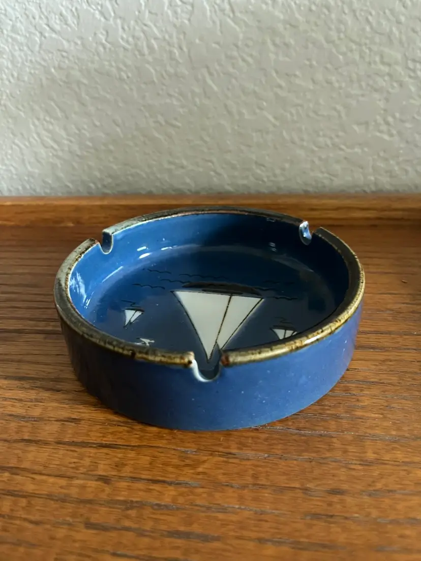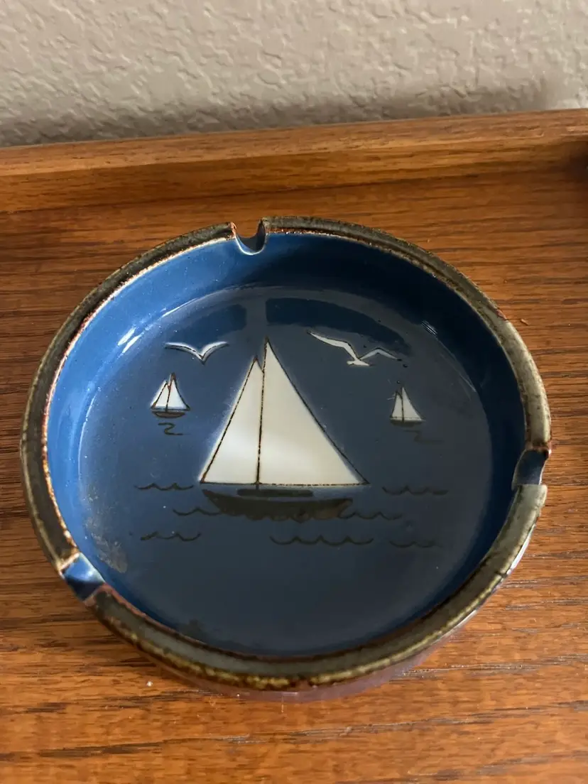 Vintage Otagiri ceramic ashtray featuring a sailboat and seagull design. No chips or cracks. 5 1/8” across 1 3/8” height