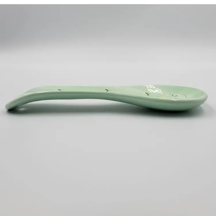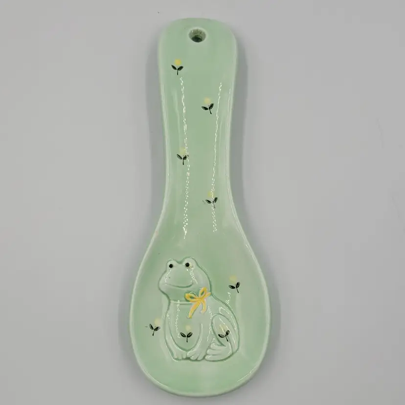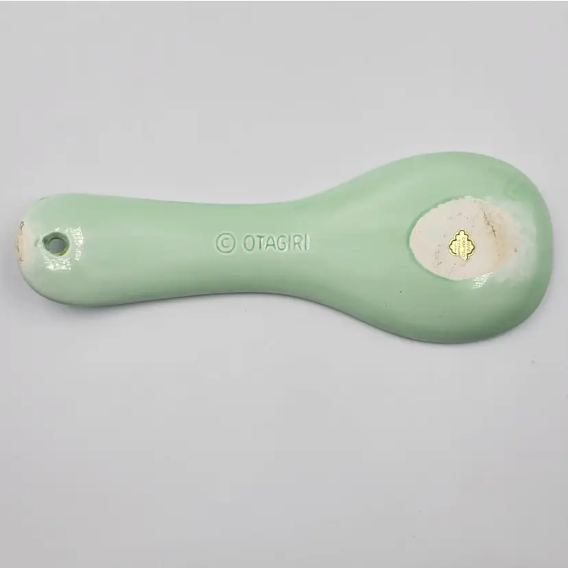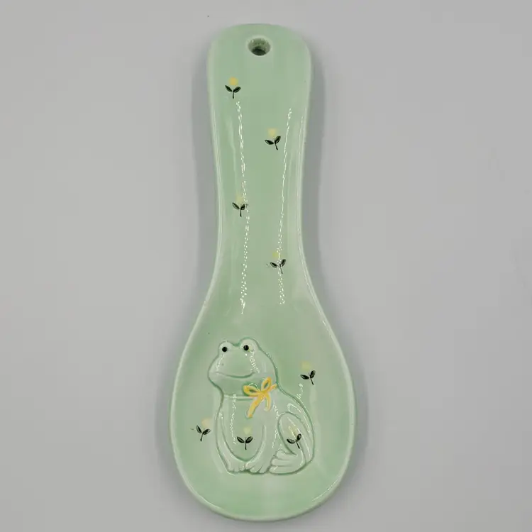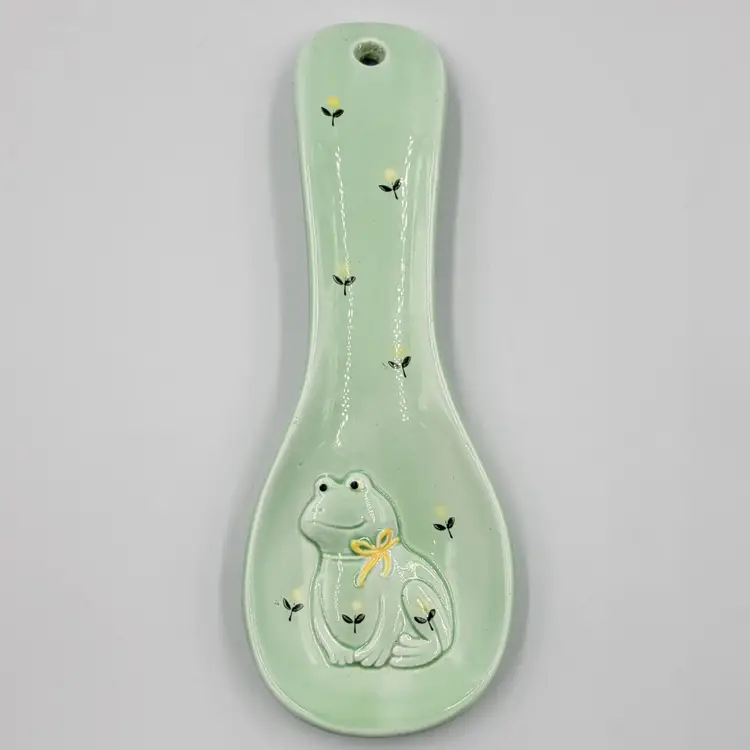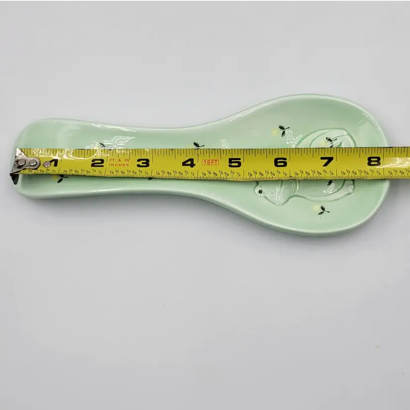 This spoon rest has a raised little frog with a yellow bow and little yellow flowers on it. It is stamped on the back Otagiri, and has sitcker showing it was made in Japan (see photos). The spoon rest measures about 8.50 inches long and is a little over 3 inches wide. There is a hole at the top so you could hang this. There are a fee glaze chips on the rim (see photos). The bottom has a wear spot and so does the top where it rests on a table (see photos).