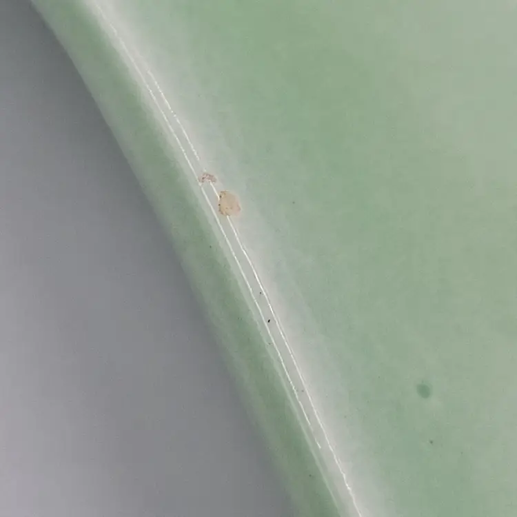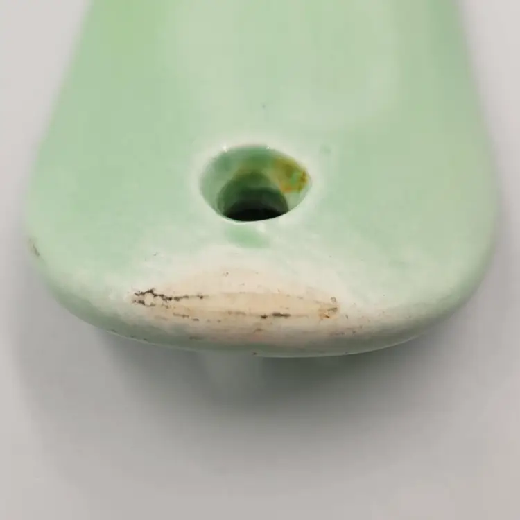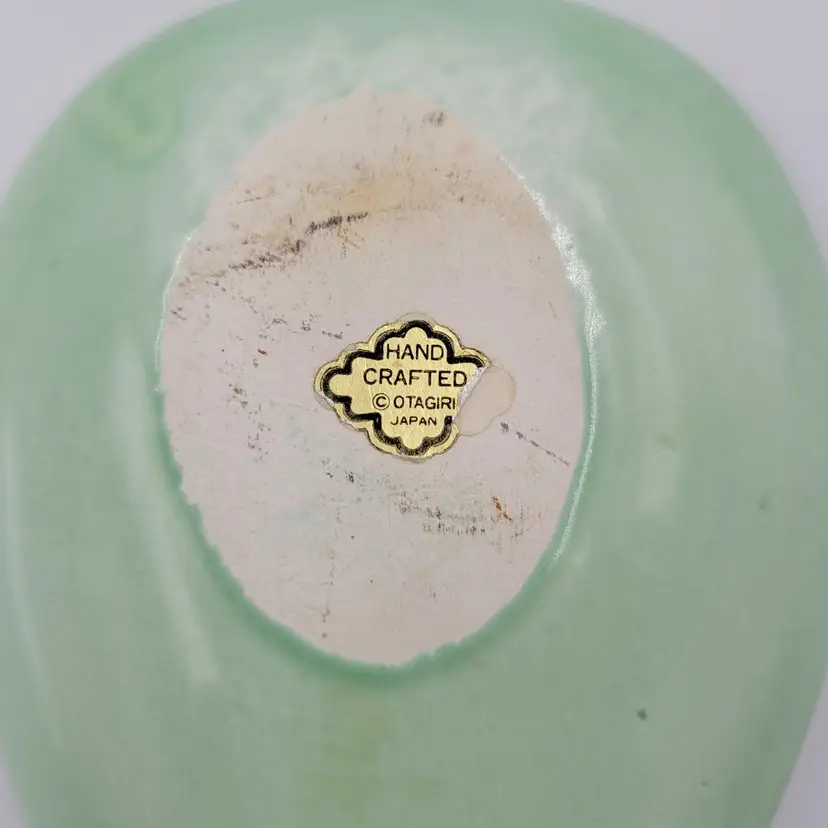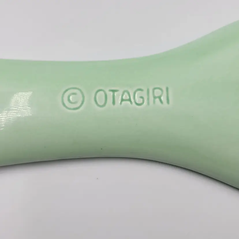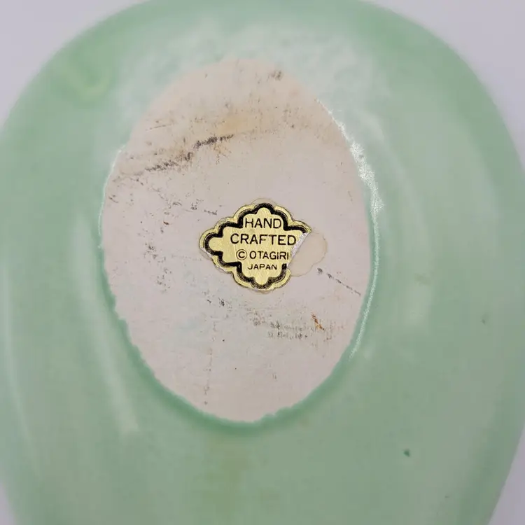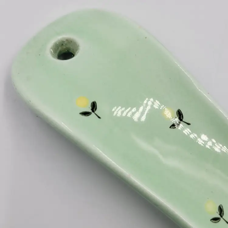 This spoon rest has a raised little frog with a yellow bow and little yellow flowers on it. It is stamped on the back Otagiri, and has sitcker showing it was made in Japan (see photos). The spoon rest measures about 8.50 inches long and is a little over 3 inches wide. There is a hole at the top so you could hang this. There are a fee glaze chips on the rim (see photos). The bottom has a wear spot and so does the top where it rests on a table (see photos).