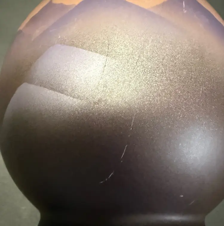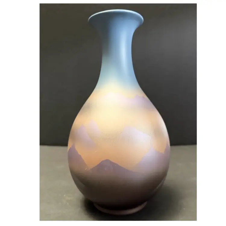 This Vintage Otagiri Hand Painted Blue Copper Iridescent Color Mountain Vase is a stunning piece of Japanese craftsmanship. Handmade with intricate details, this 10-inch vase showcases the beauty of traditional Japanese culture. The unique blue copper iridescent color and mountain design make it a standout collectible item for enthusiasts of Asian art and decor. Made in Japan, this vase is a timeless piece that adds a touch of elegance to any space.