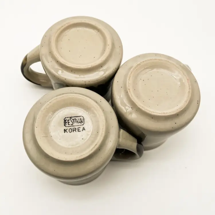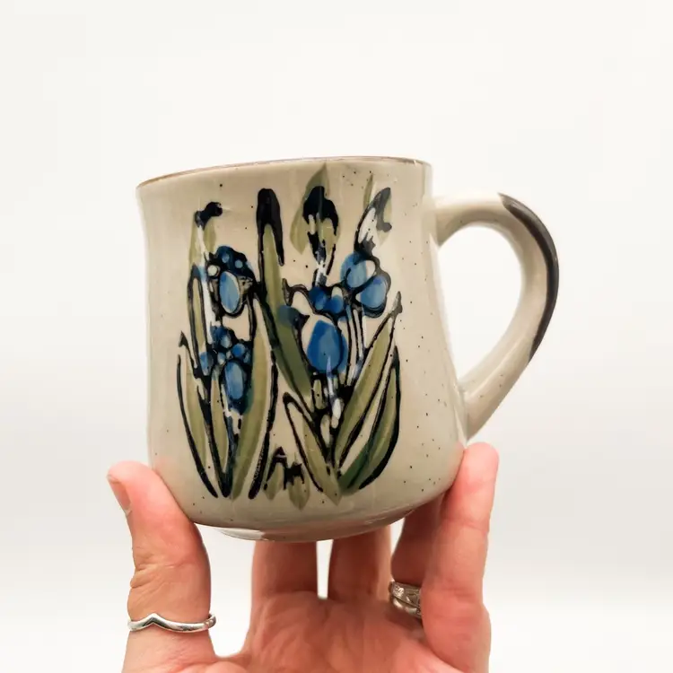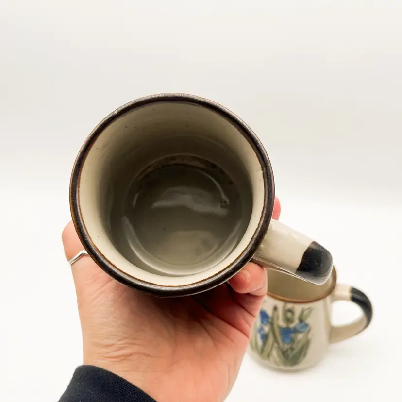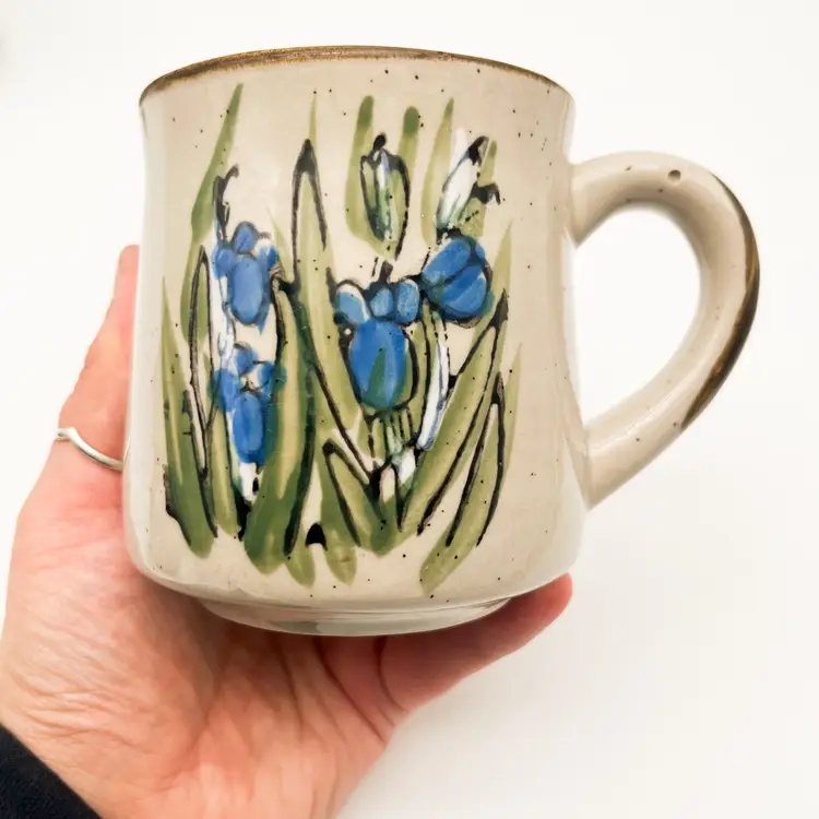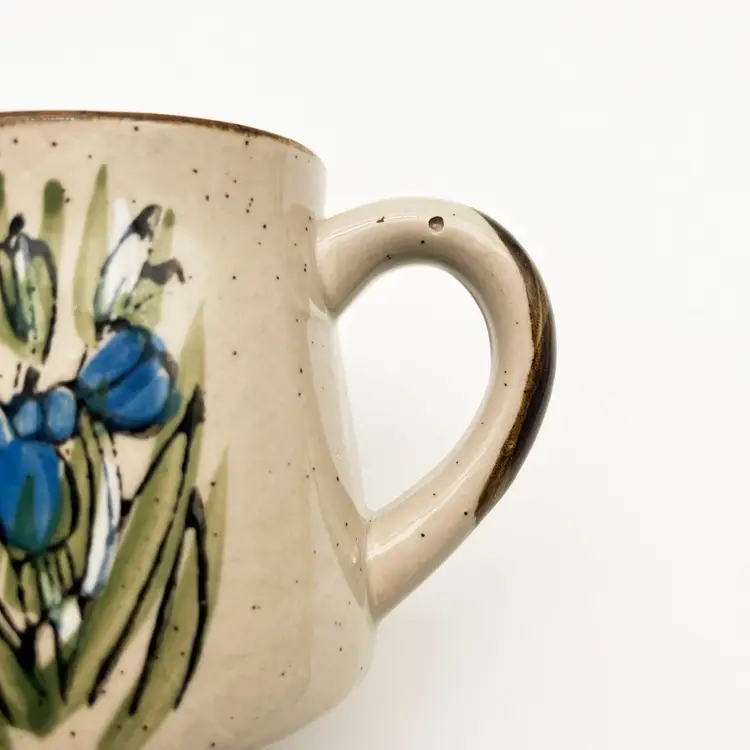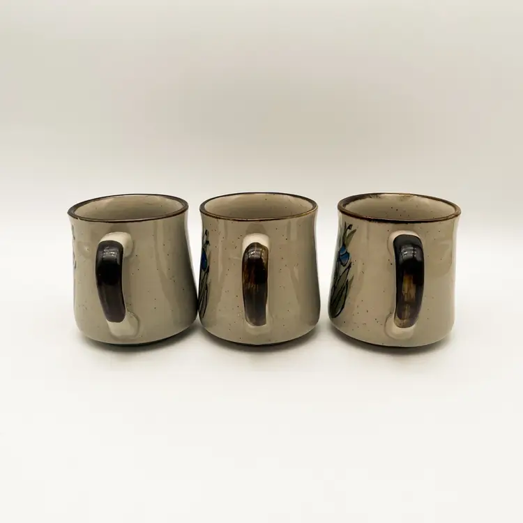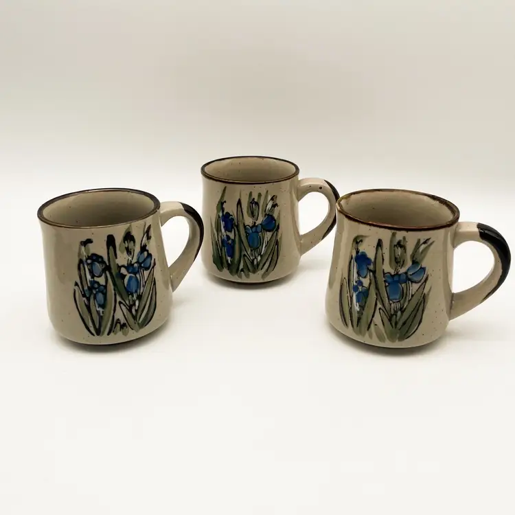 Vintage Otagiri Stoneware Mugs Set of 3 Blue Iris Flowers Korean Cup Drinkware Condition: one mug has a tiny manufacturing flaw/hole in the glaze. There do not appear to be any chips or cracks that I could find