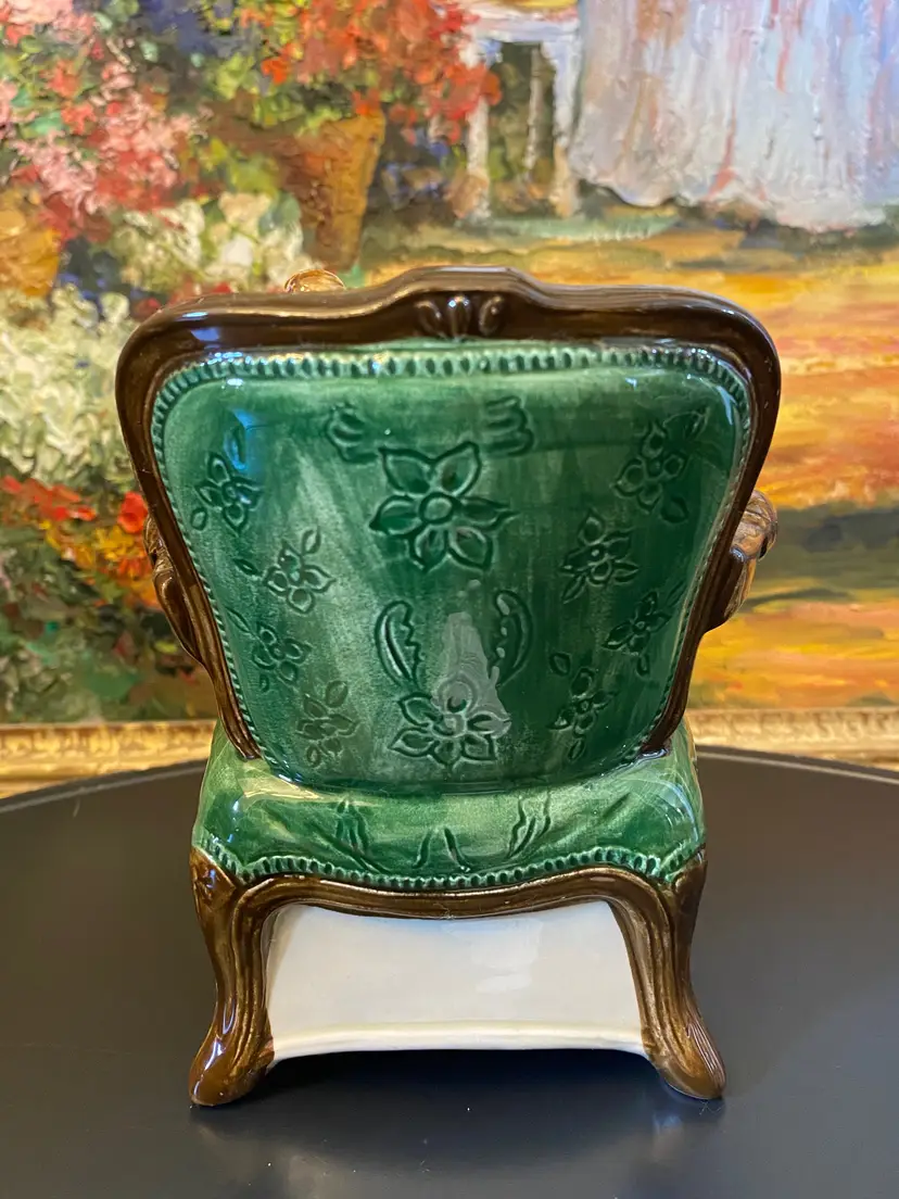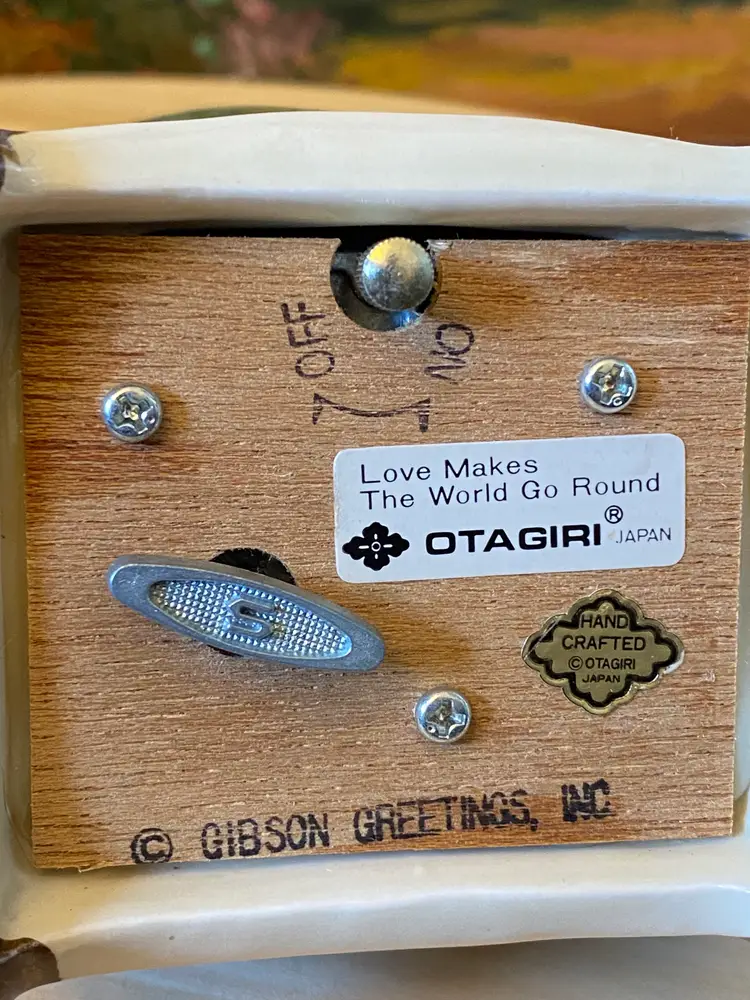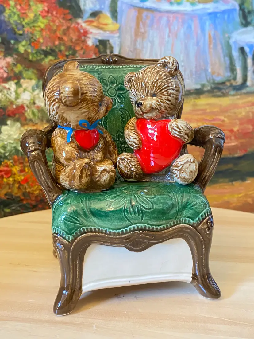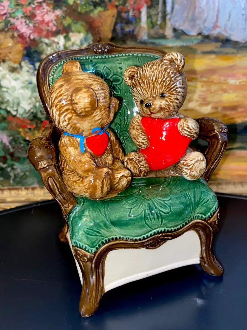 Otagiri Japan music box featuring two teddy bears sitting on a green arm chair. One is holding a big red heart and the other has his head turned toward the other with a heart on the blue ribbon around his neck. It does have an on and off switch.