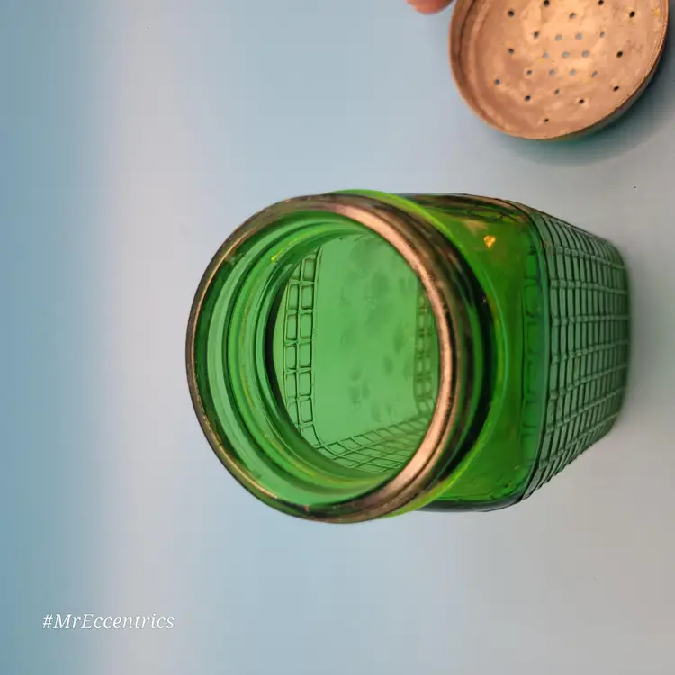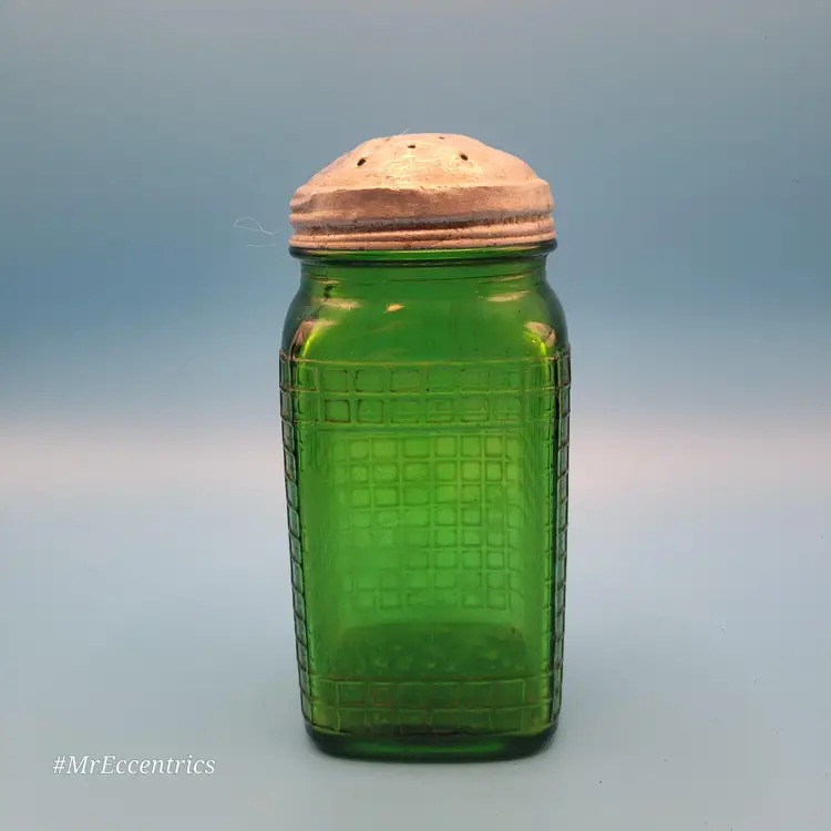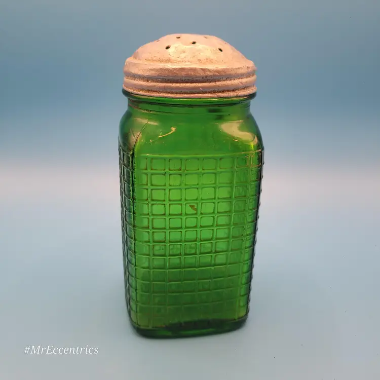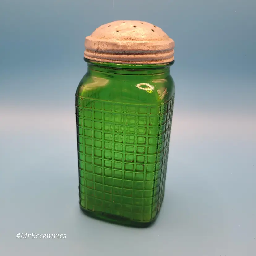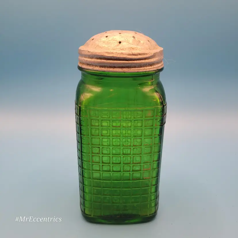 Green Waffle Pattern Shaker Jar with Metal Top Made in Huntington, West Virginia by Owens Illinois Glass Circa 1941 - 1942