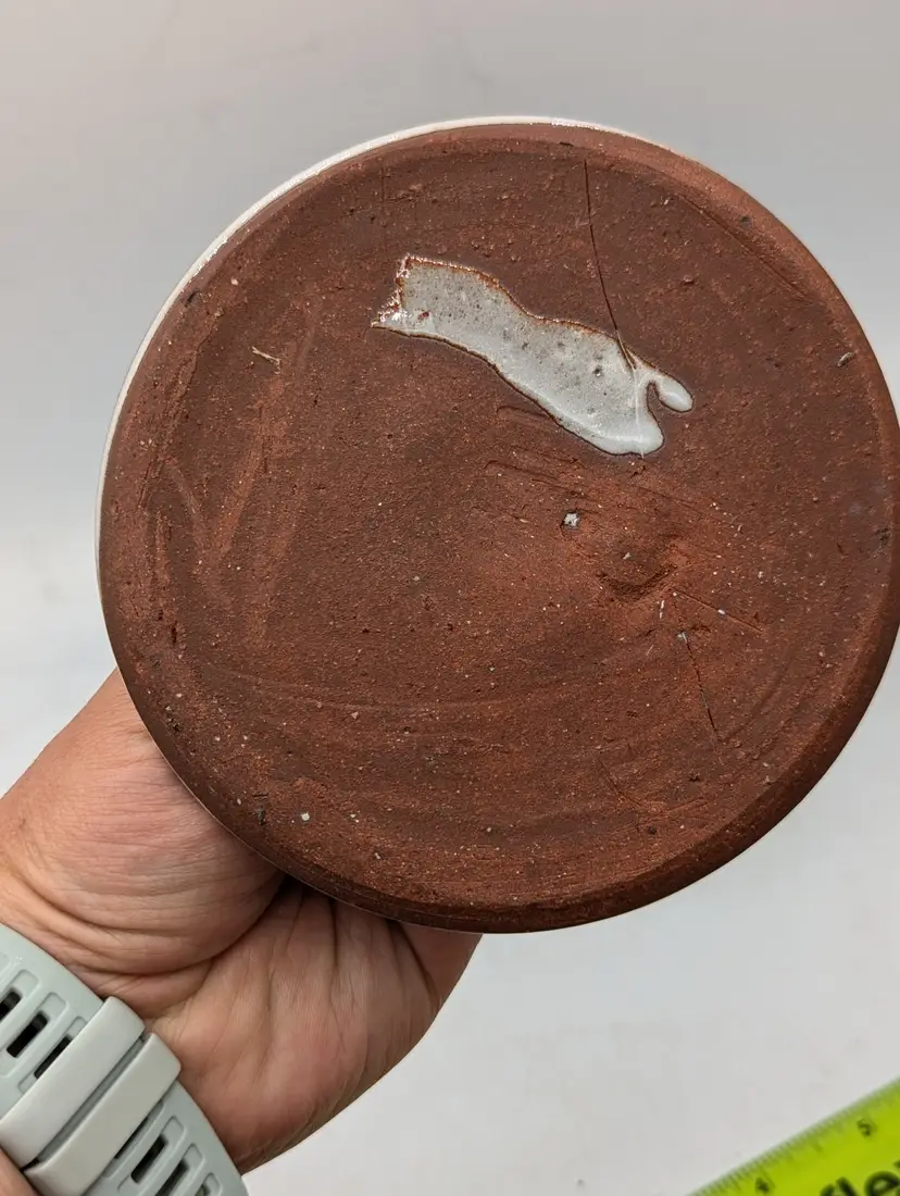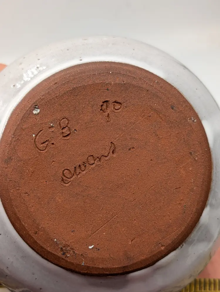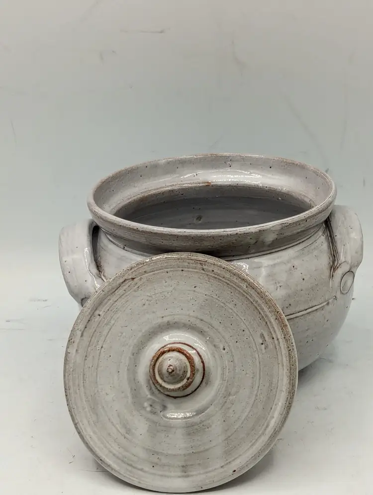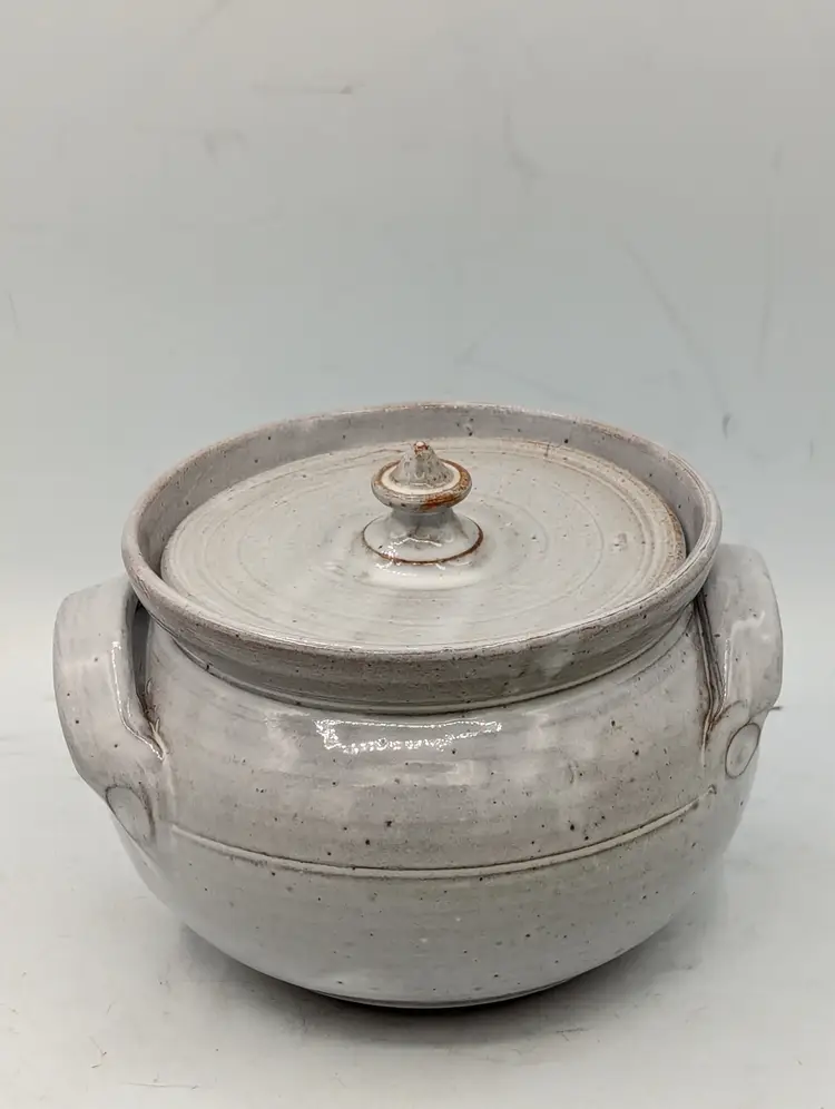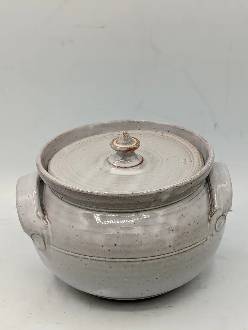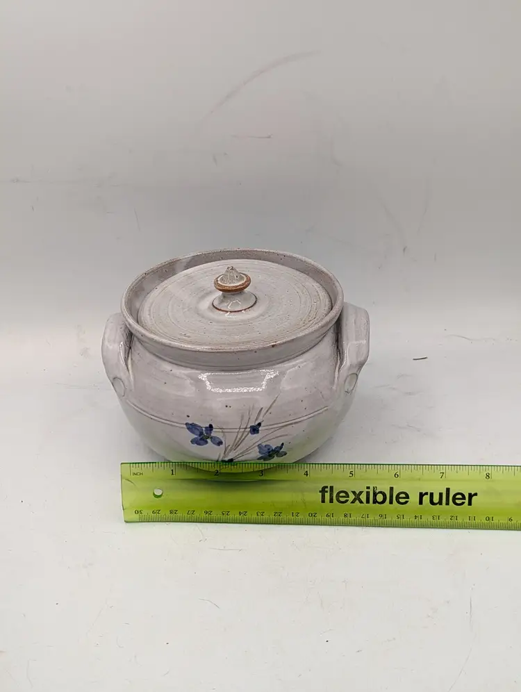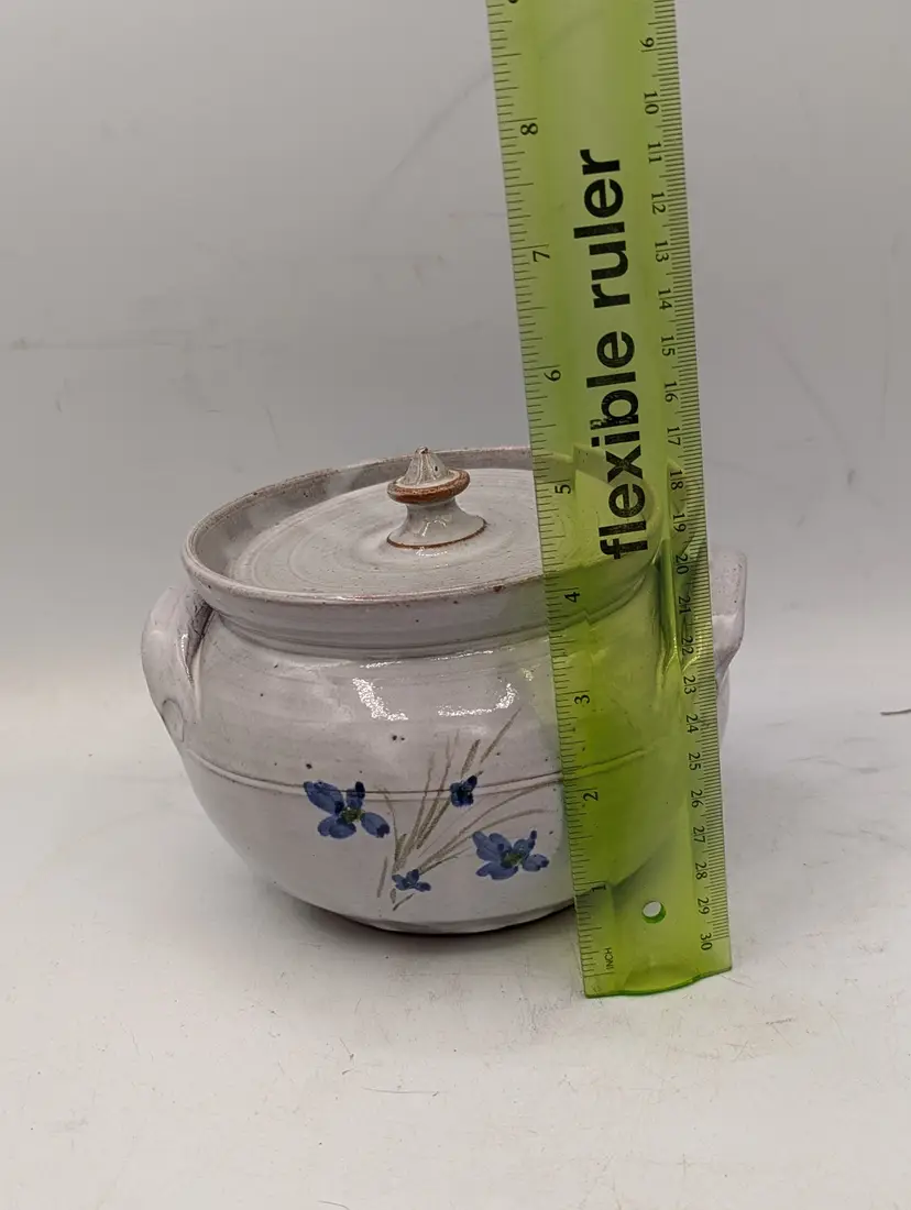 Maker: Original Owens Pottery (Seagrove, NC) Artist: Signed "G.B. 90" (Gary Boyd Owens, dated 1990) Pattern: Hand-painted blue flowers with green stems on a speckled cream redware base. Design: Hand-thrown lidded vessel with two applied handles and a pointed finial on the lid. Dimensions: Approximately 5" tall (with lid) x 7" wide (handle to handle). Condition: Excellent vintage condition. No chips, cracks, or crazing visible. (Note: The unglazed red clay bottom shows a "G.B." signature and a "90" date stamp, typical of authentic Seagrove pieces