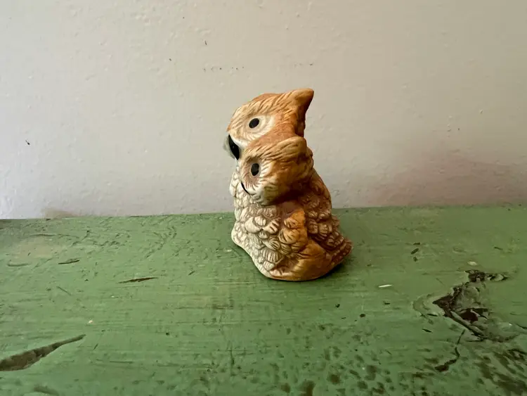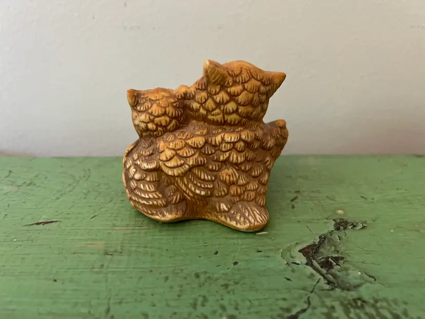 Vintage Owl Figurine. Ceramic Porcelain wise owls on a branch. bisque ceramic 2.75" tall Good condition.