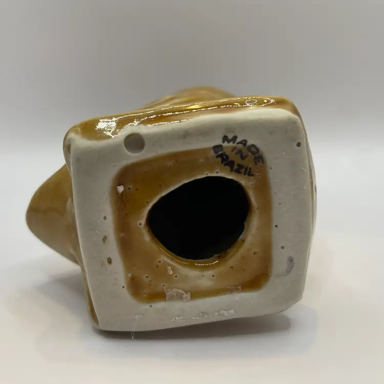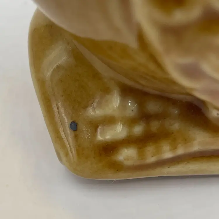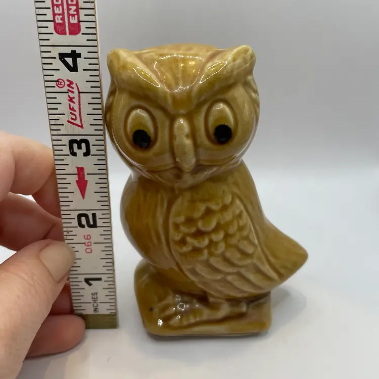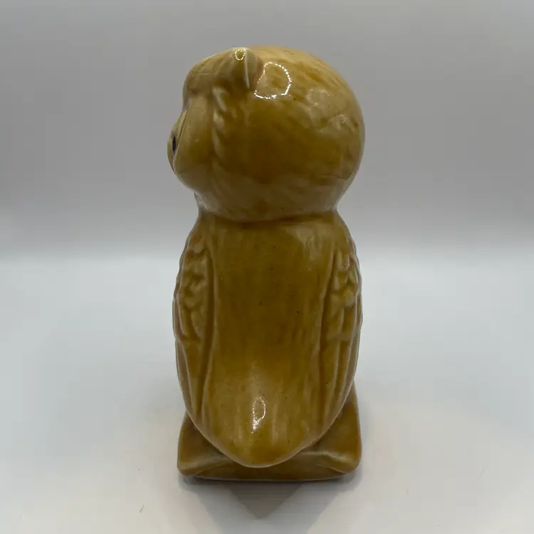 Cute 70's owl with tan glaze. A small dot of black glaze by foot as seen in photo, otherwise perfect condition. 4" tall by 2"wide by 3" deep
