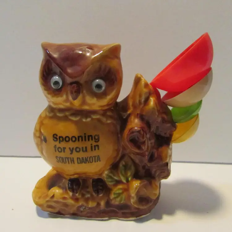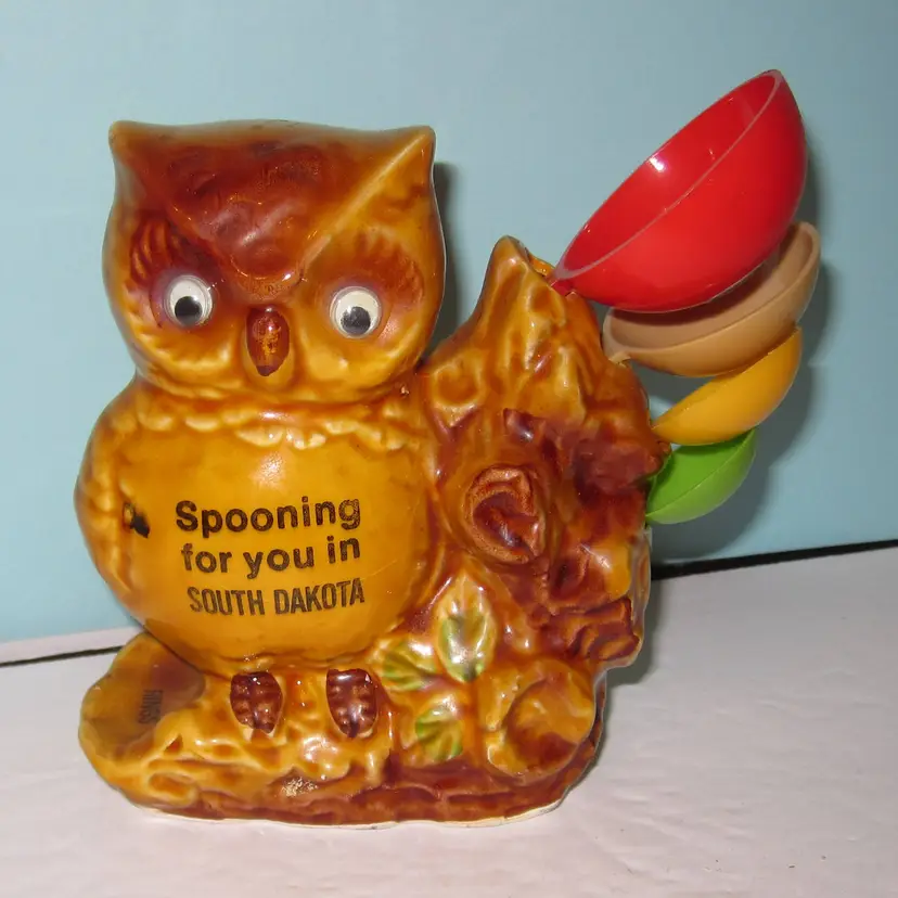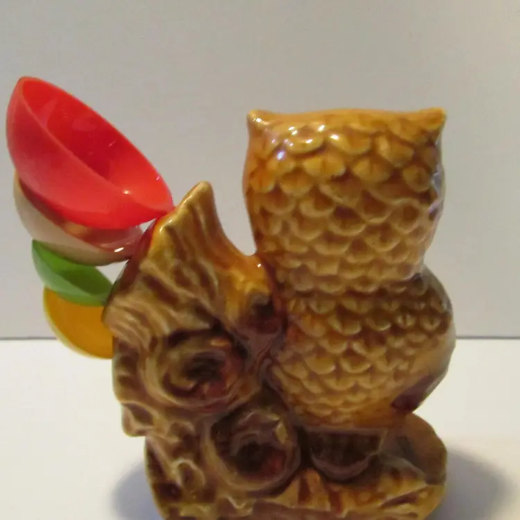 This adorable owl holds your measuring spoons and has a spot to place your rings while in the kitchen. It is about 4 1/2" x 4 1/2" x 2". This is shipped from a smoke free home. Thanks for looking!