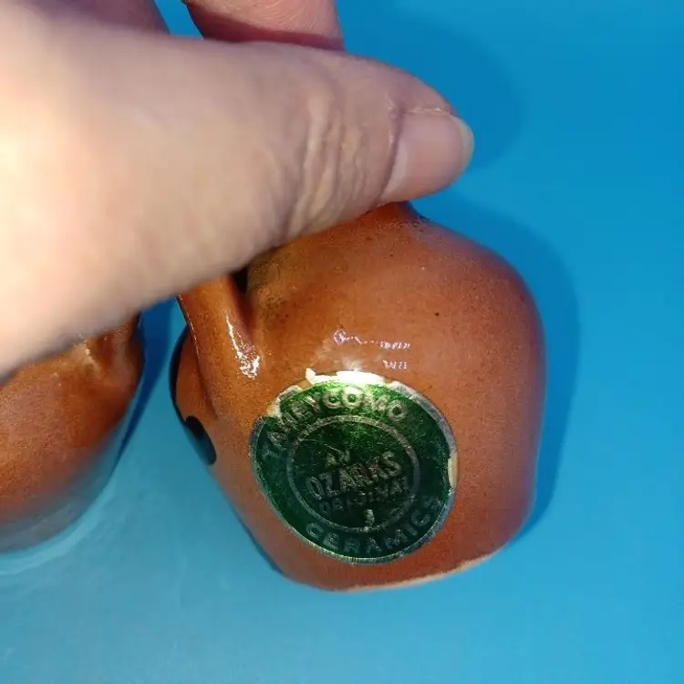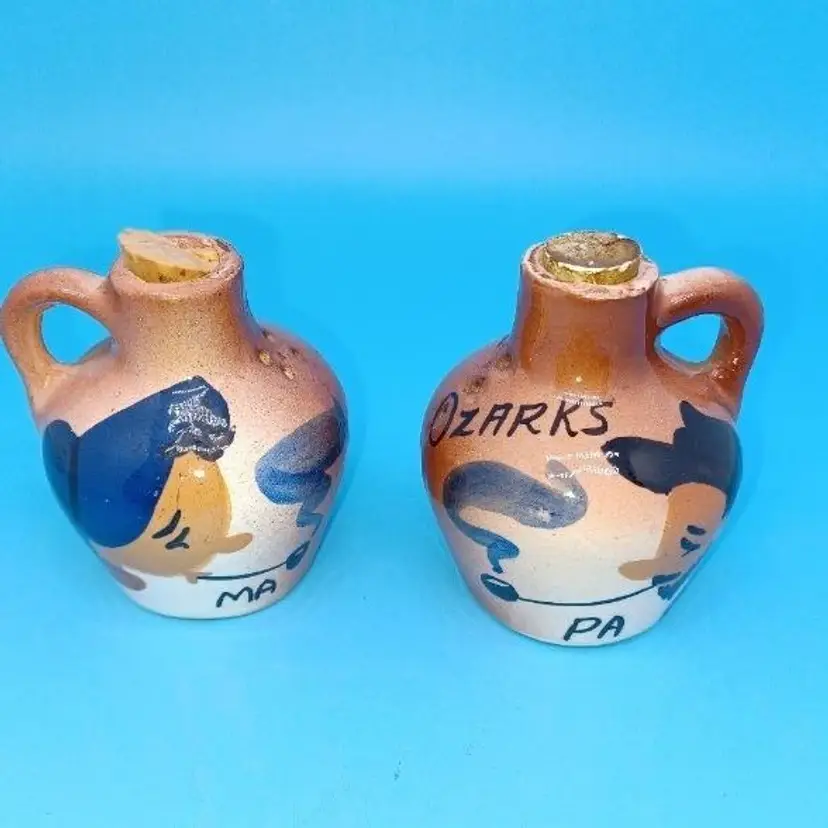 Hand painted Jugs from "The Ozarks" depicting a "Ma" and "Pa" smoking pipes. Super cute little couple! Broken Cork stoppers. Never used Have the original Taneycomo Ceramic Ozark Original green & gold foil label