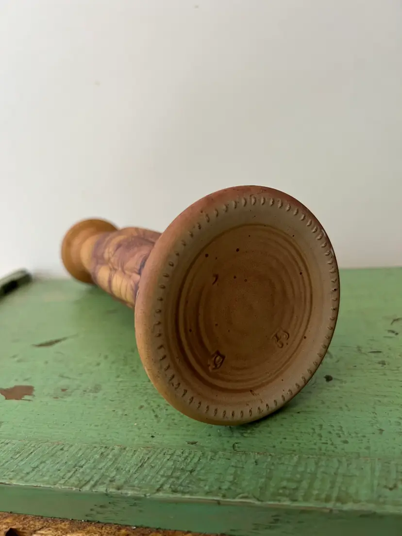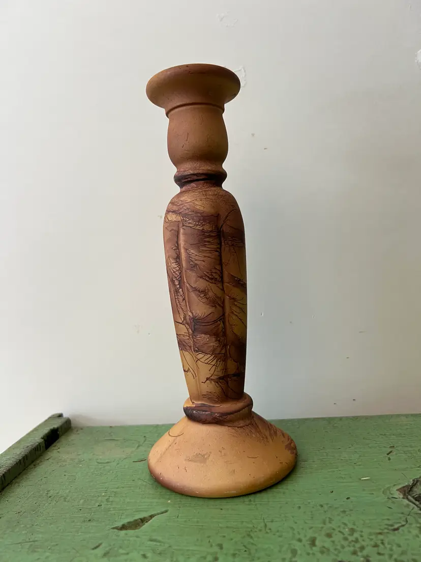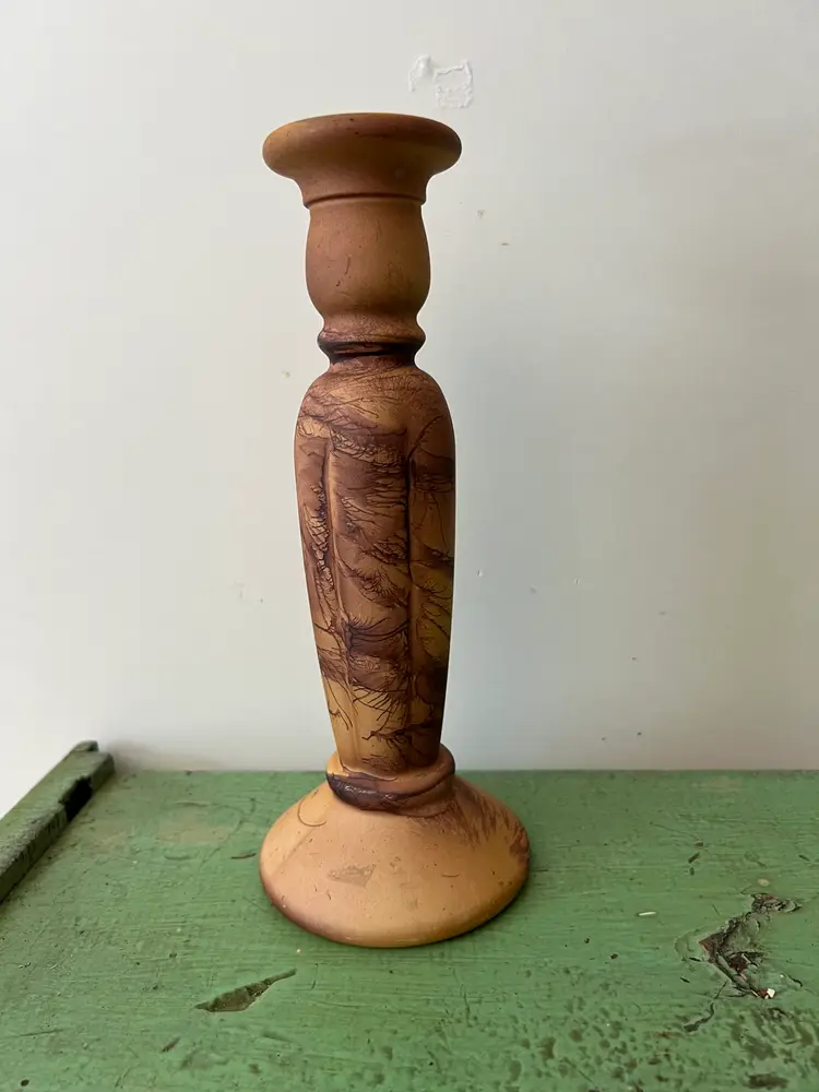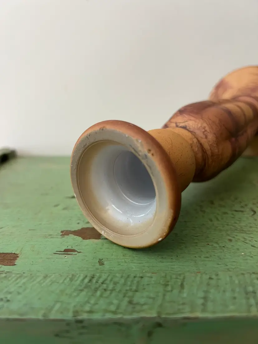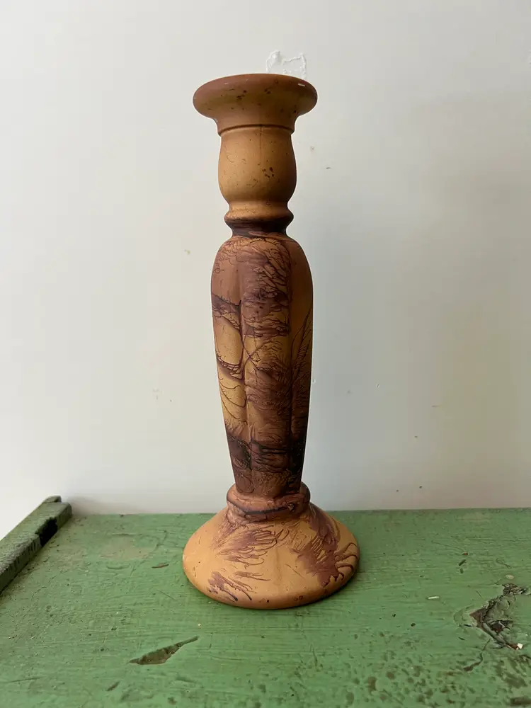 Vintage painted/ glazed glass candle stick holder. 9" tall Splatter/ sponge paint for a great faux wood or marble look. Good vintage condition