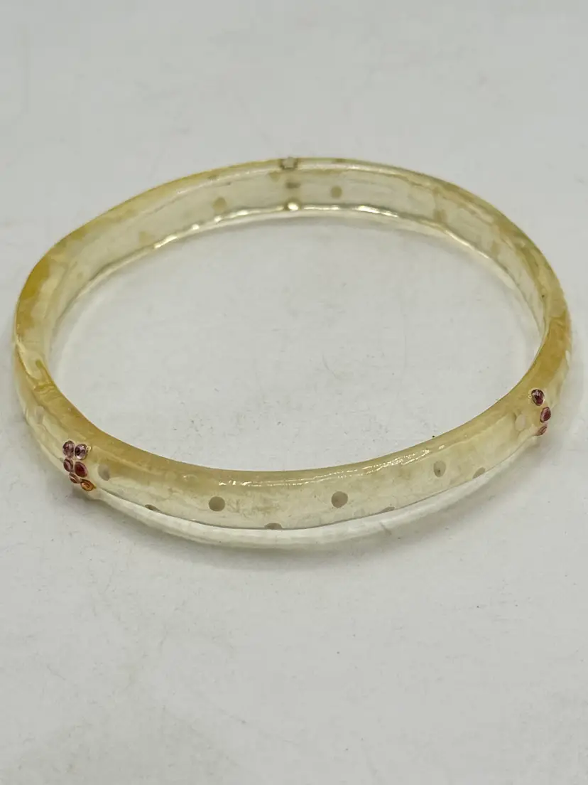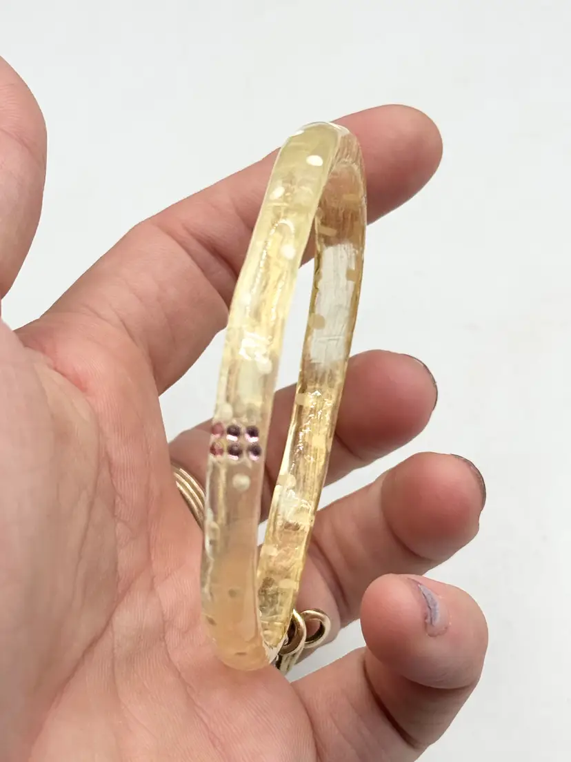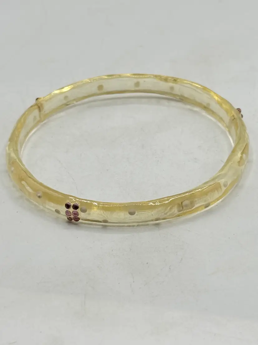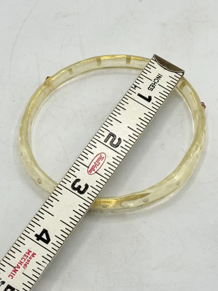 Vintage painted pink dot rhinestone lucite bangle bracelet. Clear lucite bangle bracelet with painted dot spot design and pink rhinestones. MN54GH.