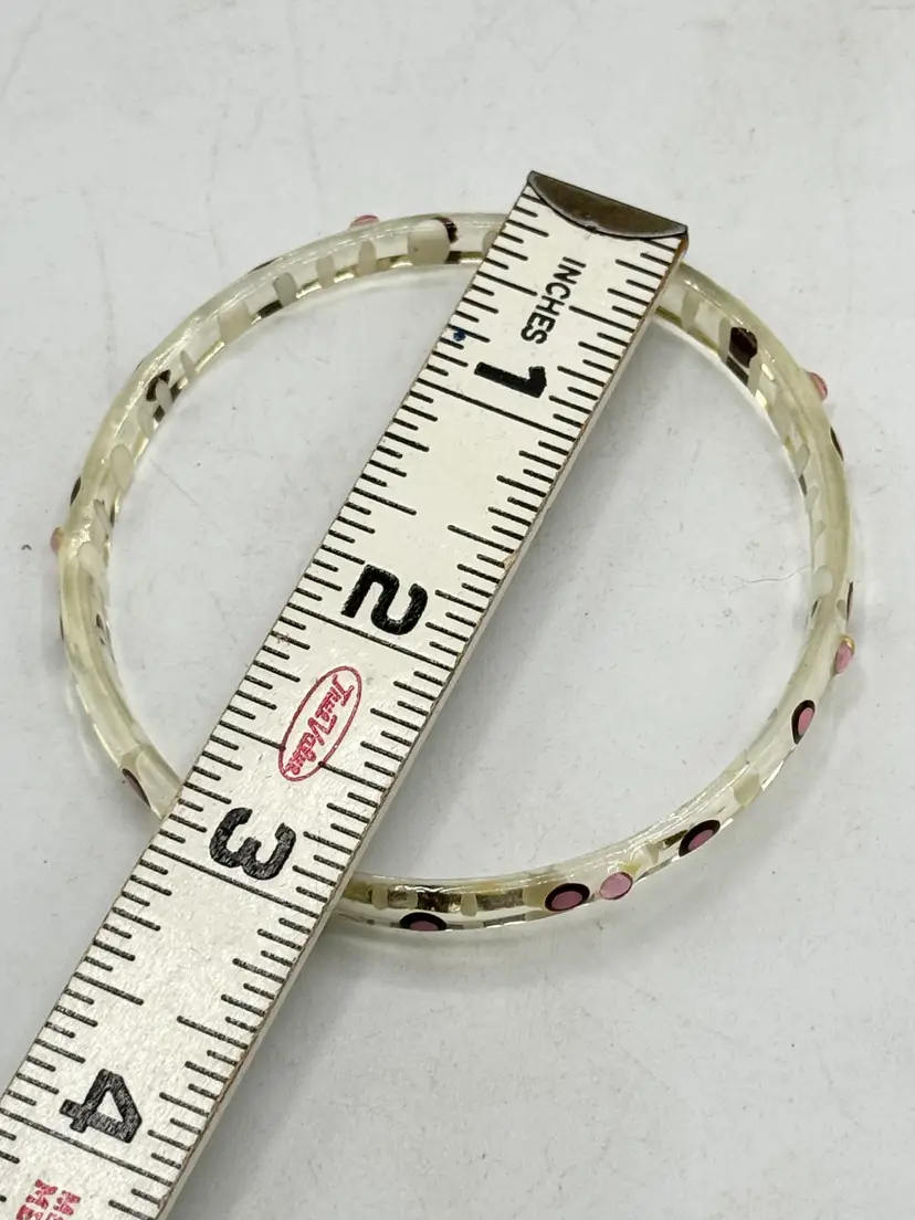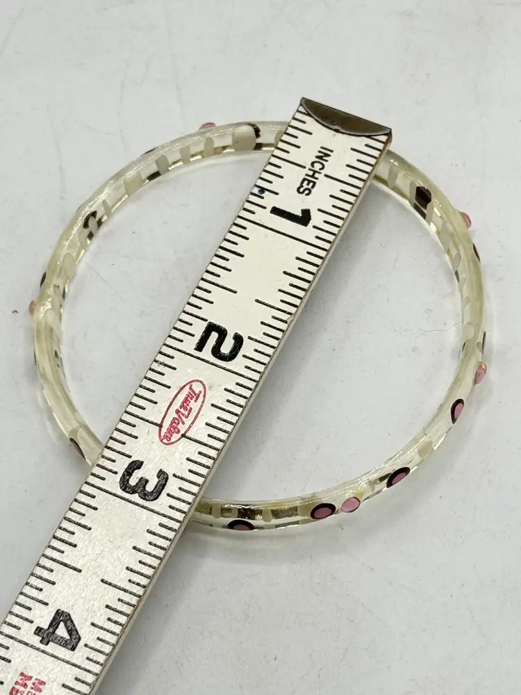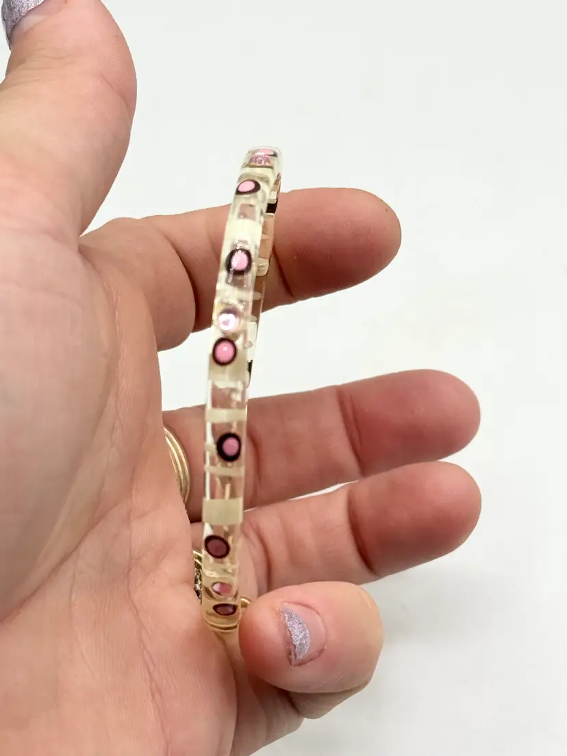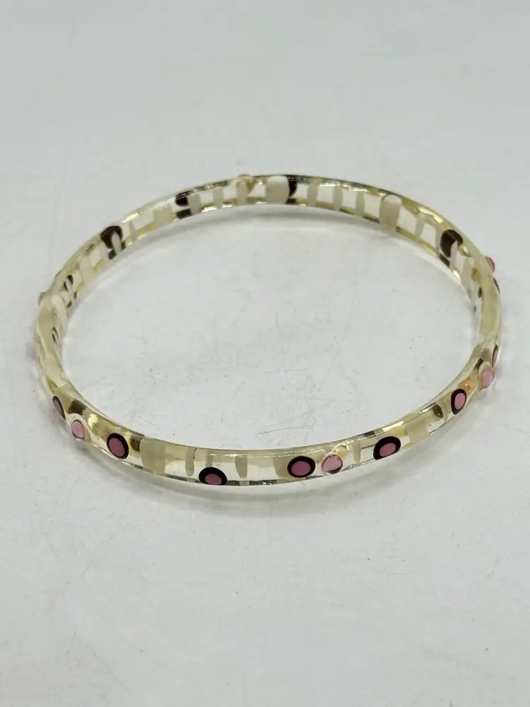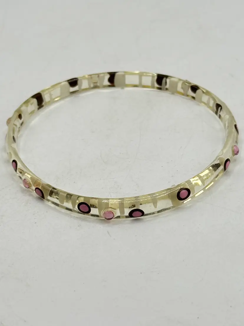 Vintage painted pink rhinestone Lucite bangle bracelet. Clear lucite bangle bracelet with painted pink design and pink rhinestones. MN54HG.