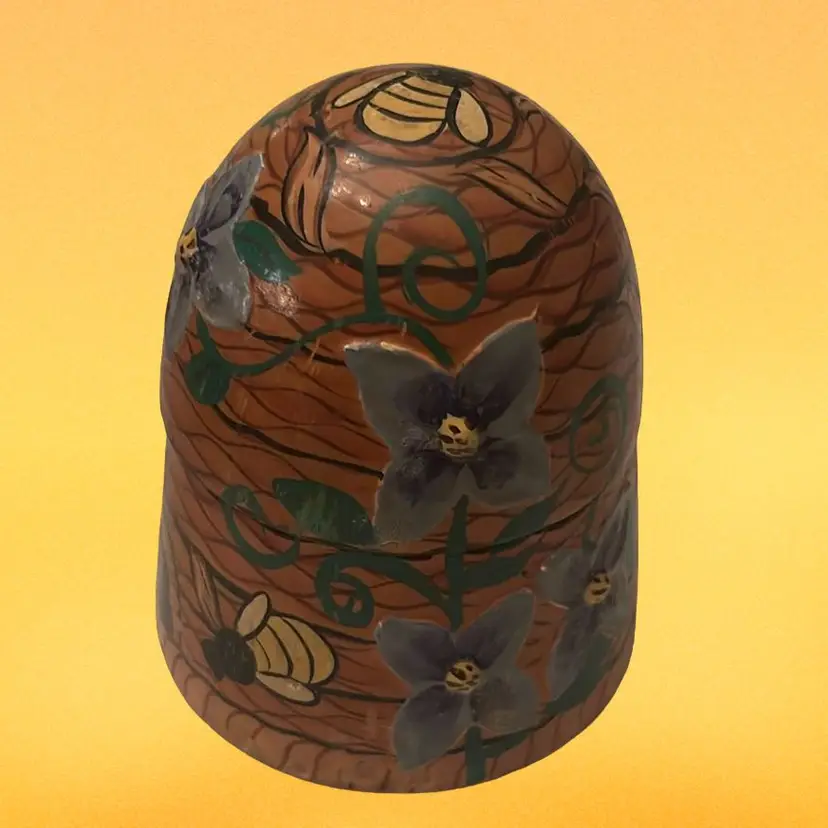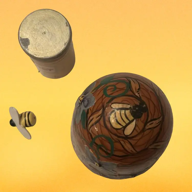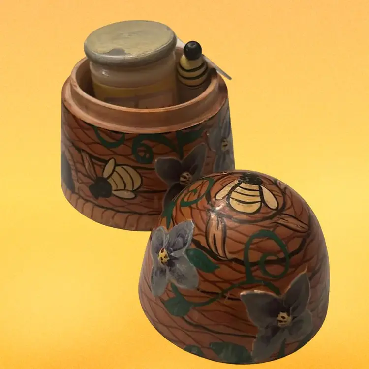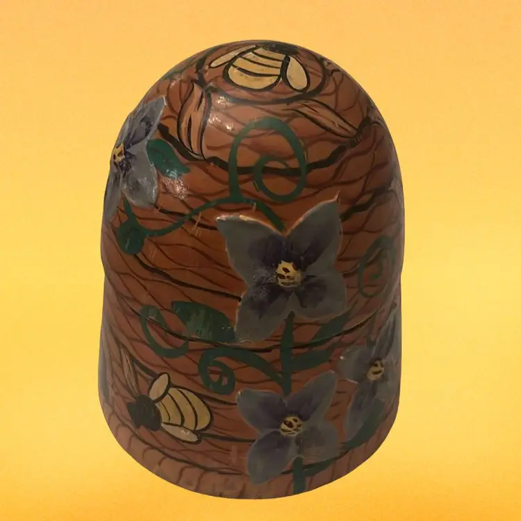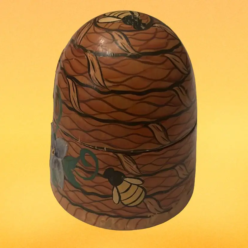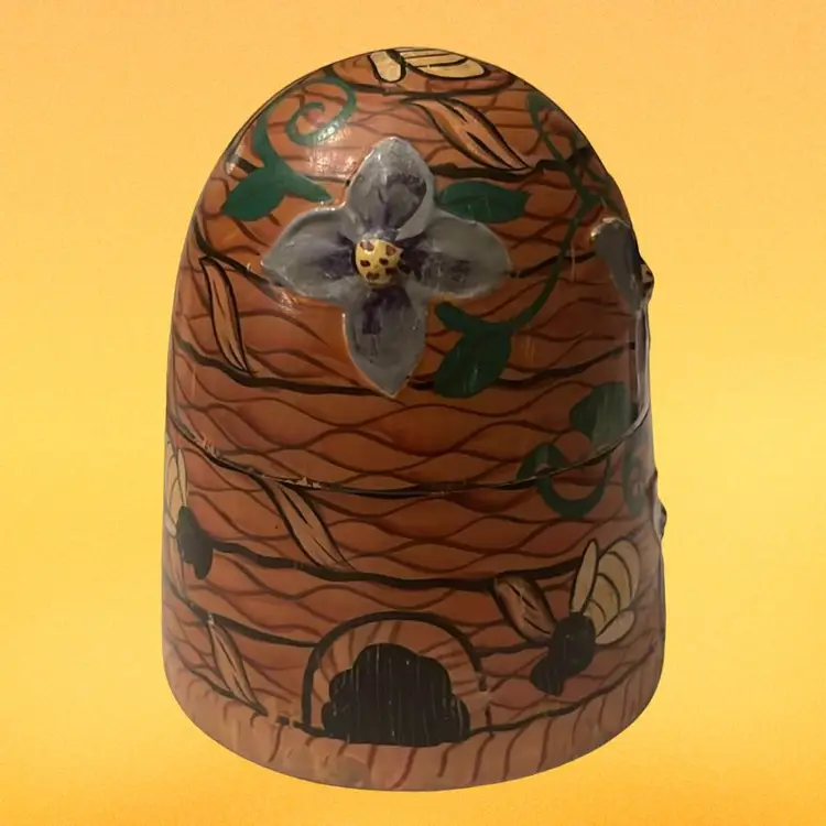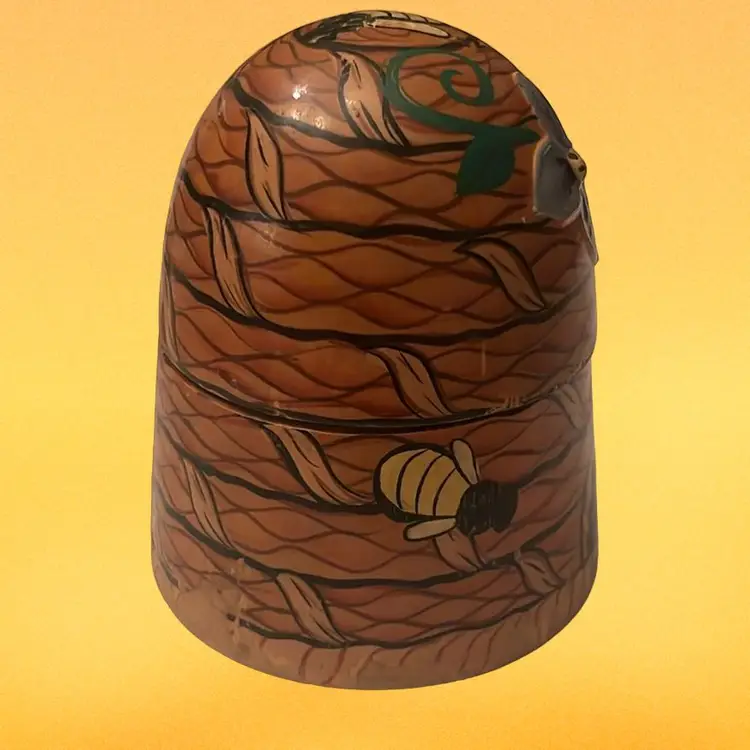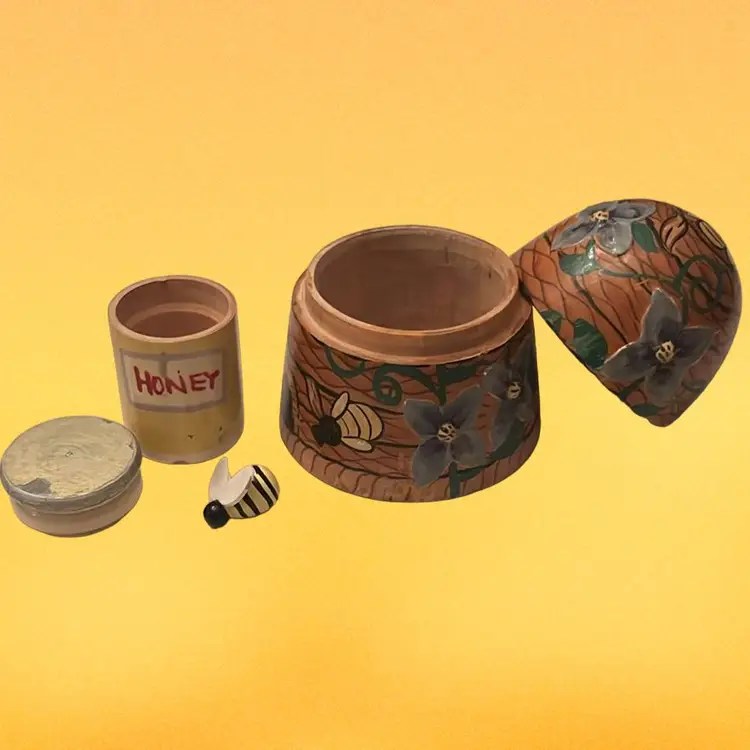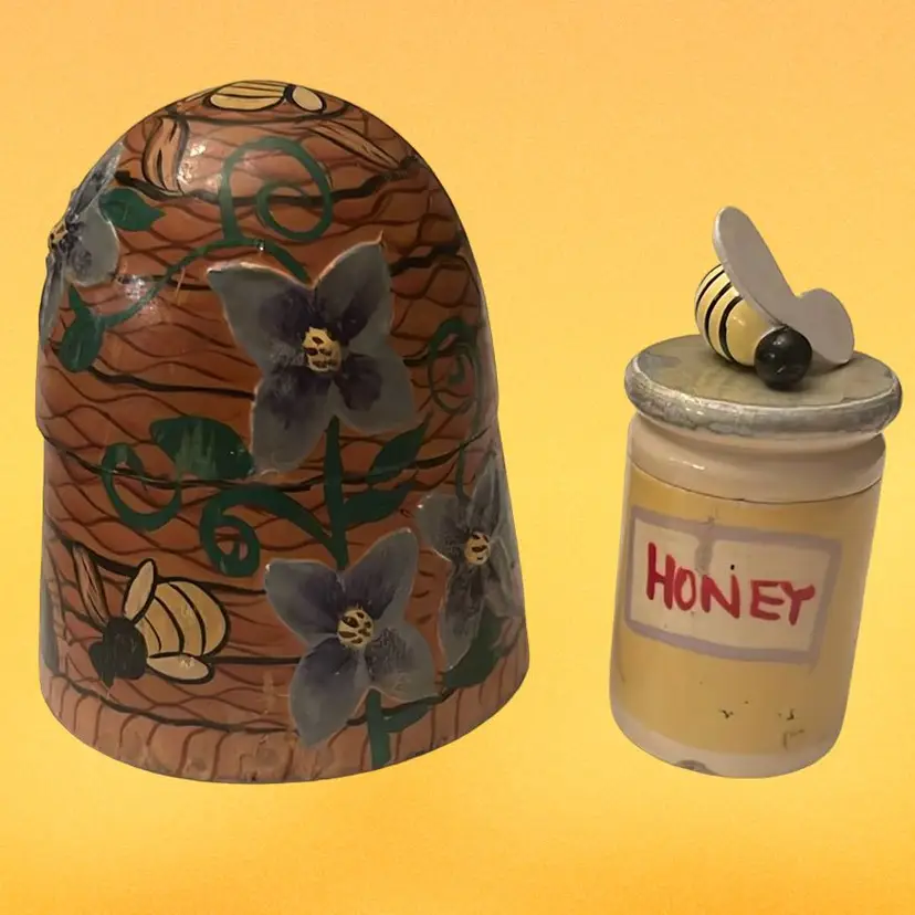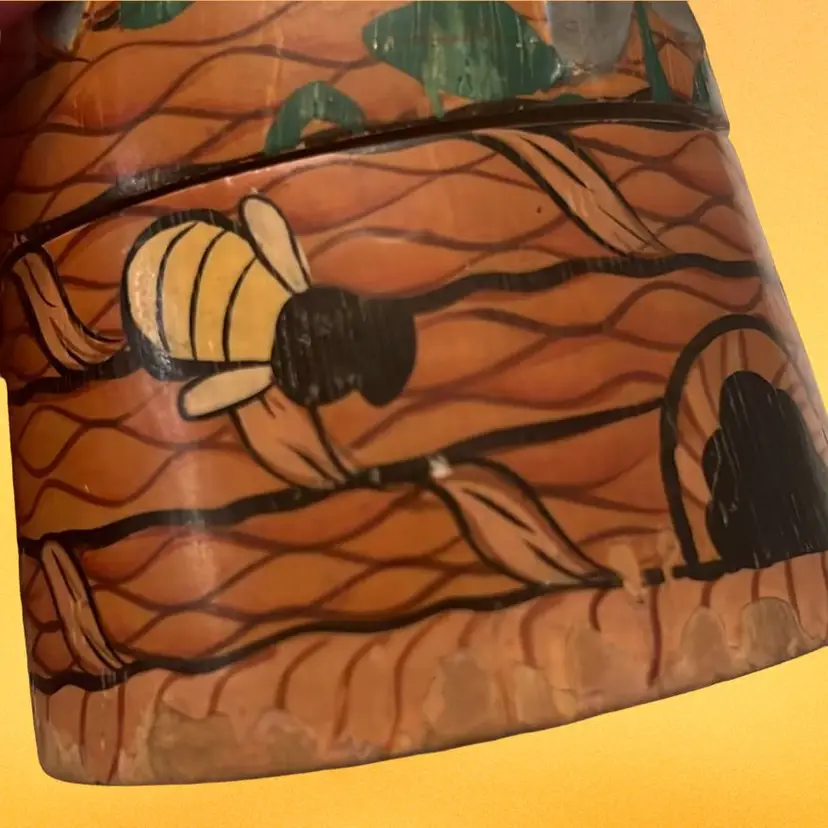 Unique and so sweet wood carved hand painted with flowers, vines and bees. Inside beehive is a honey pot and a bee π!