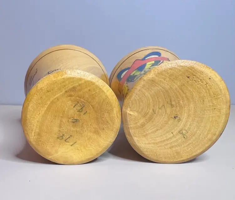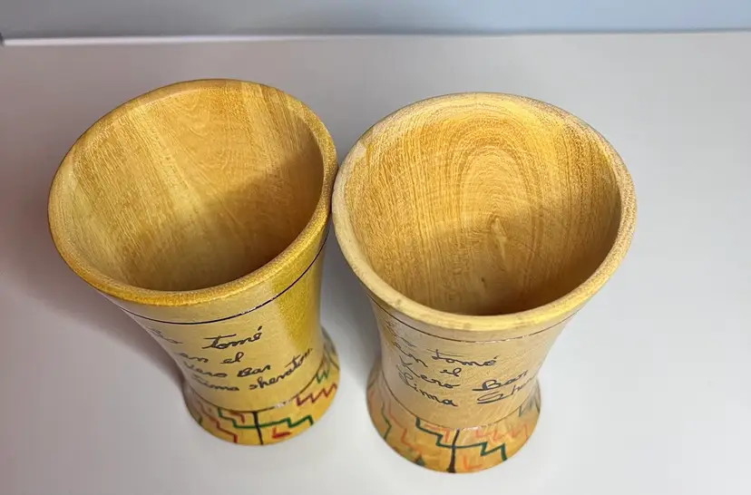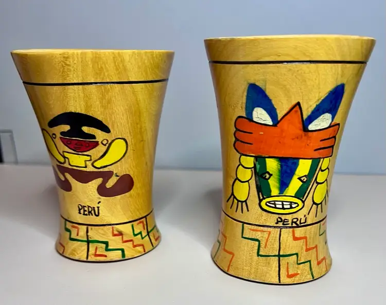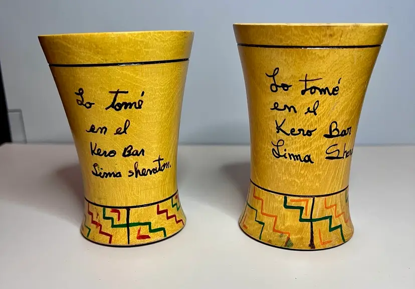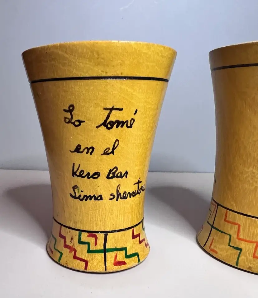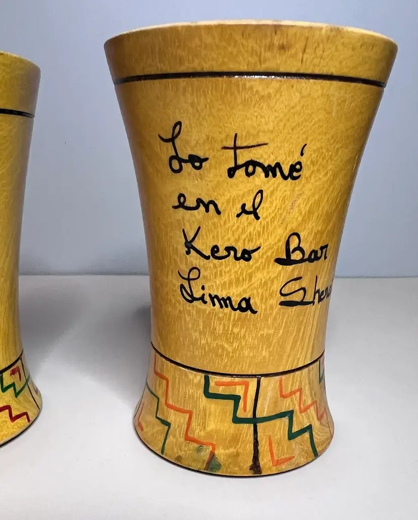 Pair of handmade wooden drink vessels from the Kero Bar in the Sheraton Hotel in Peru. The hotel is permanently closed.