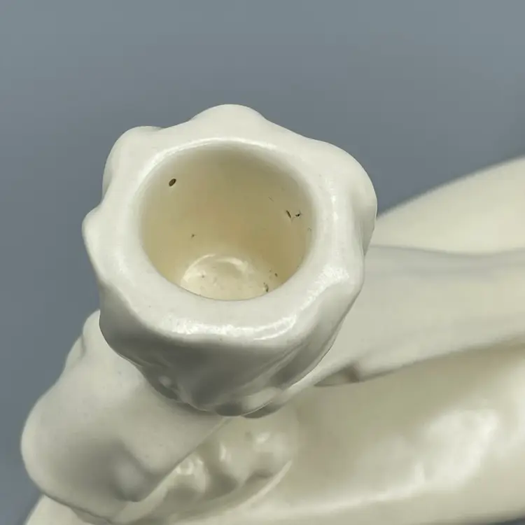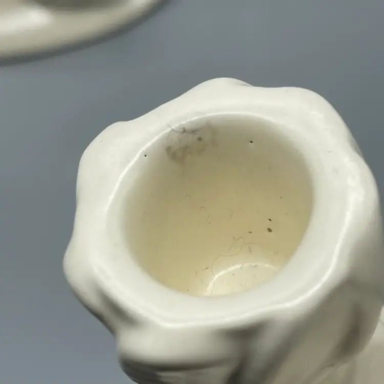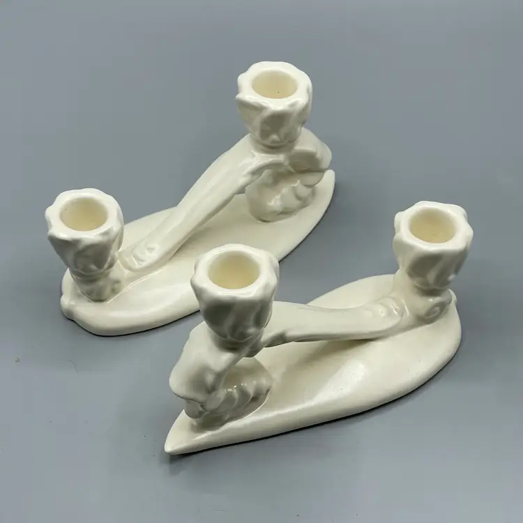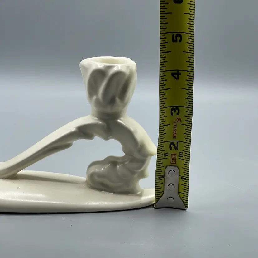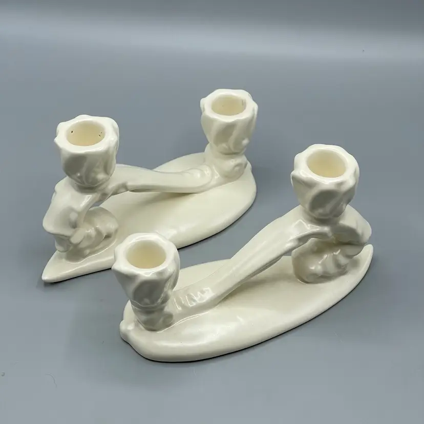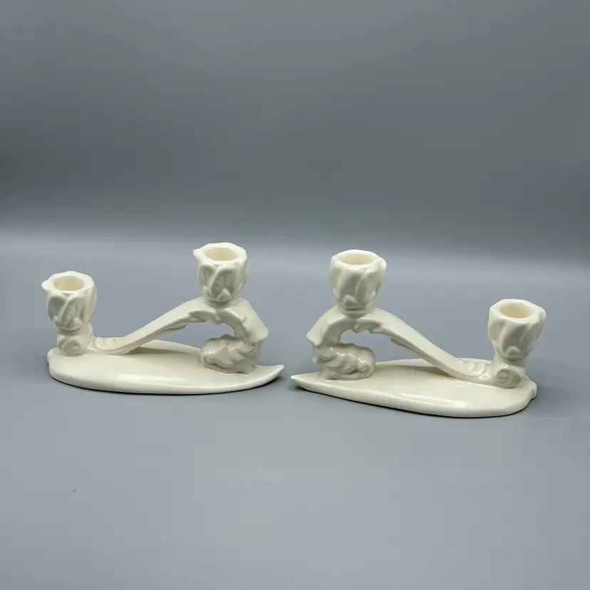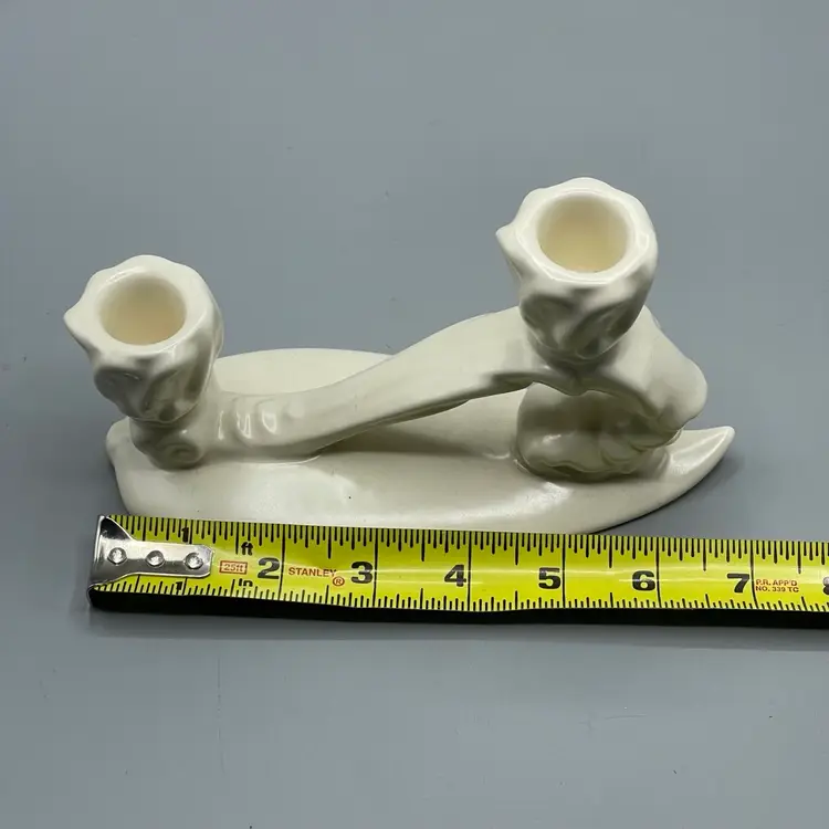 This classic pair of double taper candle holders have no chips but there is a very small crack on the edge of one candle cup that is possibly a stain spot of crazing. The candle holders are about 7 inches long and 4-1/4 inches tall each.