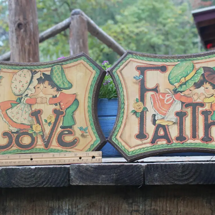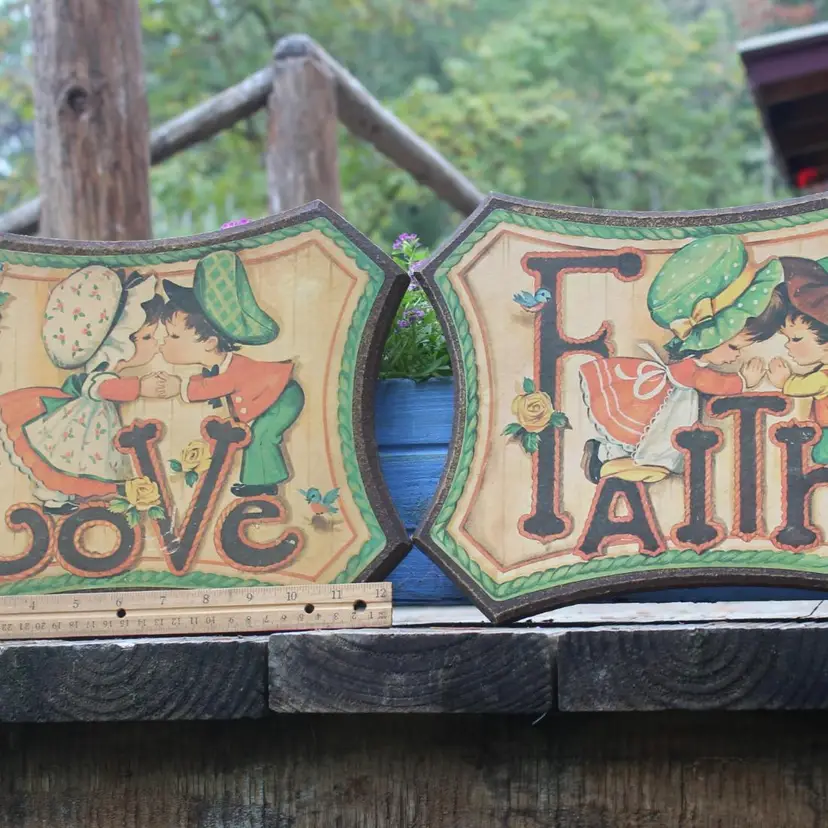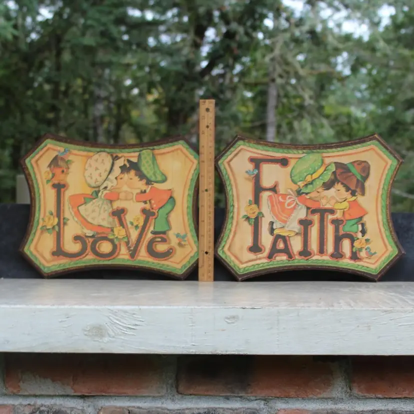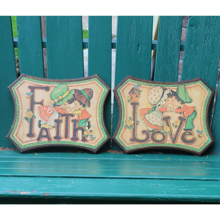 Pair of 2 vintage Faith / Love themed wooden wall plaques