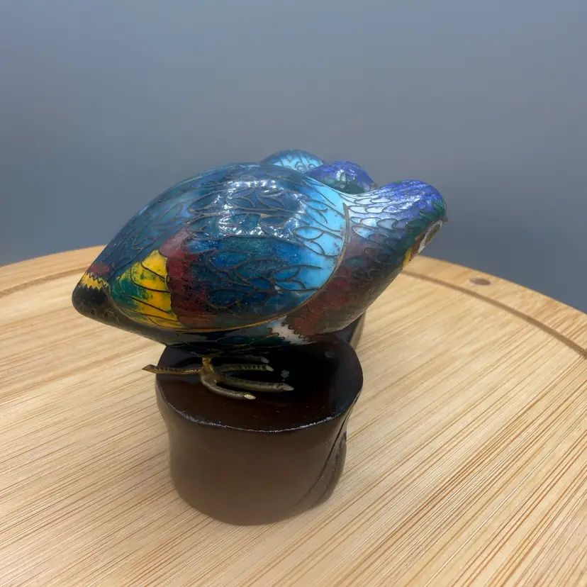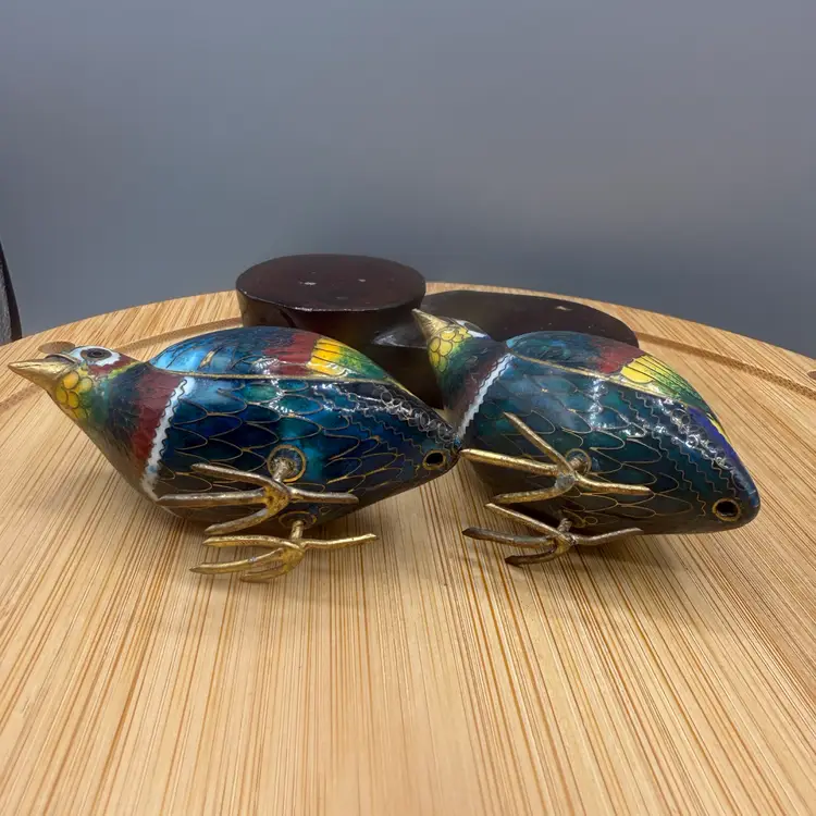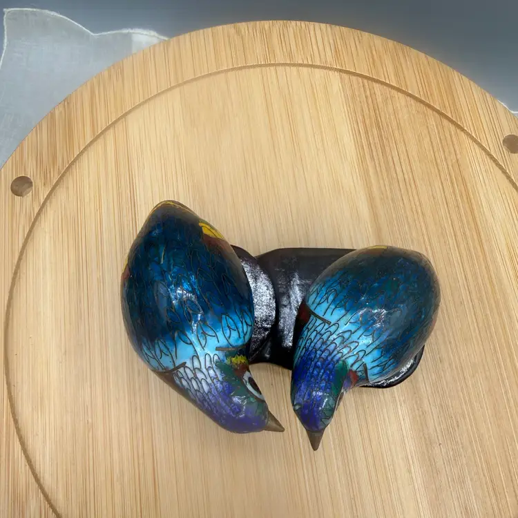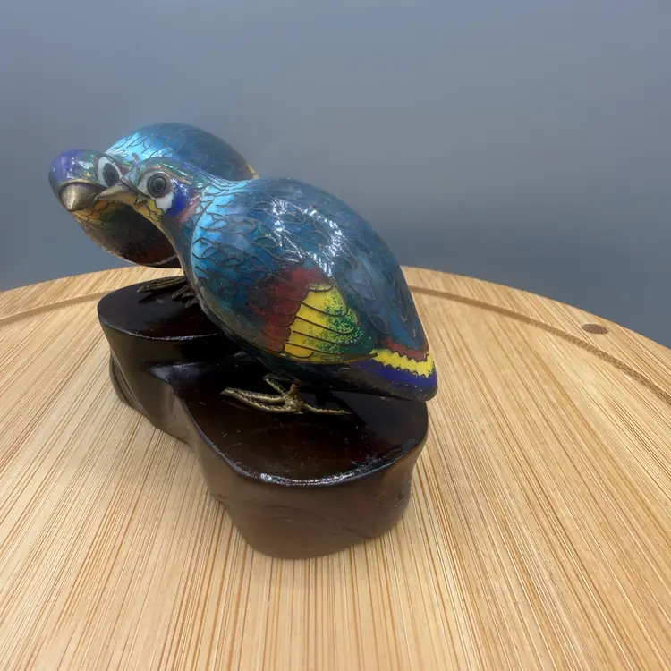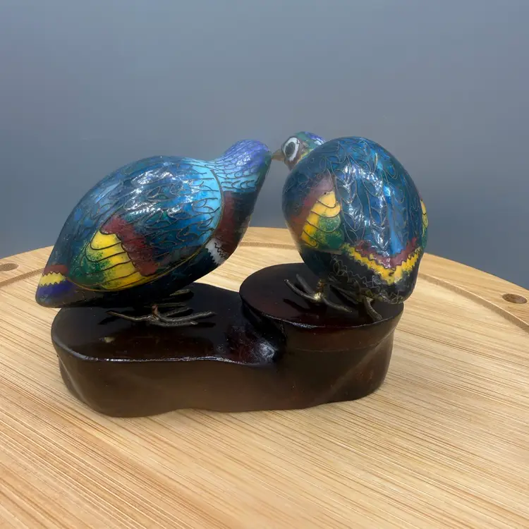These petite birds are a wonderful example of mid-20th-century craftsmanship, featuring vibrant "thousand-flower" style enamel work. They come complete with their original, custom-fitted carved wooden display stand. Excellent condition, not chipped, cracks or repairs.