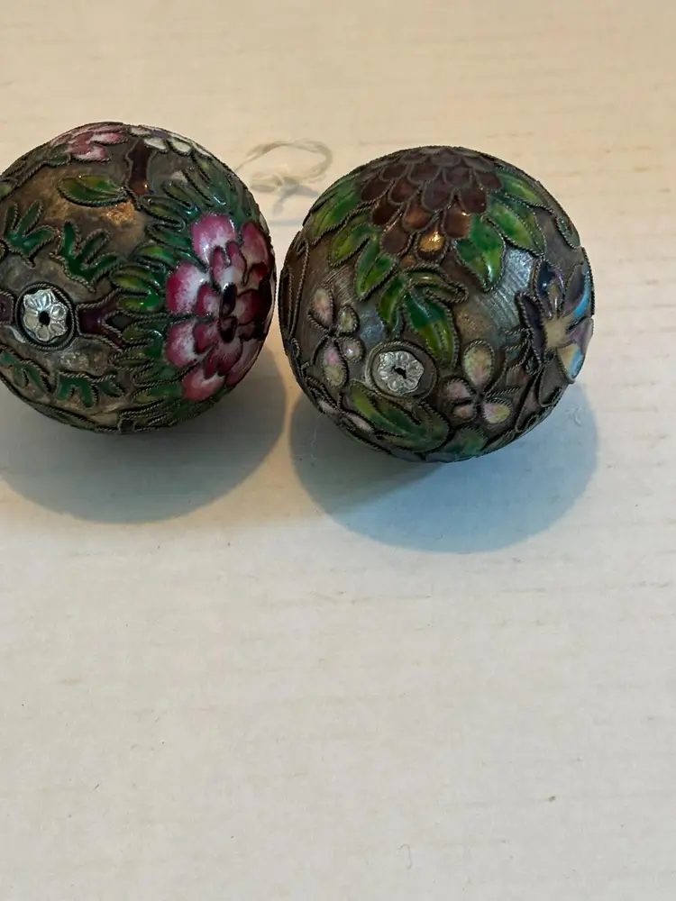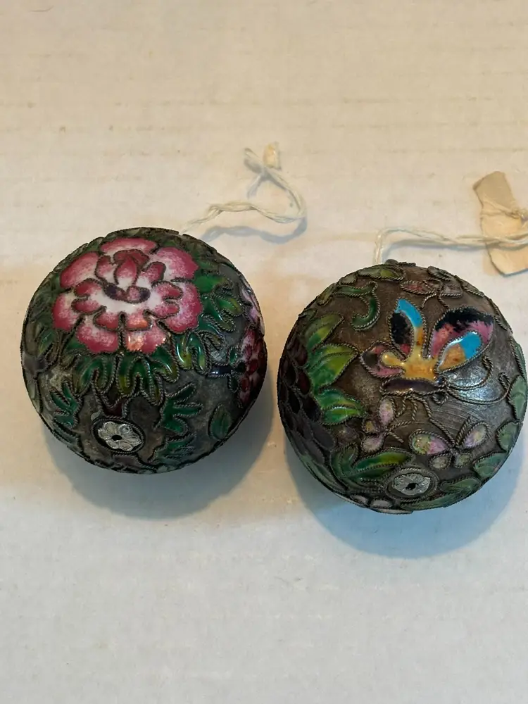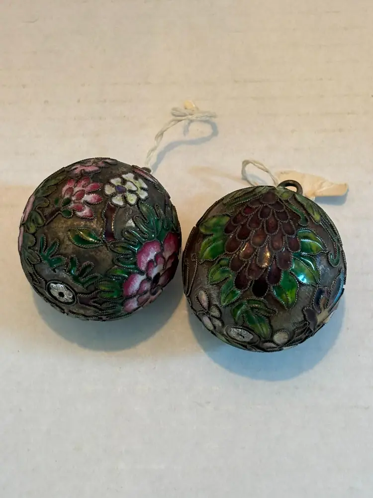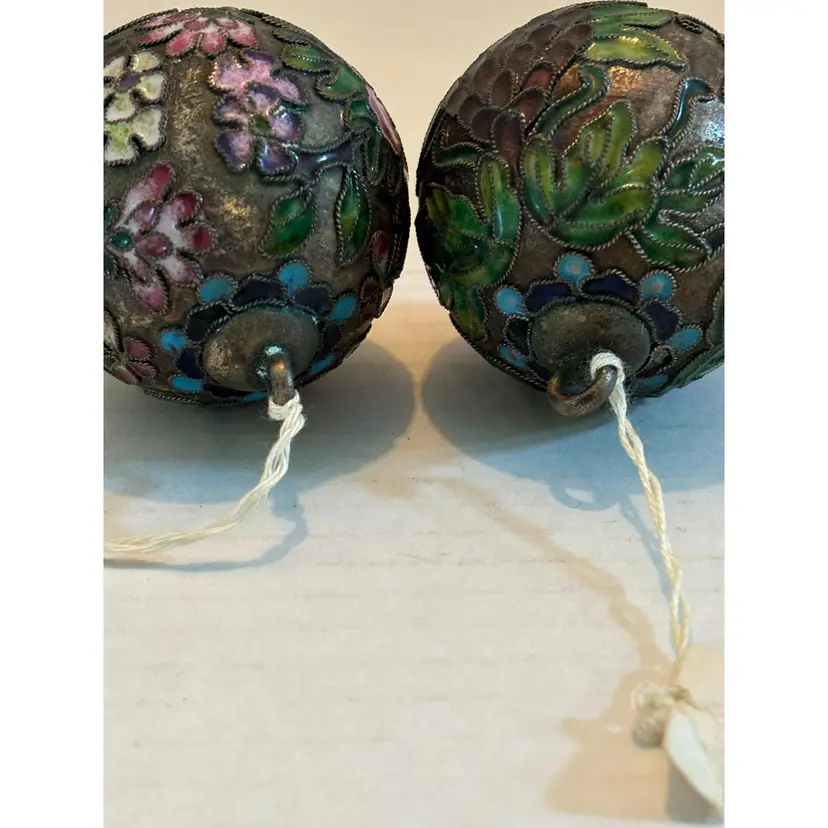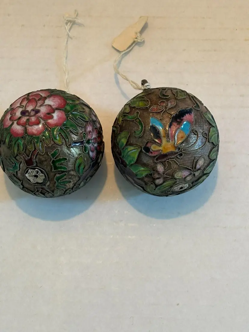 Add a touch of vintage charm to your collection with this beautiful pair of cloisonne enamel ornaments. These small round ornaments feature a stunning floral pattern and a bird with a colorful palette that will brighten up any space. Perfect for all occasions, these ornaments will make a great addition to your holiday and seasonal collection. Crafted from high-quality enamel, they are durable and long-lasting. Whether you're a collector or just looking for a unique gift, this vintage pair of ornaments is sure to impress. Measures 2in across The seller is willing to negotiate the price.