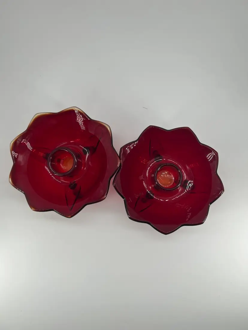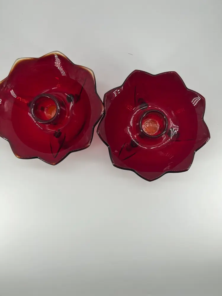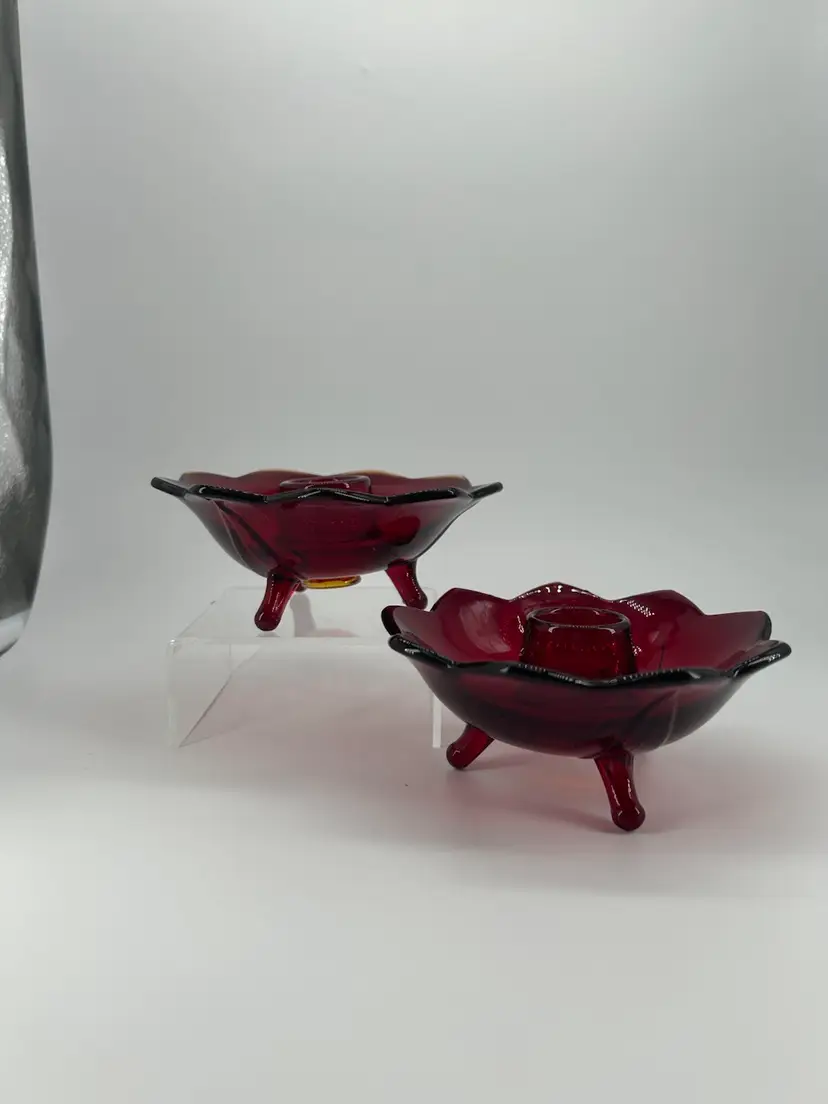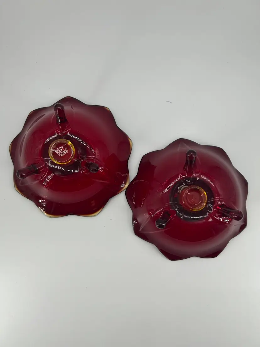 These are Fenton ruby red candle holders. The center of the candle holder glows orange. They are tri-footed. They stand 2.75 inches tall and 4 inches across the top. There are no condition issues.
